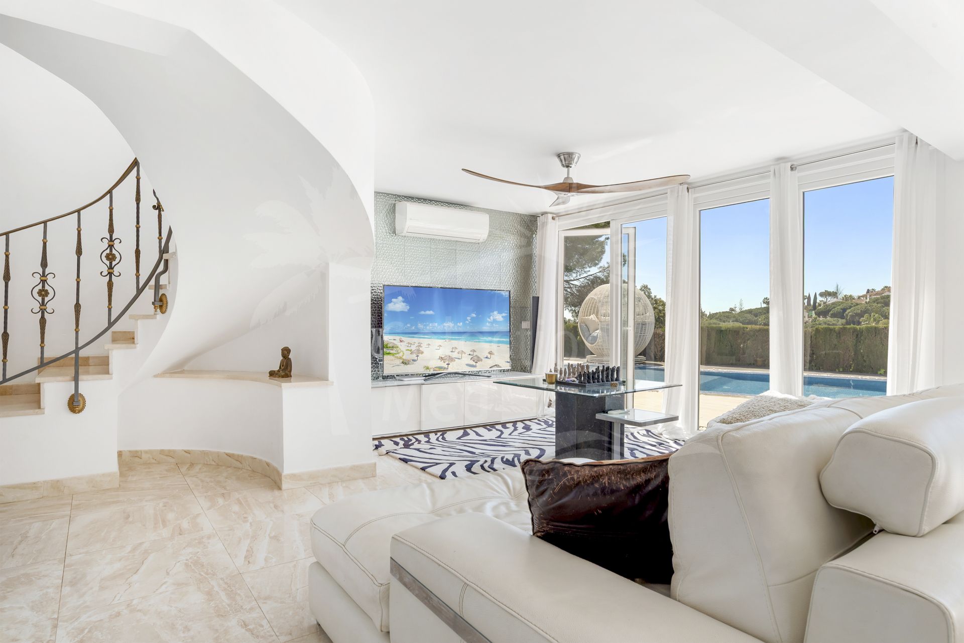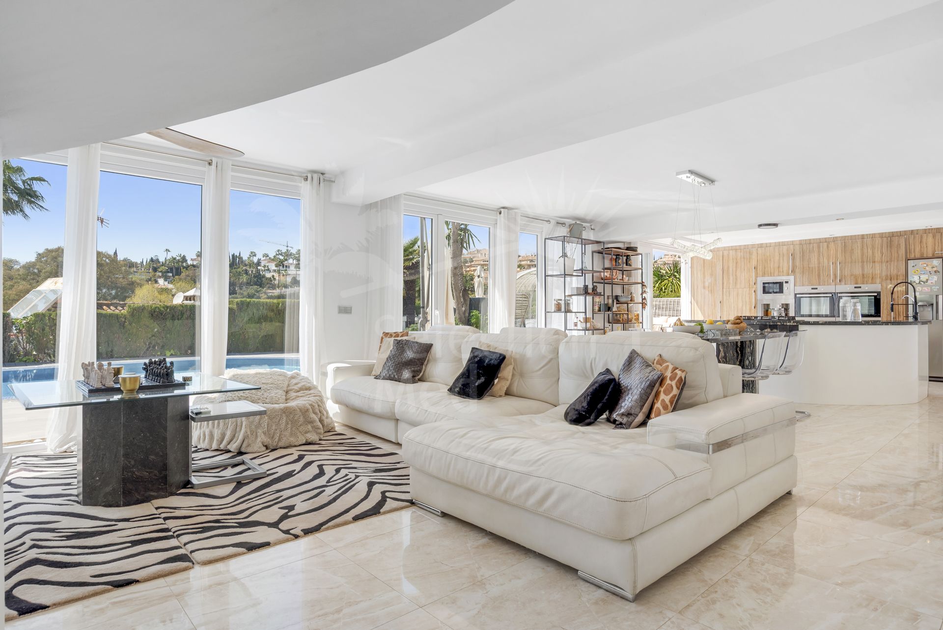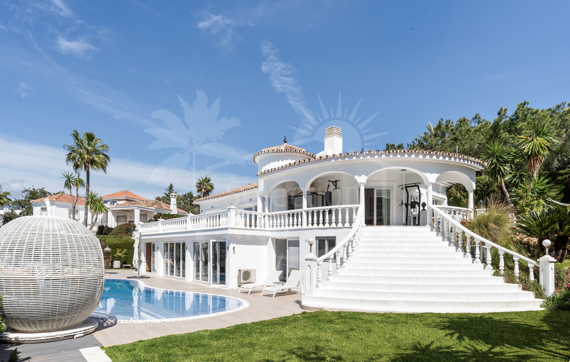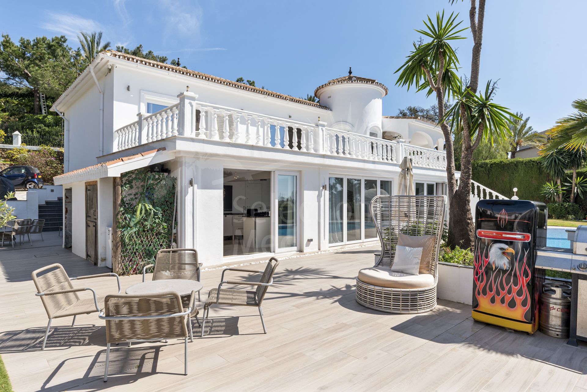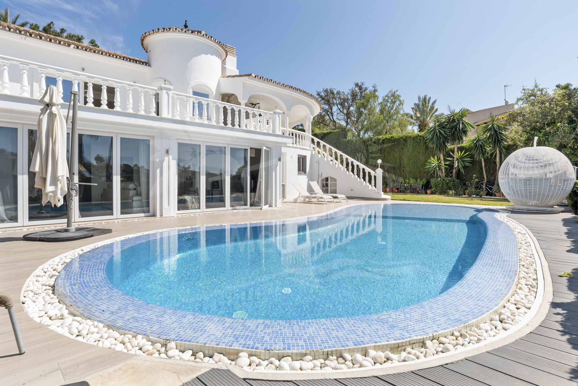 Esta hermosa villa ha sido reformada con interiores modernos, preservando su encantador exterior andaluz, creando una mezcla perfecta de estilo tradicional y confort contemporáneo. La propiedad ofrece 5 dormitorios, amplias zonas de estar, un apartamento independiente de 2 dormitorios, y un estudio independiente adicional, lo que lo hace ideal como casa familiar, para los huéspedes, o como inversión de alquiler. La cocina abierta y la habitación familiar fluyen directamente sobre la terraza y la zona de piscina a través de puertas plegables bi, creando un estilo de vida interior inigualable.