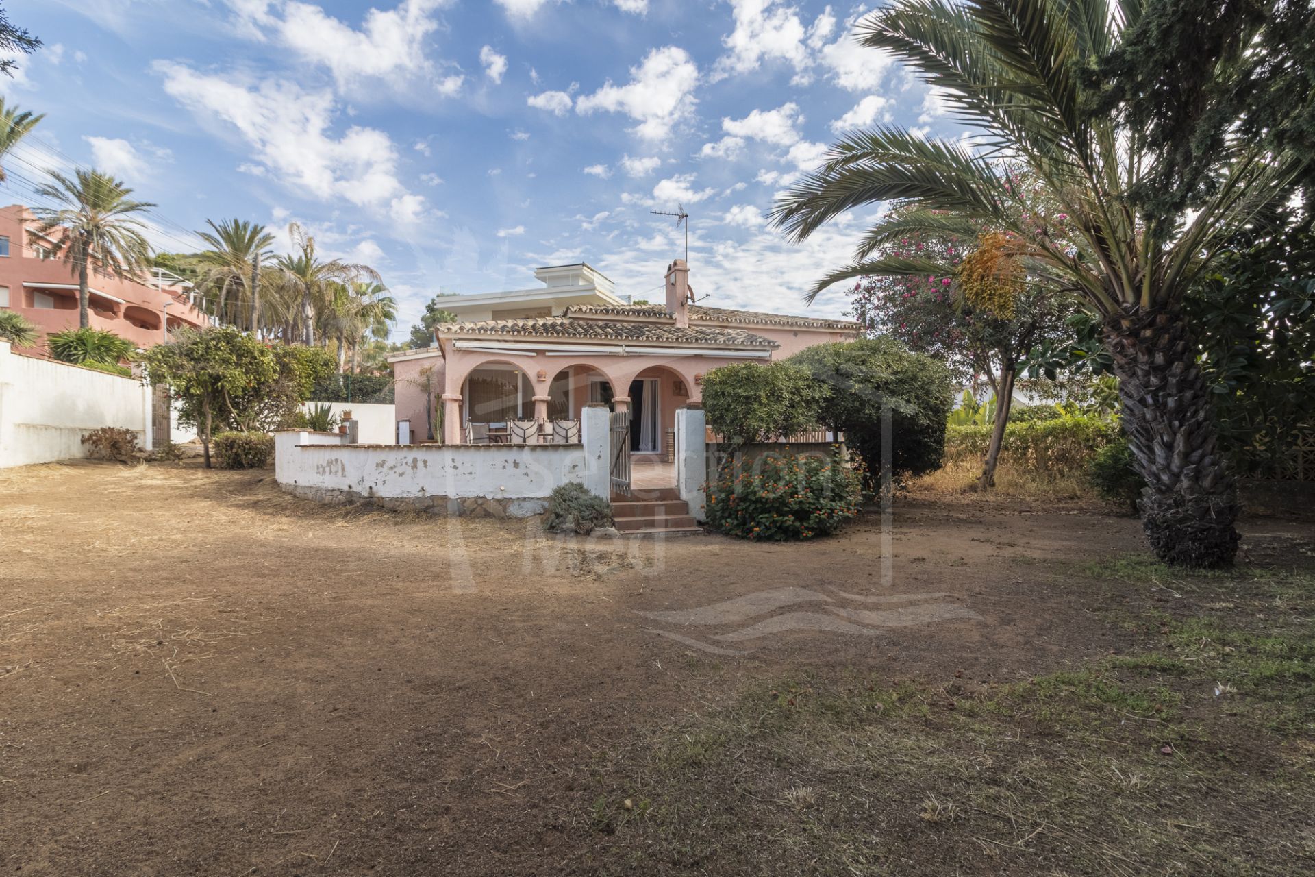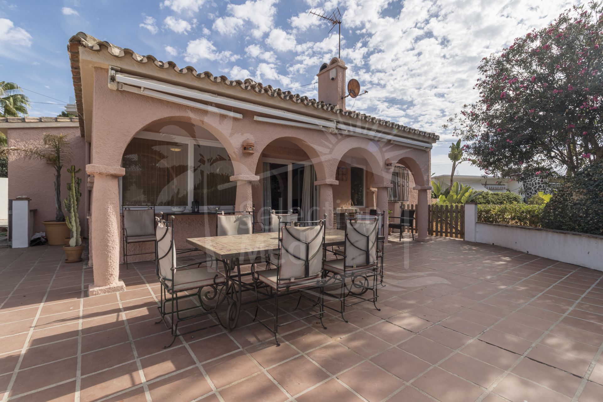 Descubre esta encantadora villa independiente situada en una de las zonas más deseadas de Marbella Este, dentro de la tranquila urbanización Costabella, en la playa.