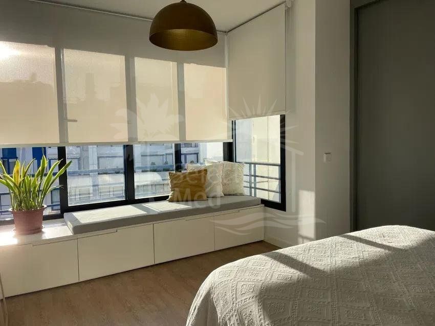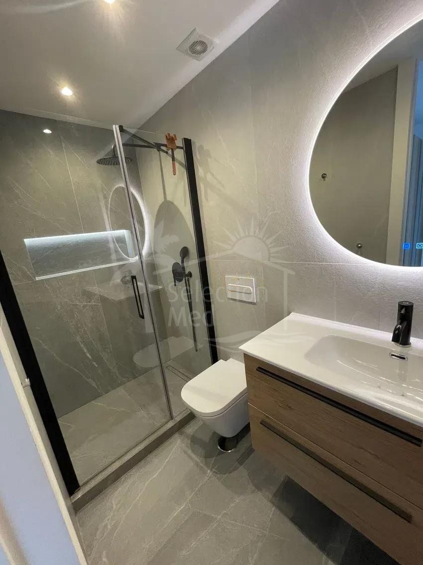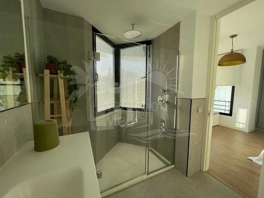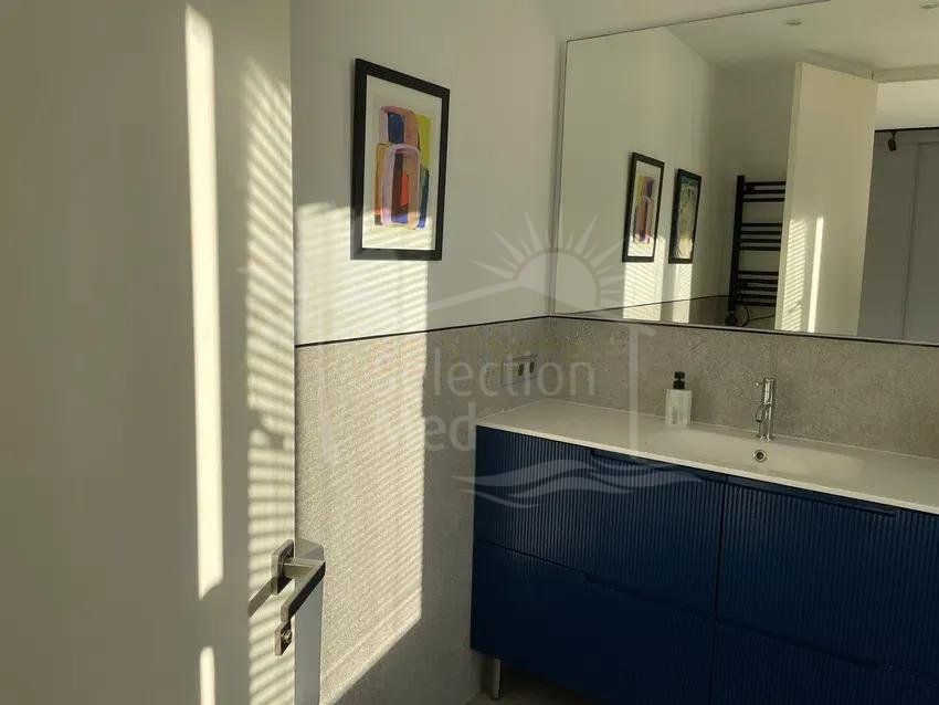 En el nivel superior se ubican dos dormitorios con baños en suite, ambos con acabados de primera calidad. El dormitorio principal incorpora una acogedora zona de descanso o lectura con vistas parciales al mar. La vivienda dispone en total de tres habitaciones y tres baños, además de armarios empotrados que optimizan el almacenamiento.