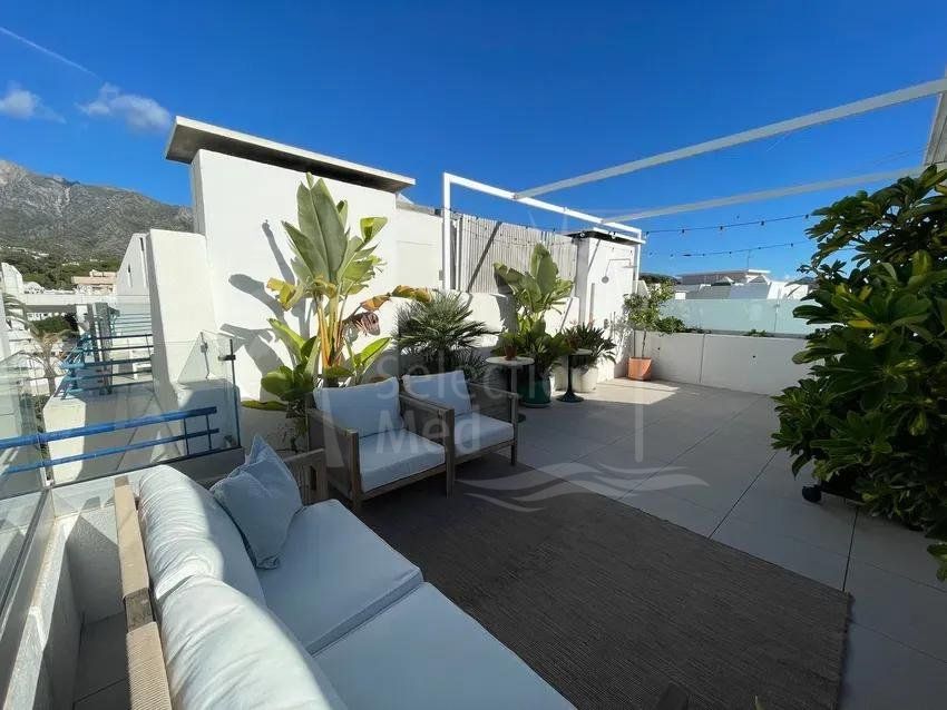 Ático reformado con vistas al mar situado en la prestigiosa urbanización Marbella House, a tan solo unos pasos de la playa y del Paseo Marítimo. La vivienda cuenta con 200 m² construidos y 125 m² útiles, distribuidos en tres niveles que maximizan la luz natural y las vistas al Mediterráneo.