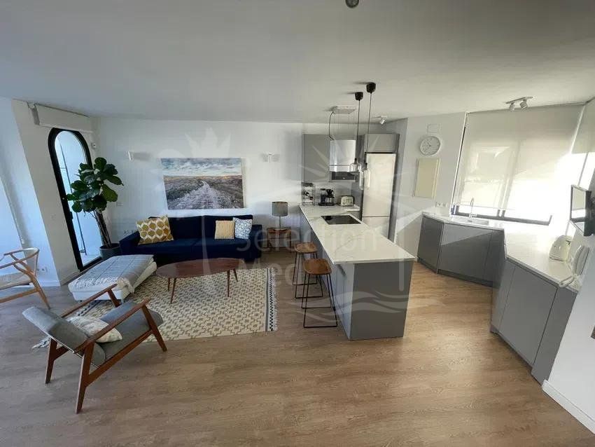 En la planta principal se encuentra un amplio salón con salida directa a una terraza orientada al este y oeste, ideal para disfrutar del sol durante gran parte del día. La cocina, integrada en el espacio, dispone de electrodomésticos de alta gama y un diseño contemporáneo que aporta calidez y funcionalidad. En esta misma planta hay un aseo de cortesía.