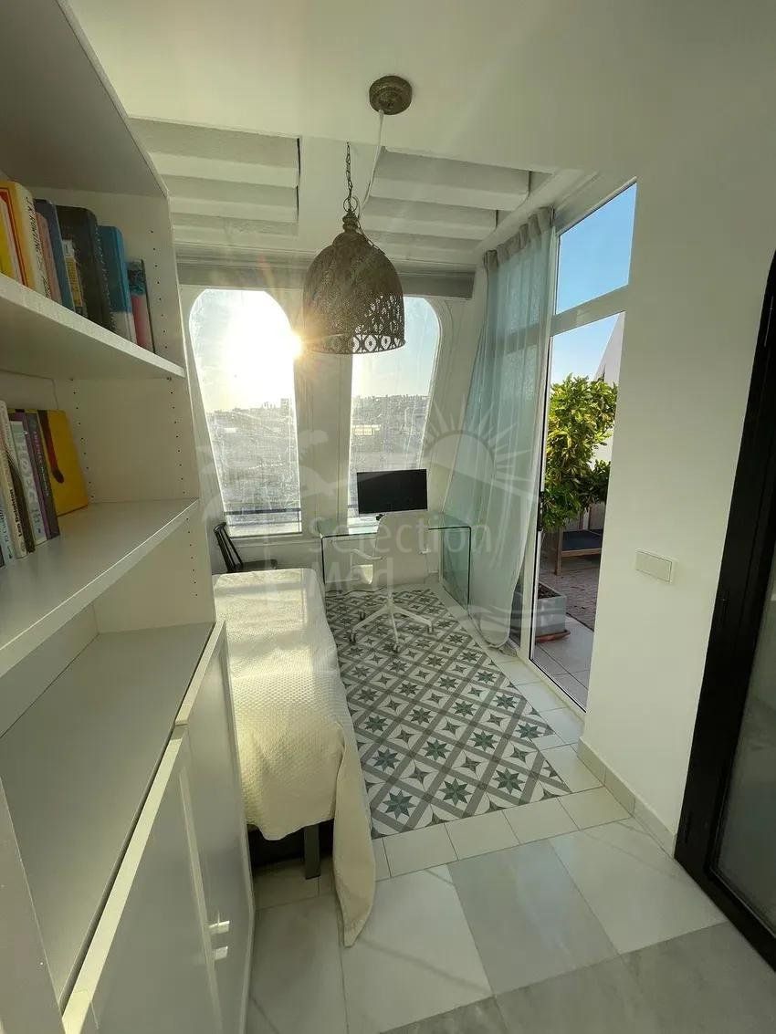 La azotea es uno de los grandes atractivos de este ático: un espectacular solárium privado con zona de barbacoa y vistas panorámicas al mar y la montaña. Este nivel incluye también un estudio independiente, perfecto como habitación complementaria, despacho o sala de lectura.
