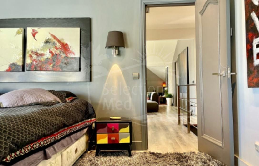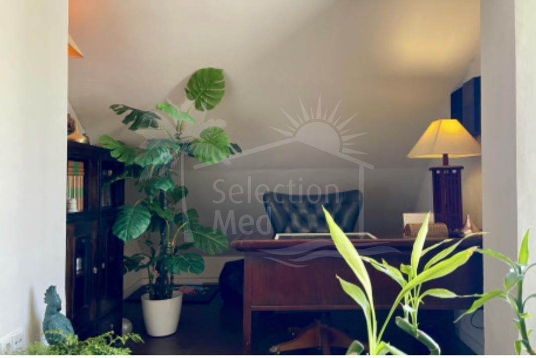 Hay dos amplios dormitorios y dos baños, incluyendo una suite principal con acceso directo a la terraza. La sala de estar y el dormitorio principal se abren a una terraza soleada, orientada al sur y al este que ofrece vistas panorámicas de las montañas y jardines ajardinados, un entorno perfecto para relajarse o cenar al aire libre.