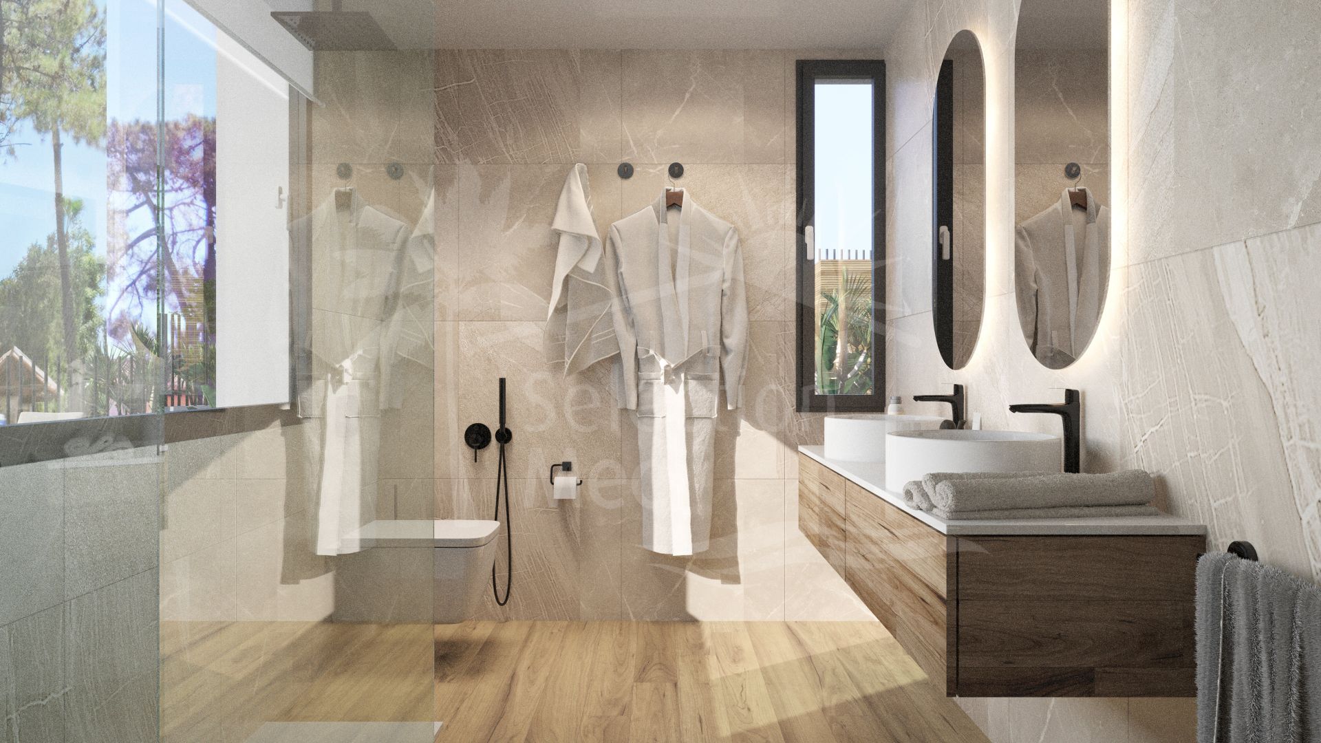 En el interior, la vivienda presenta un diseño de planta abierta donde el salón, el comedor y la cocina se integran perfectamente. Una chimenea aporta calidez y carácter, mientras que los grandes ventanales correderos conectan el interior con las terrazas, potenciando la luz natural y la vida interior-exterior. La suite principal incluye un amplio vestidor, garantizando comodidad y funcionalidad.