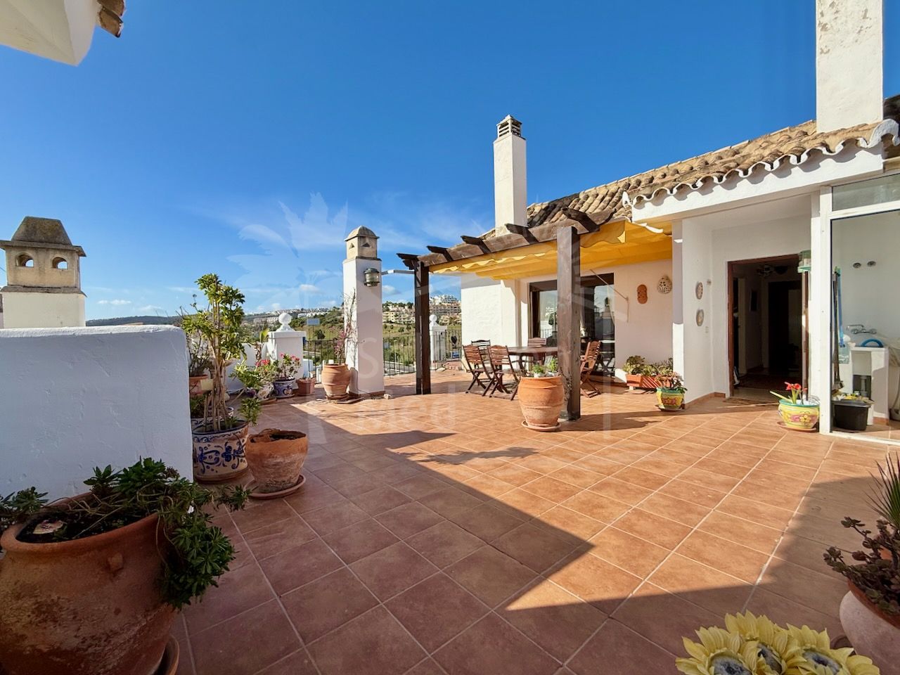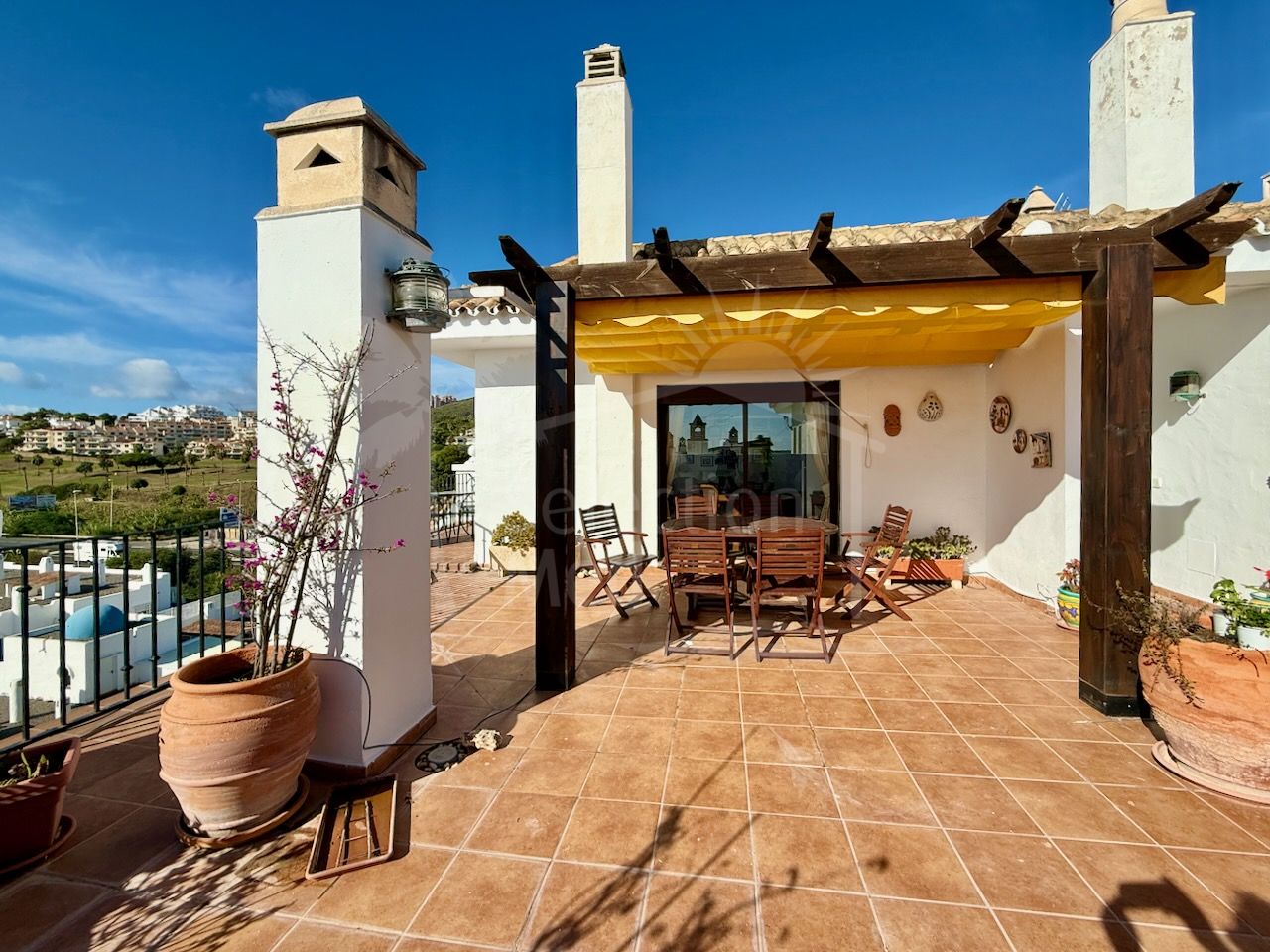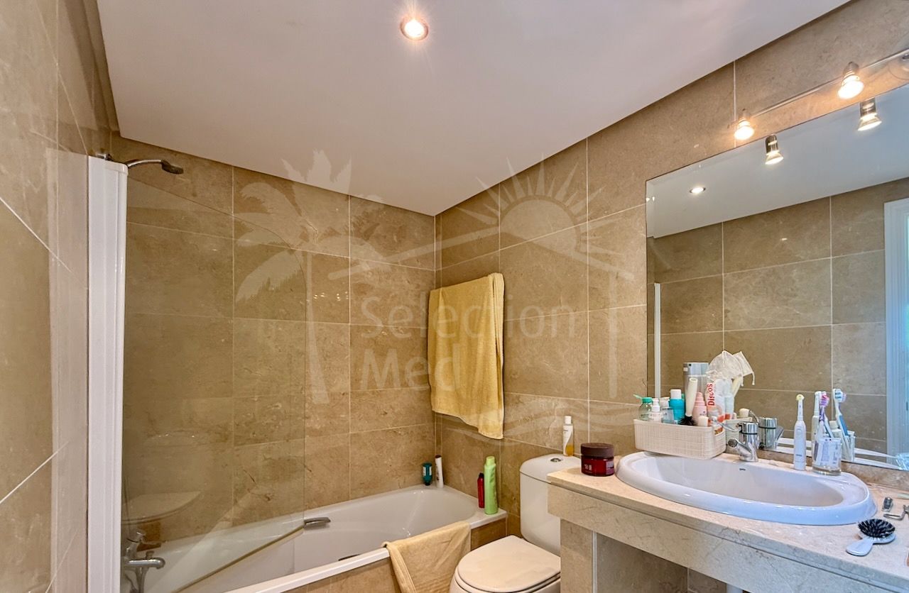 El interior es luminoso y está bien distribuido, con un amplio salón-comedor con acceso directo a la terraza principal, una cocina totalmente equipada y tres cómodos dormitorios y tres baños. Los suelos de mármol, el aire acondicionado y los armarios empotrados aportan confort y calidad a la vivienda.