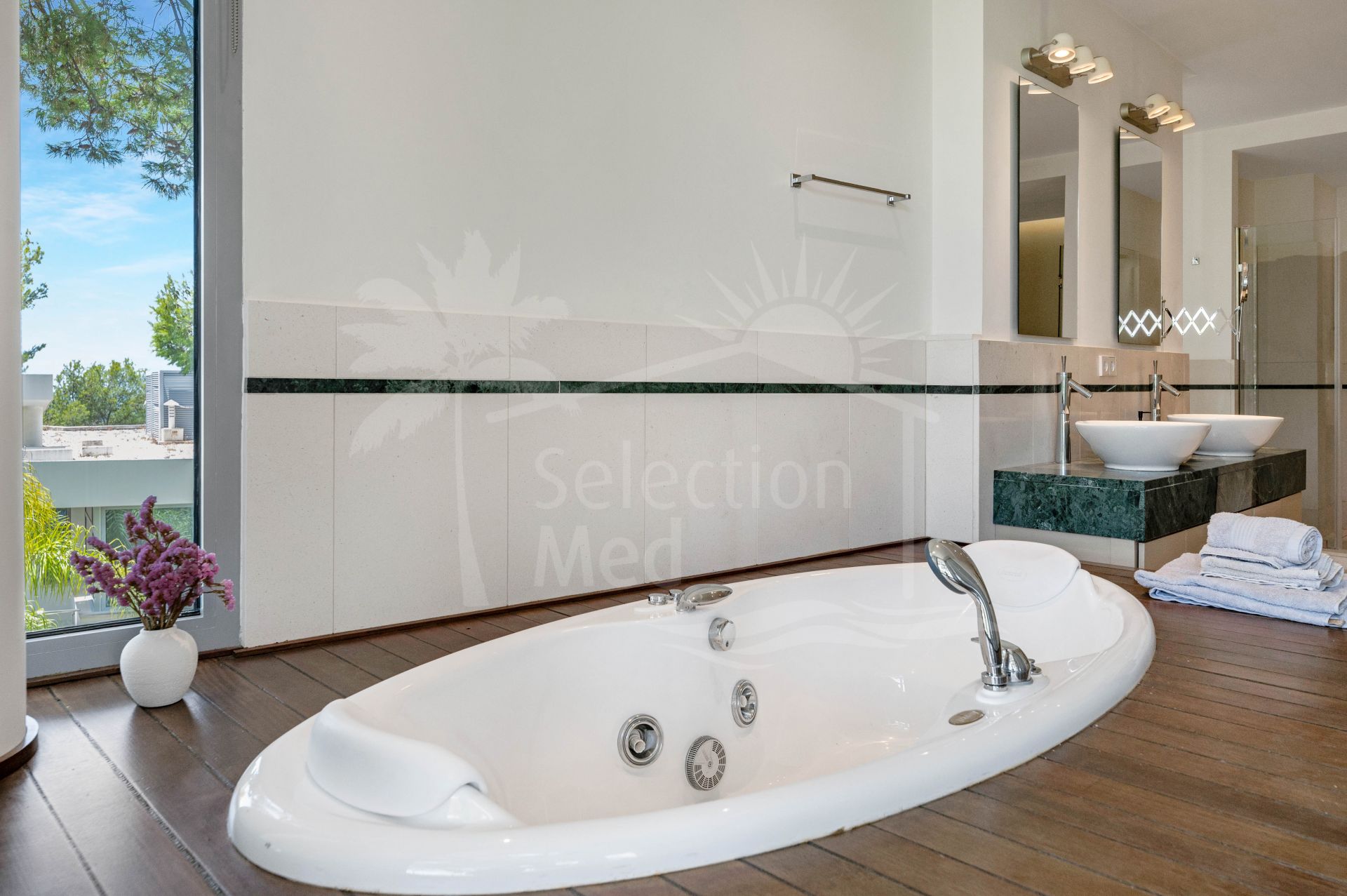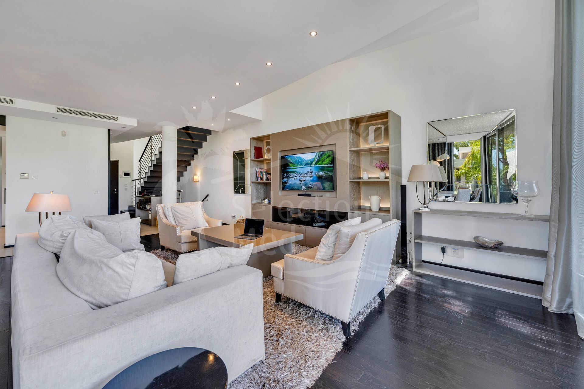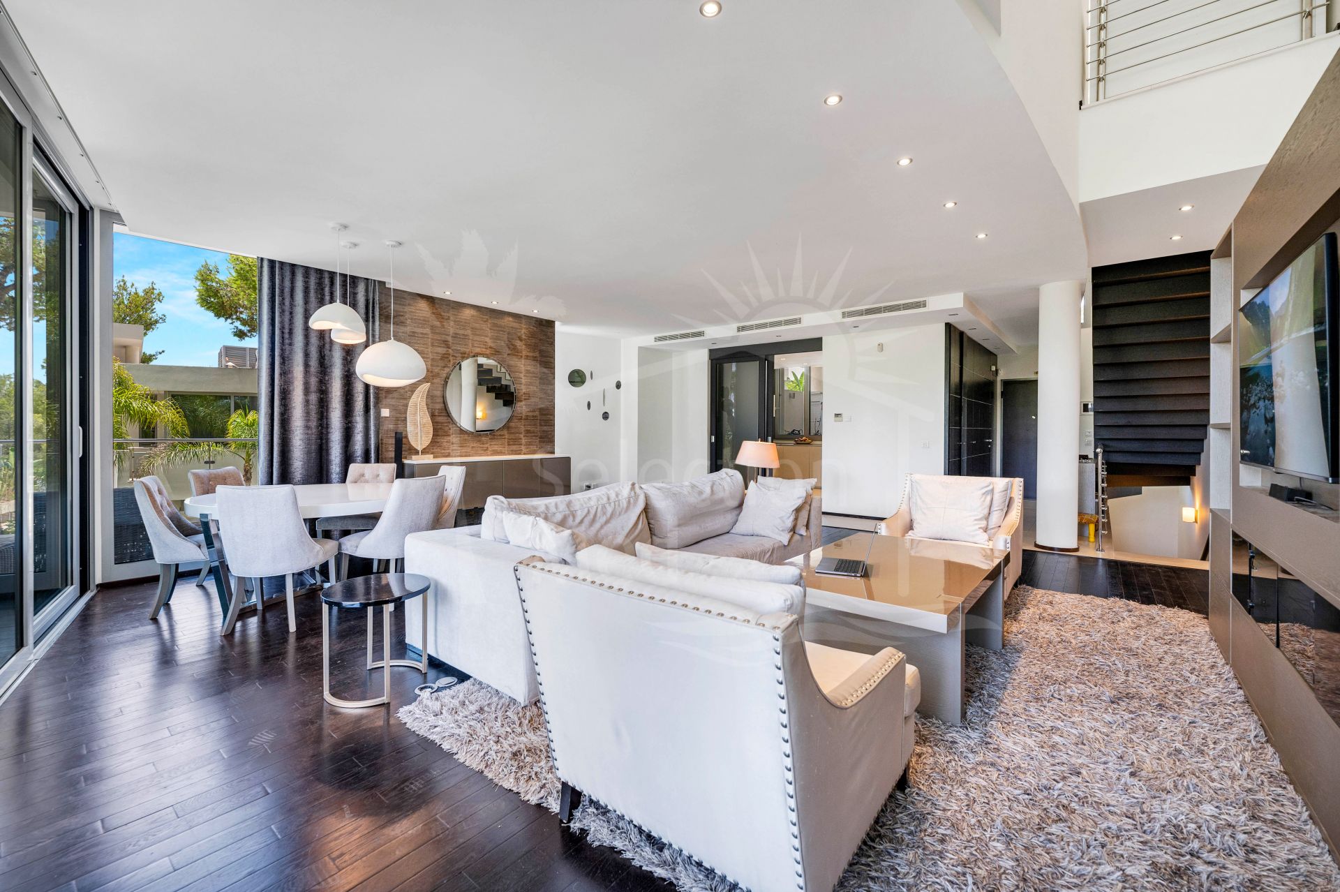 El inmueble cuenta con una superficie construida de 262m², distribuidos en 200m² interiores y 60m² de terraza privada. Dispone de dos espaciosos dormitorios y tres elegantes baños, todos presentando acabados de primera calidad. La propiedad se entrega completamente amueblada y equipada, con una cocina moderna totalmente equipada e independiente, así como un amplio salón luminoso que da acceso directo a la terraza cubierta con vistas al hermoso jardín comunitario.