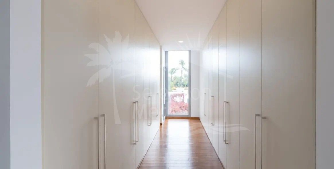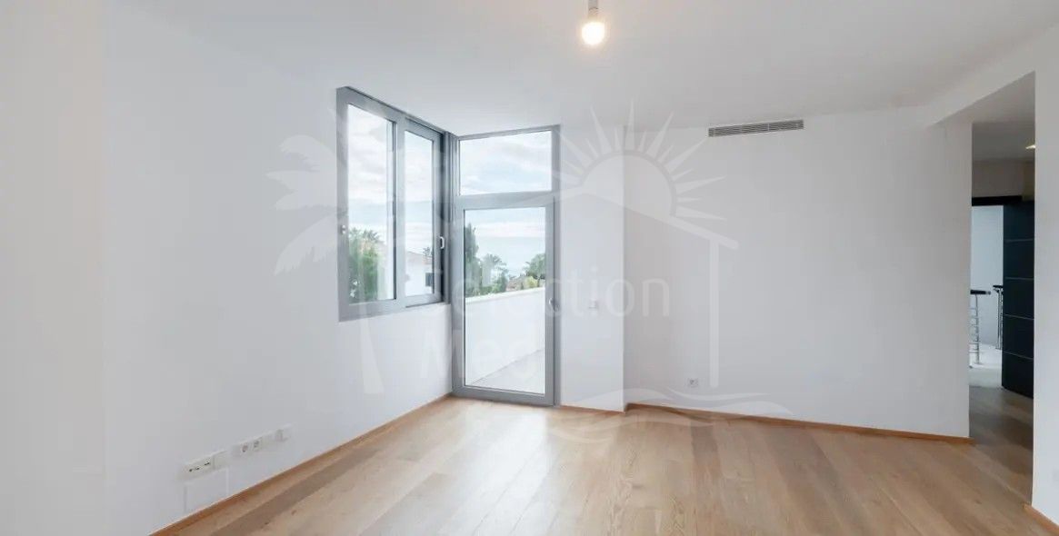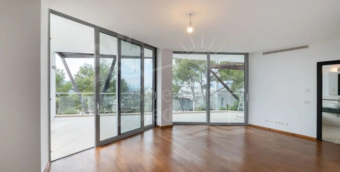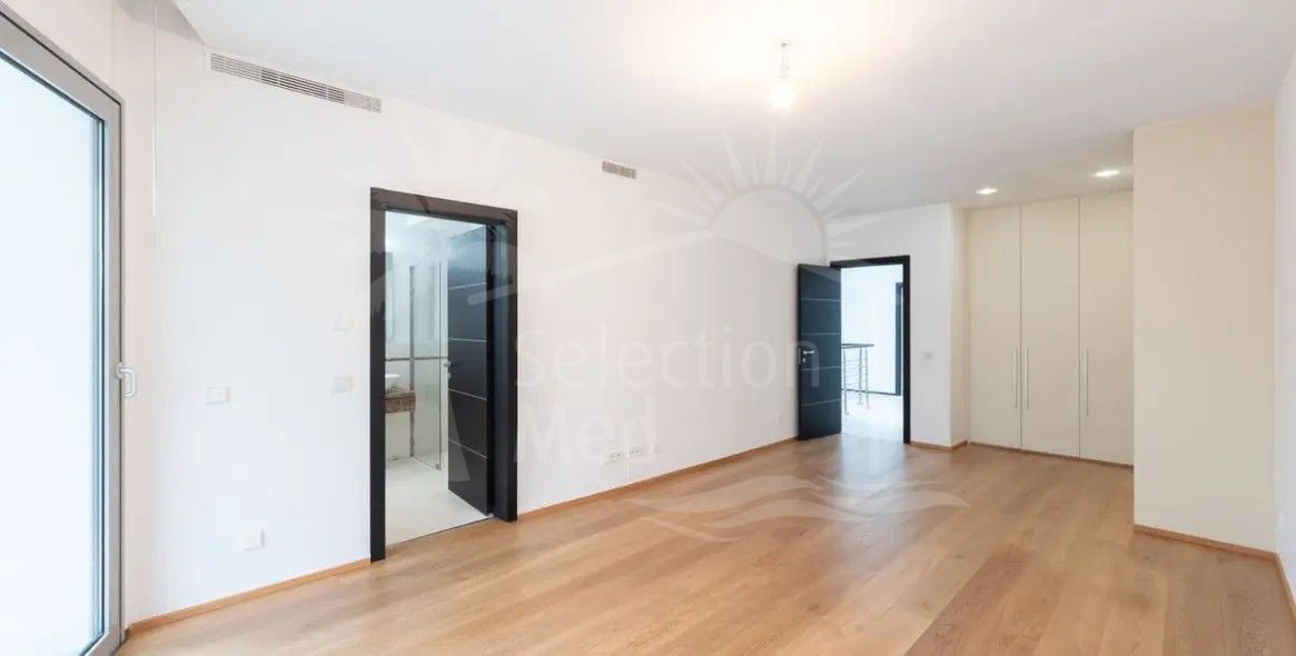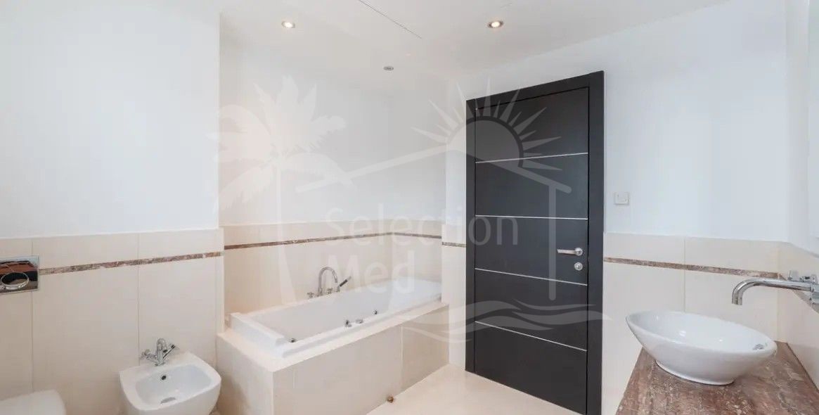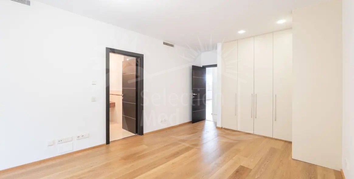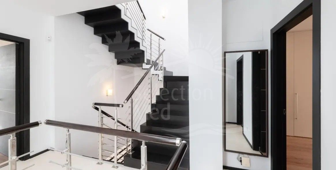 Con cuatro niveles impresionantes y servido por un ascensor privado, la villa abarca 800m2 construidos con un interior de 471m2, complementado con una terraza de 90m2 sustancial y una pequeña parcela de 42m2 para el ocio de bajo mantenimiento. Cinco dormitorios bien equipados, cada uno con baños modernos en suite, proporcionan una comodidad excelente y privacidad. Un aseo de invitados adicional, una habitación de invitados dedicada, y un amplio walk-in closet mejoran aún más la comodidad para los residentes y visitantes por igual. La cocina de planta abierta viene totalmente equipada y se conecta perfectamente a una zona de lavandería dedicada, mientras que las amplias puertas de vidrio llenan los interiores con luz natural y vistas panorámicas al mar, montañas, jardines y piscinas.