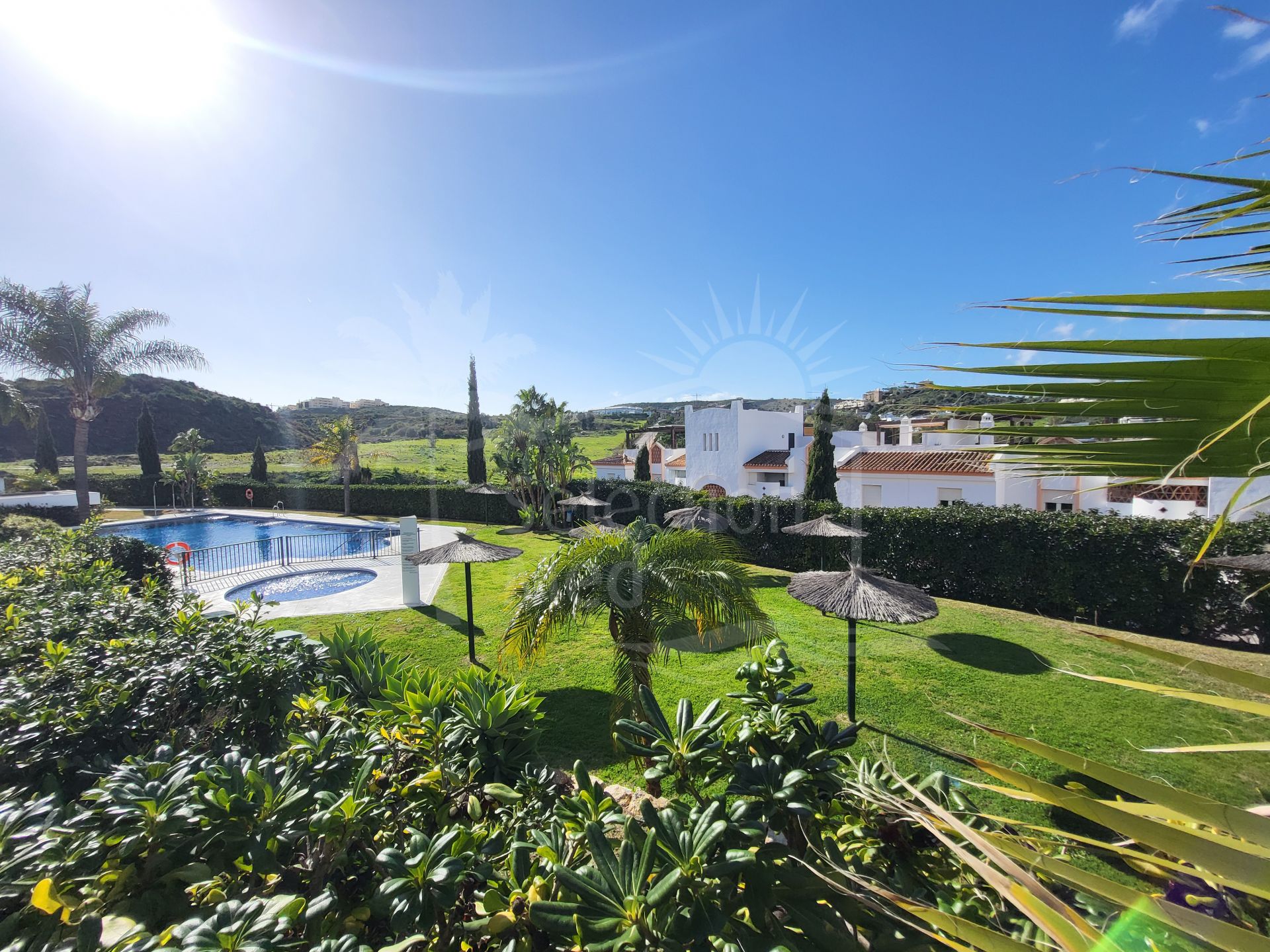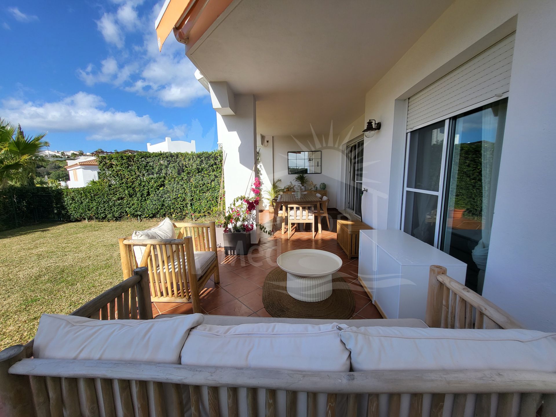 Luminoso apartamento en esquina de 3 dormitorios y 2 baños en Mijas Costa, con terraza y jardín. Suite principal, cocina totalmente equipada, parking, piscina, golf, cerca de la playa, Fuengirola y aeropuerto de Málaga.