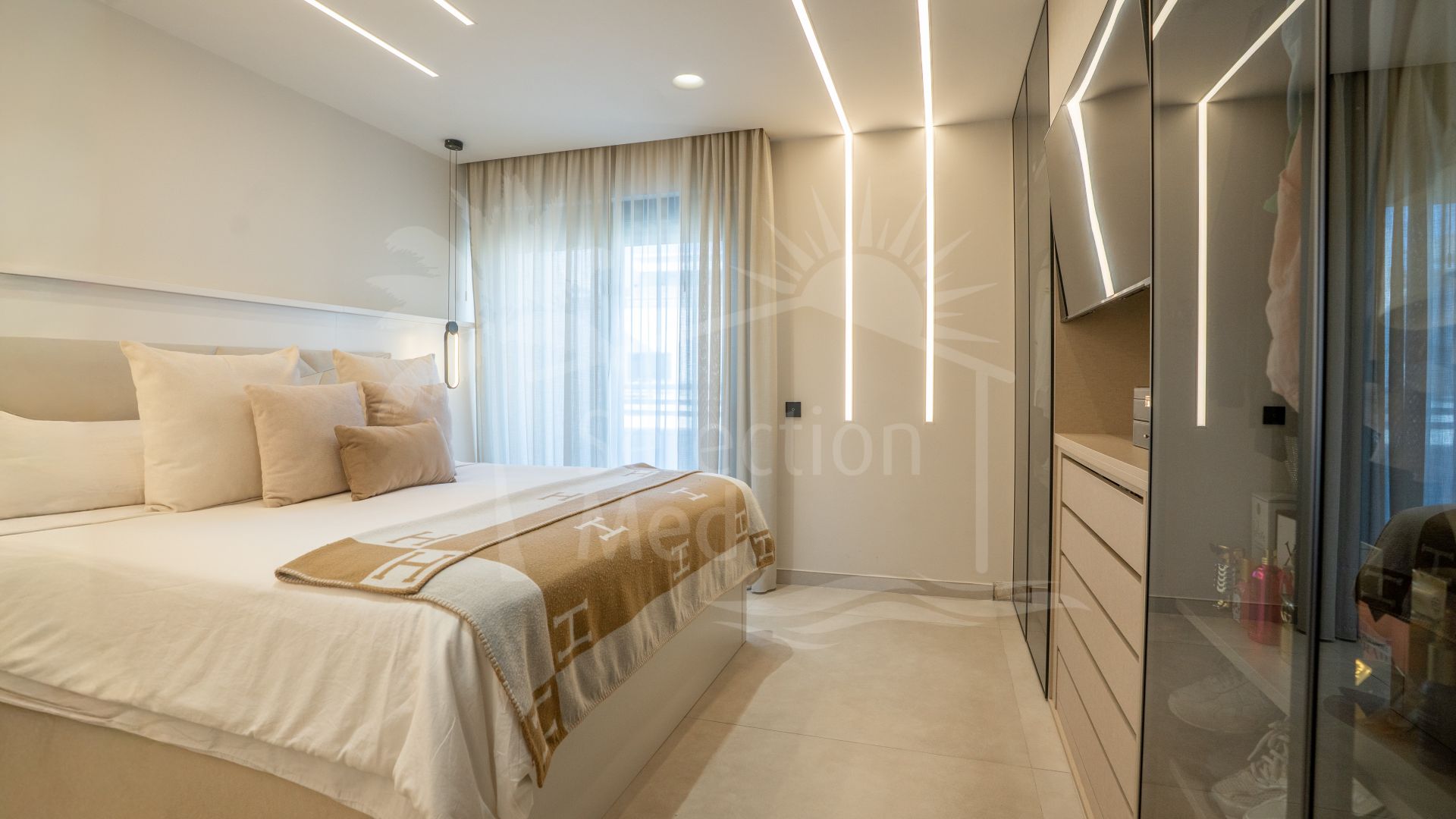 El apartamento dispone de dos amplios dormitorios y tres modernos baños, todos acabados con los más altos estándares. La superficie interior es de 155 m², complementada por una espectacular terraza de 96 m², que ofrece un amplio espacio para el descanso y el entretenimiento. El salón es luminoso y espacioso, con acceso directo a la terraza privada, e incluye doble acristalamiento y armarios empotrados para mayor confort y funcionalidad. La propiedad ha sido recientemente renovada y se presenta en excelente estado, reflejando un firme compromiso con la calidad y el estilo.
