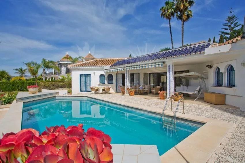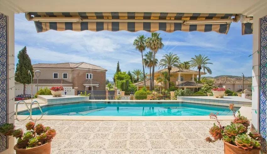 El interior del chalet se caracteriza por un amplio salón que se complementa con un comedor separado, ambos dotados de aire acondicionado para asegurar el confort durante todo el año. Los acabados de alta calidad se evidencian en los armarios empotrados estratégicamente ubicados para maximizar el espacio. Gracias a su orientación y diseño, se ofrecen vistas cautivadoras del jardín privado y de la piscina privada, así como del entorno de la calle, aportando un aire de tranquilidad y exclusividad.