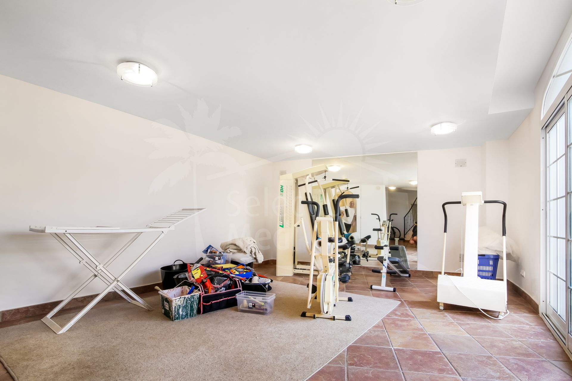 El nivel inferior tiene el área de gimnasio y sauna, así como también incluye espacio de almacenamiento, un patio exterior y área de lavado. La propiedad tiene una gran terraza que puede acceder tanto a la zona de la piscina como a la casa de verano y un baño adicional. Esta área tiene vistas al campo de golf y las montañas y es ideal para usar durante todo el año. La propiedad está orientada al oeste con la piscina orientada al suroeste y está en excelentes condiciones. Encontrará un camino privado en la parte delantera donde puede acomodar 2-3 autos.