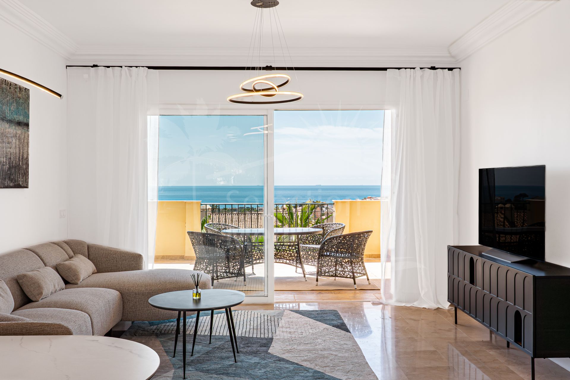La propiedad destaca por sus generosos espacios interiores, con una superficie construida de 138,19 m², de los cuales 104,9 m² corresponden al interior y 33,29 m² a una amplia terraza privada que permite disfrutar de vistas panorámicas al mar. Presenta techos altos de 2,90 metros, que aportan sensación de amplitud y luminosidad, y cuenta con un salón principal confortable, perfecto para el relax o para recibir visitas, junto a una cocina totalmente equipada y amueblada con electrodomésticos modernos. La vivienda dispone de dos dormitorios con armarios empotrados, uno de ellos con baño en suite y calefacción por suelo radiante en los baños, además de doble acristalamiento, suelo de mármol y puertas de cristal de alta calidad.
