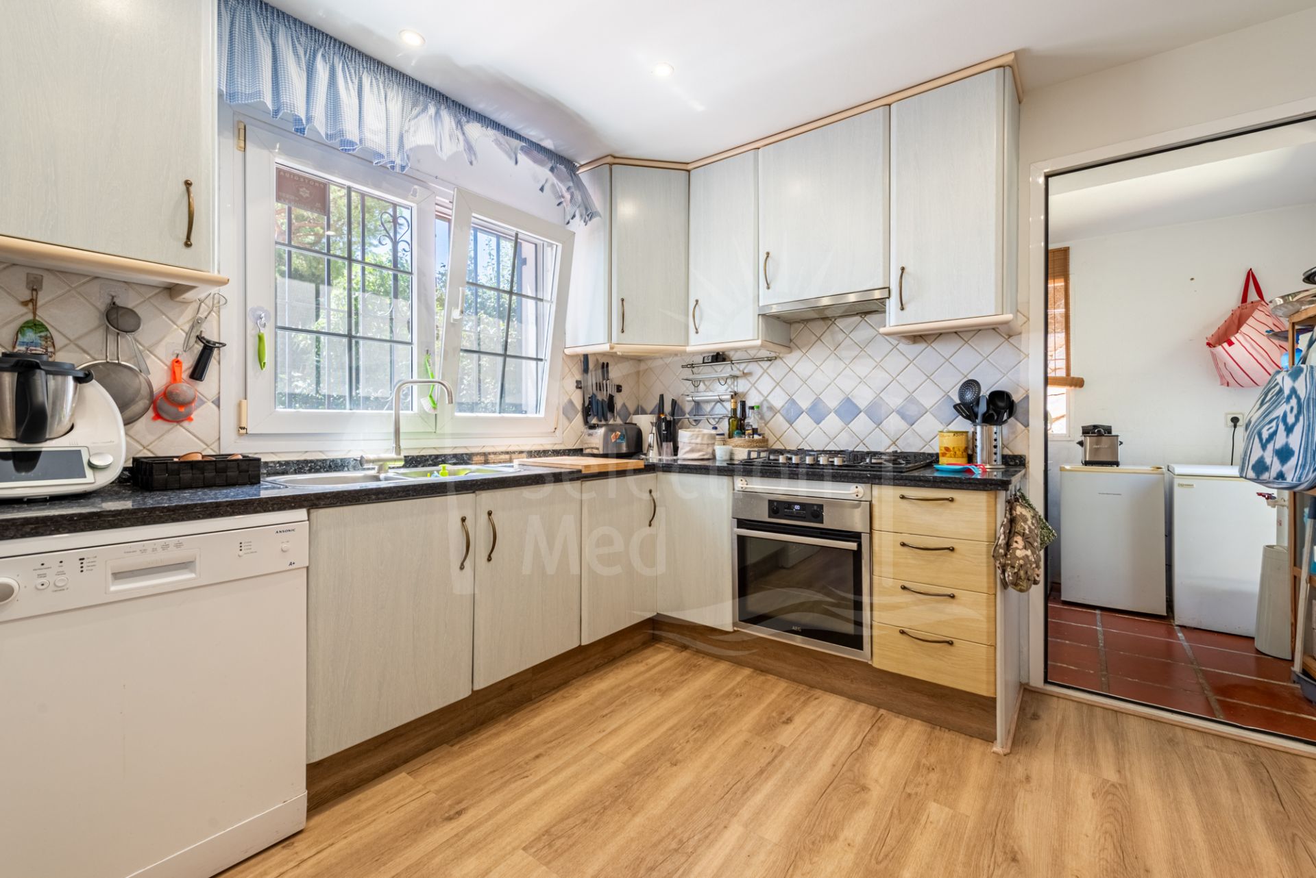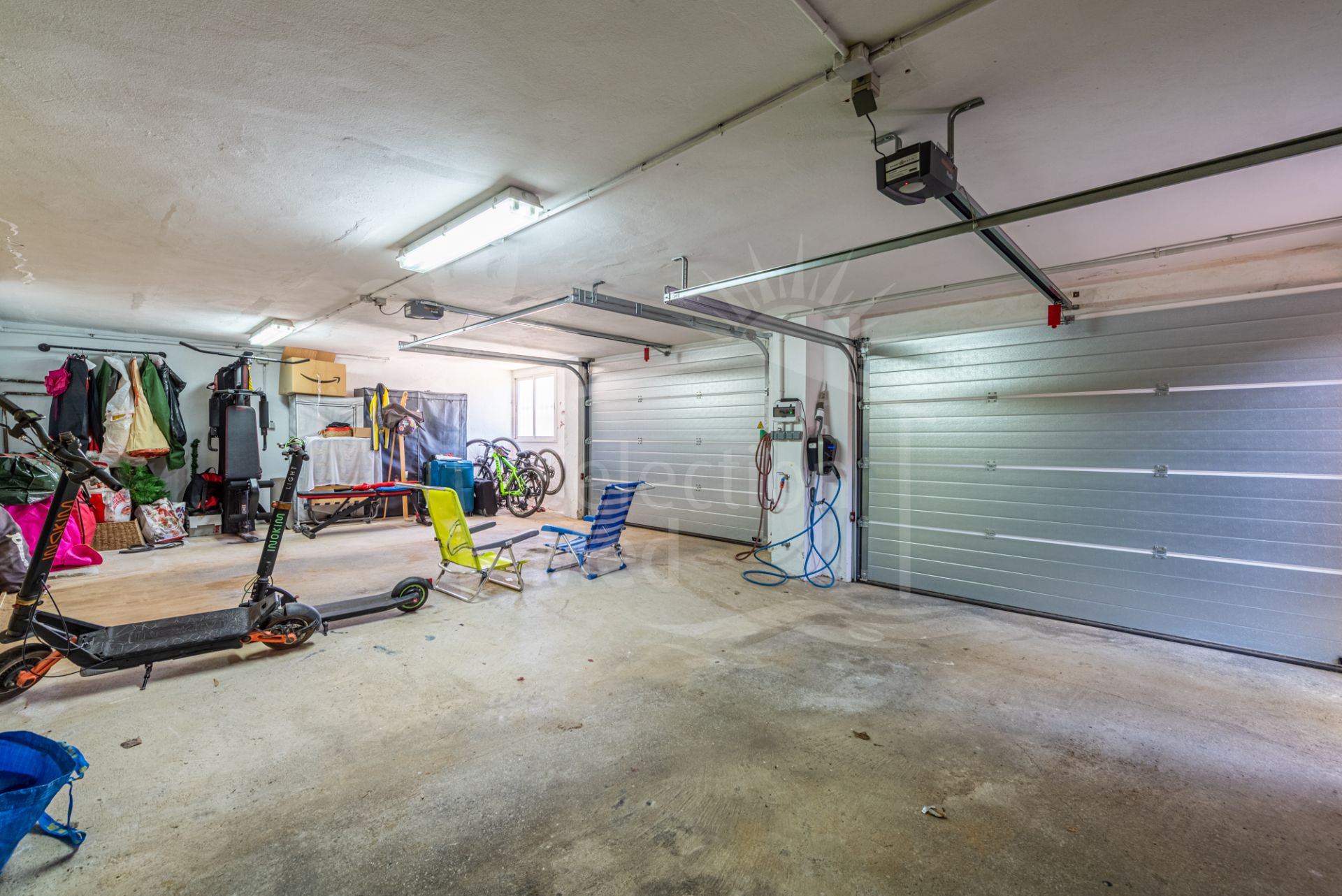 La villa se asienta sobre una parcela elevada con garaje doble y trastero a nivel de calle. Construida en estilo andaluz clásico, ofrece interiores luminosos con grandes ventanales. En la planta baja encontramos un amplio salón con dos zonas de estar, comedor y chimenea, además de una cocina totalmente equipada con lavadero independiente y un aseo de invitados.