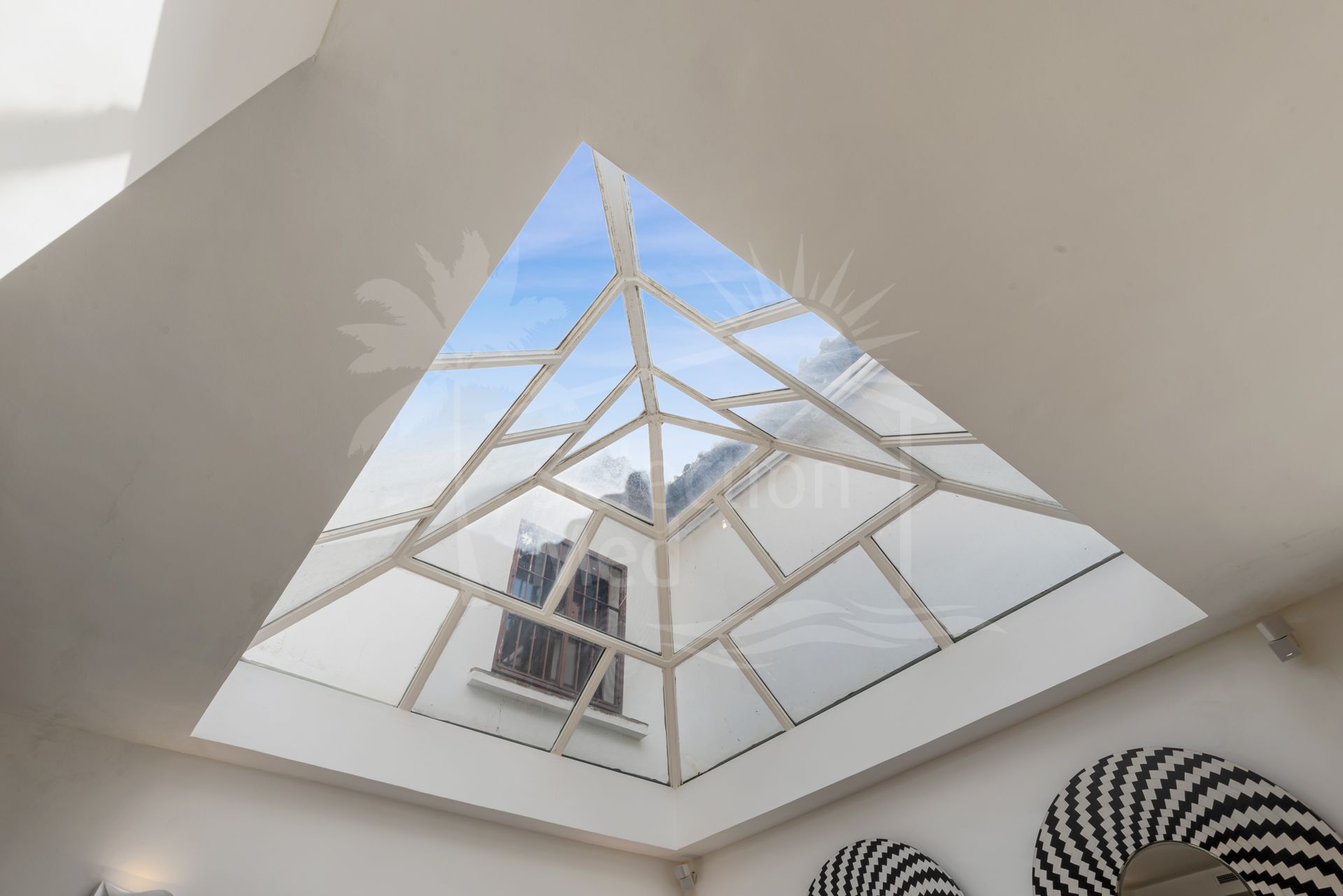La villa en sí se compone de un hall de entrada, gran salón con comedor, parte cubierta con un techo de cristal que permite mucha luz para entrar,