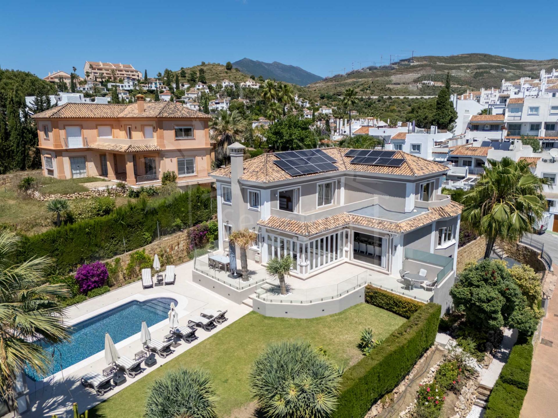 La villa cuenta con seis amplios dormitorios y cinco baños completos, cuatro de ellos en suite, además de un aseo para invitados, proporcionando máxima comodidad e independencia. El salón principal, con chimenea y suelos de mármol, se conecta a una terraza privada con vistas panorámicas al mar y la montaña. La cocina, totalmente equipada y con zona de office, se complementa con una cocina auxiliar y un práctico lavadero. El comedor, independiente y luminoso, resulta ideal para reuniones familiares y eventos sociales.