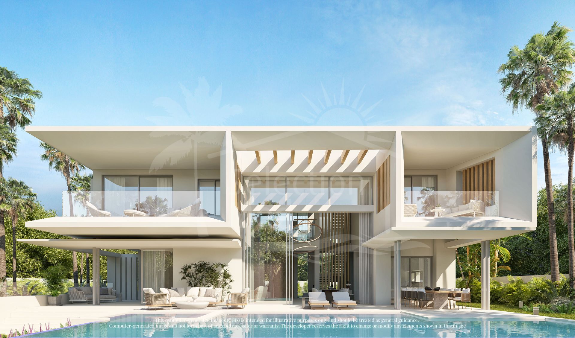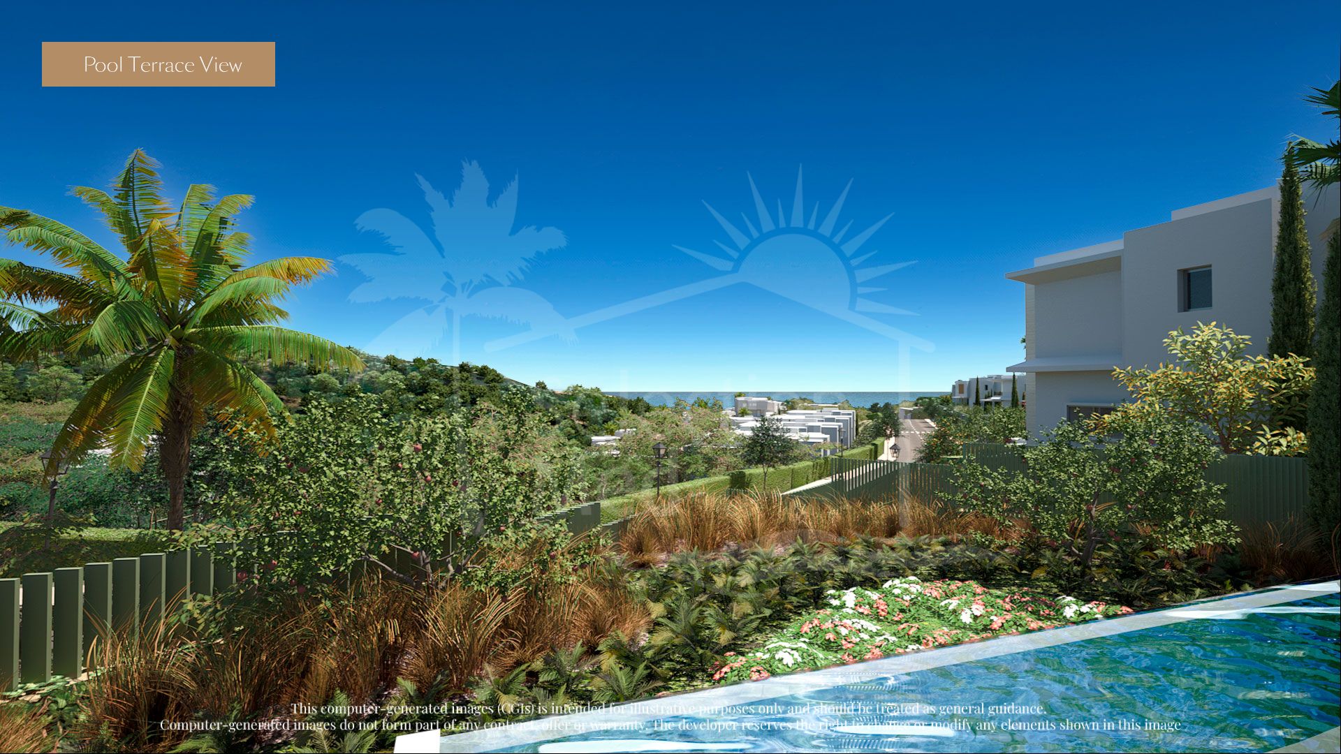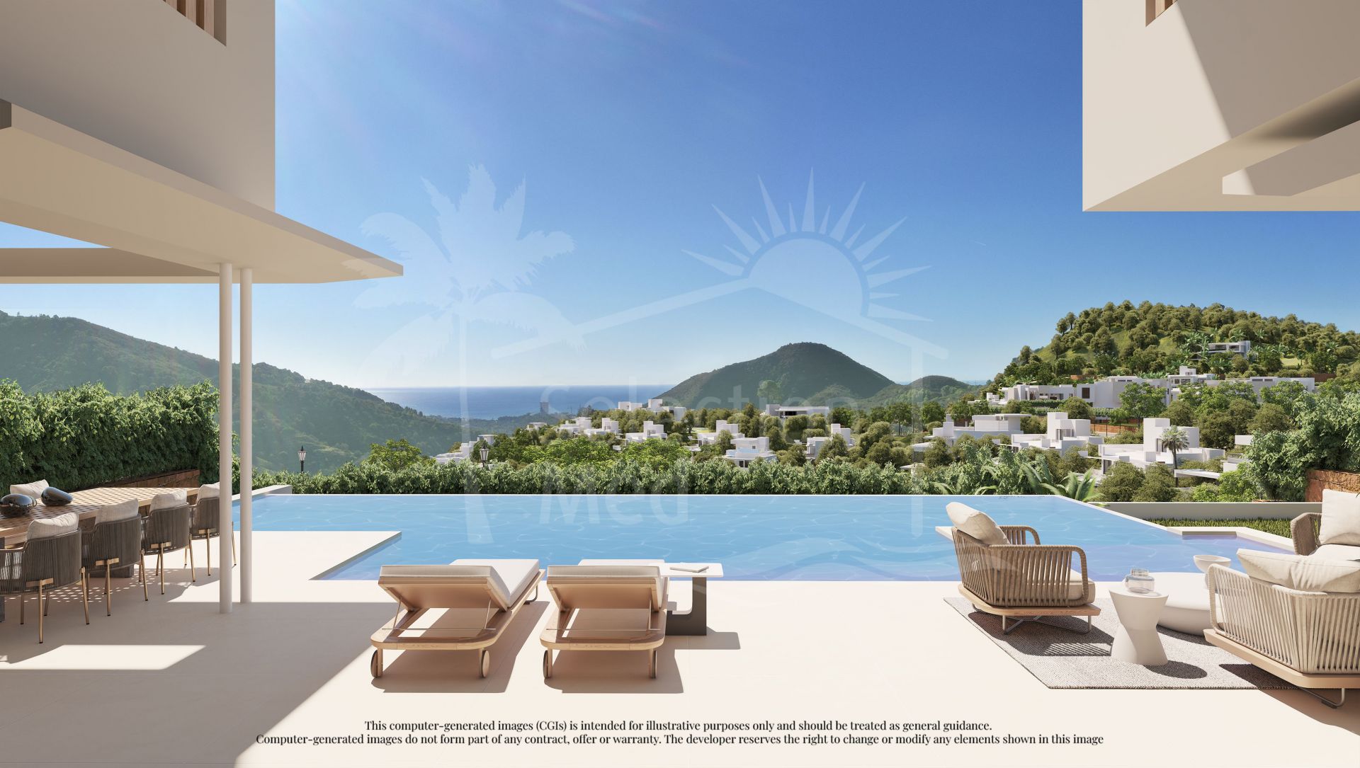 Villa en venta en Palo Alto, Ojen con 4 dormitorios, 5 baños, 4 baños en suite, 1 aseo, construido en 2025 y tiene piscina (privado), garaje (privado) y jardín (privado). Dimensiones: 864.37m² construidos, 1077m² parcela, 611.93m² interior y 252.44m² terraza.