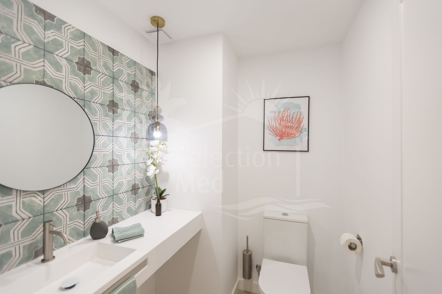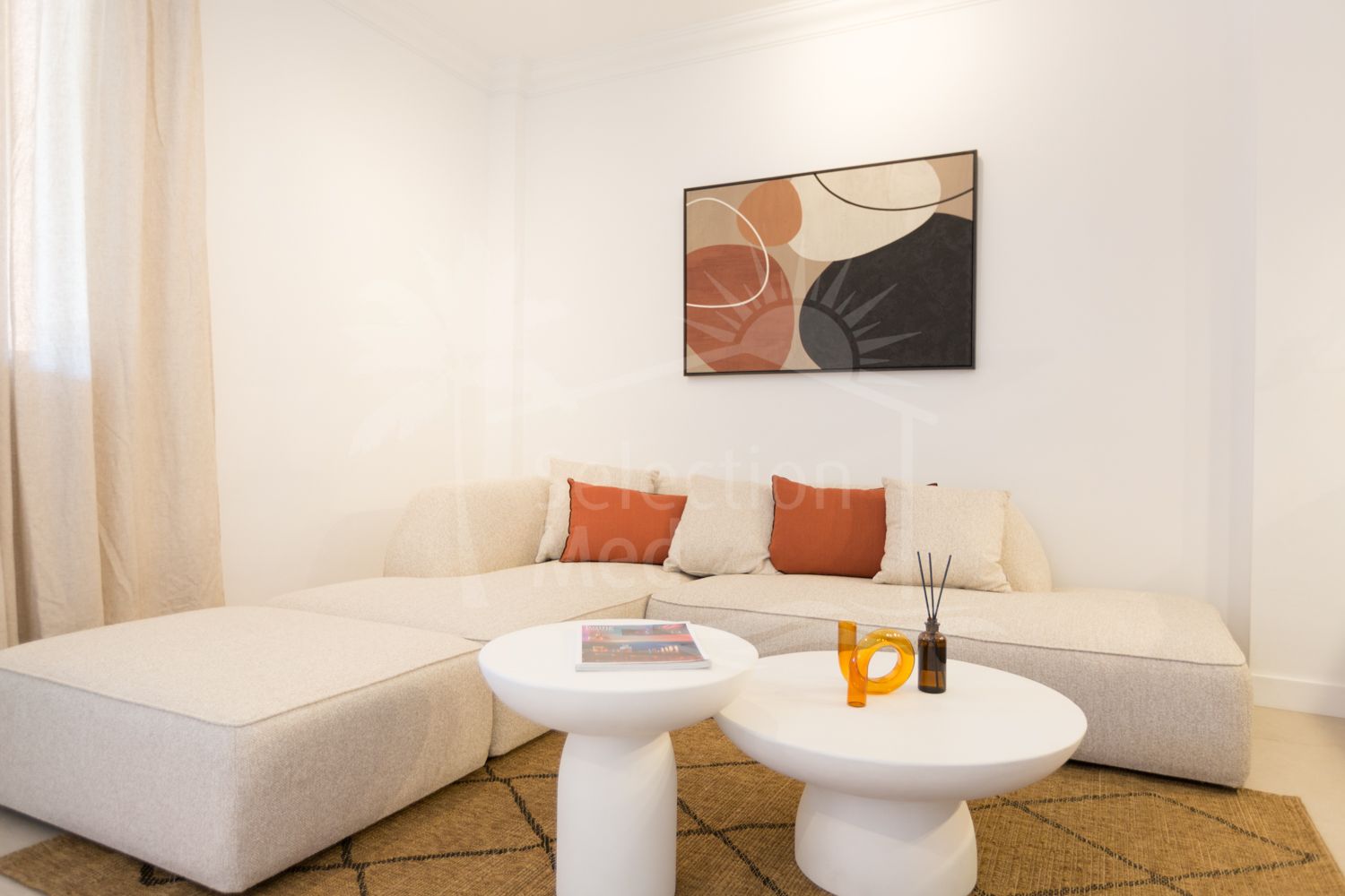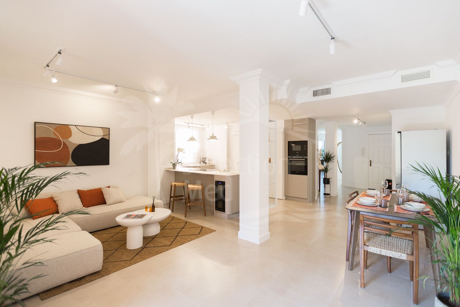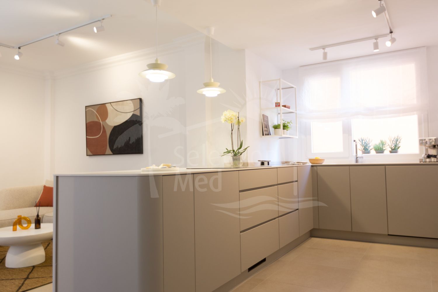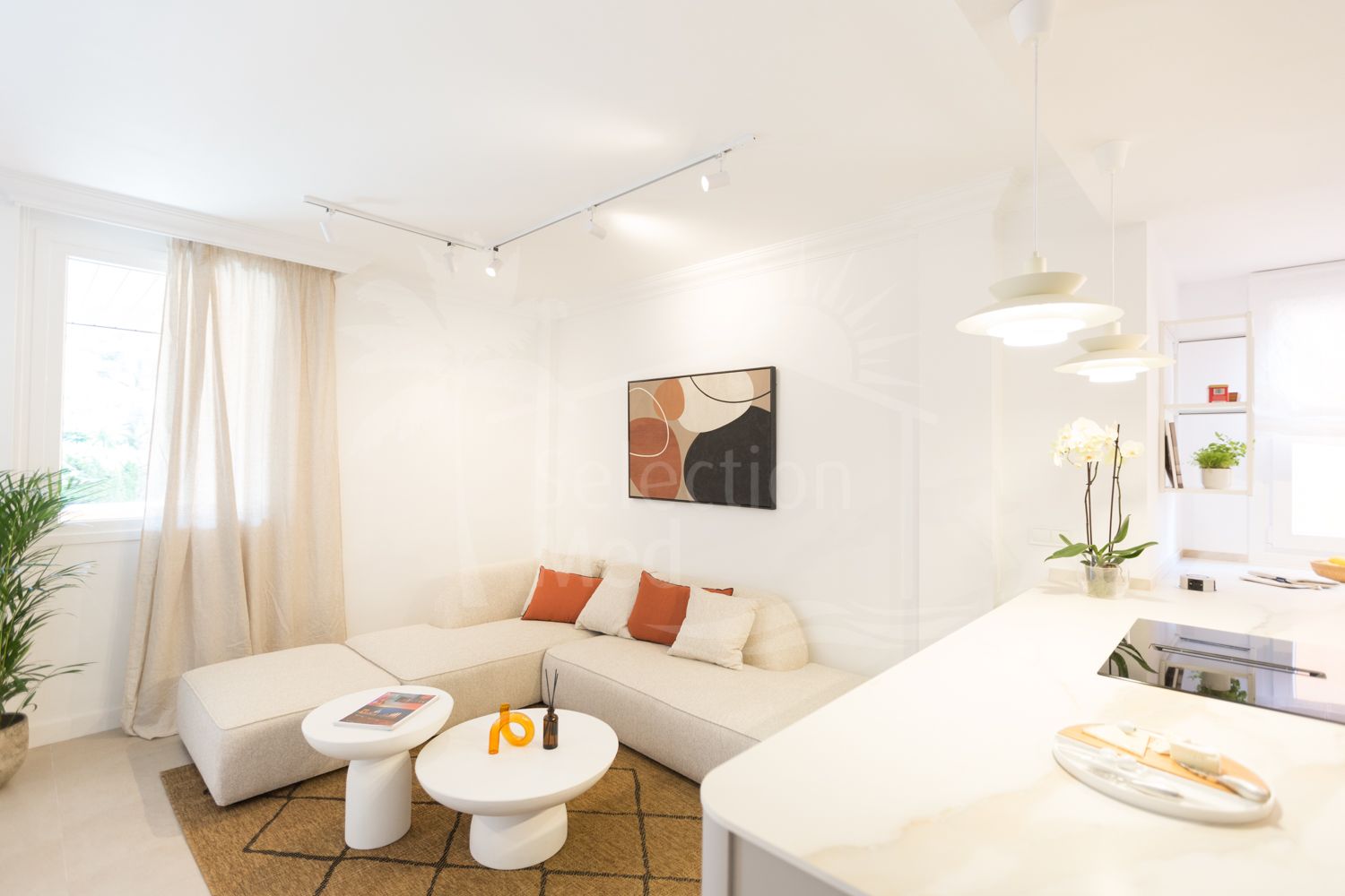 La vivienda cuenta con dos dormitorios, una cocina de diseño danés equipada con encimera de Dekton y un amplio salón con acceso a una terraza privada. Puertas y ventanas de alta gama garantizan aislamiento total del ruido exterior, creando un ambiente silencioso y relajante en el interior.