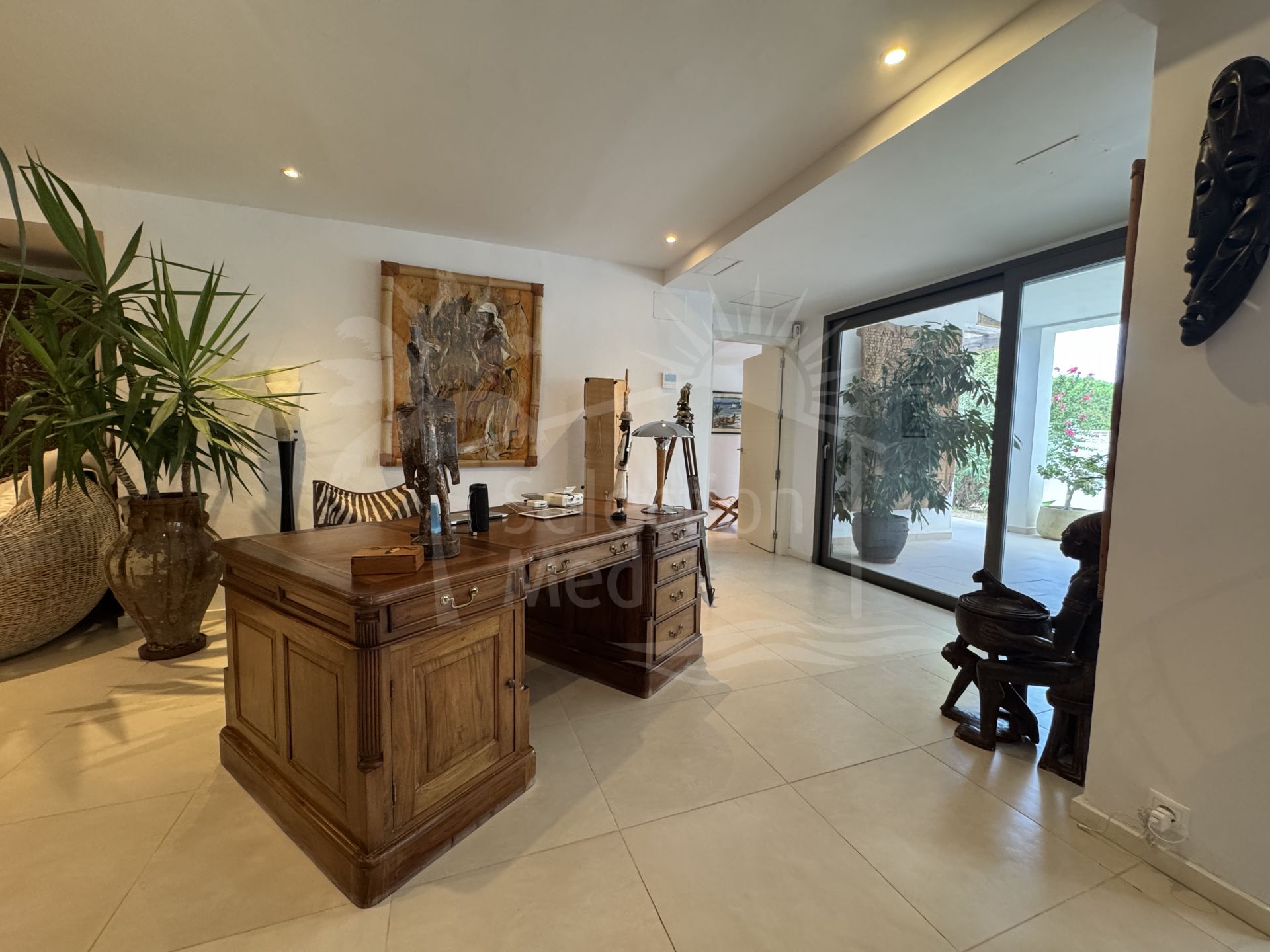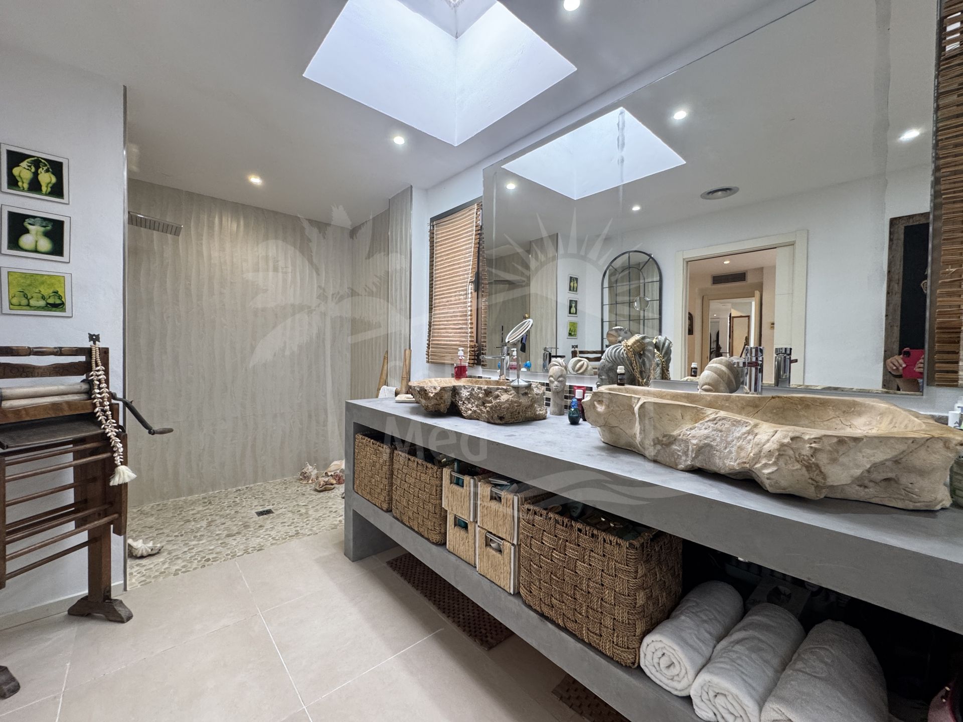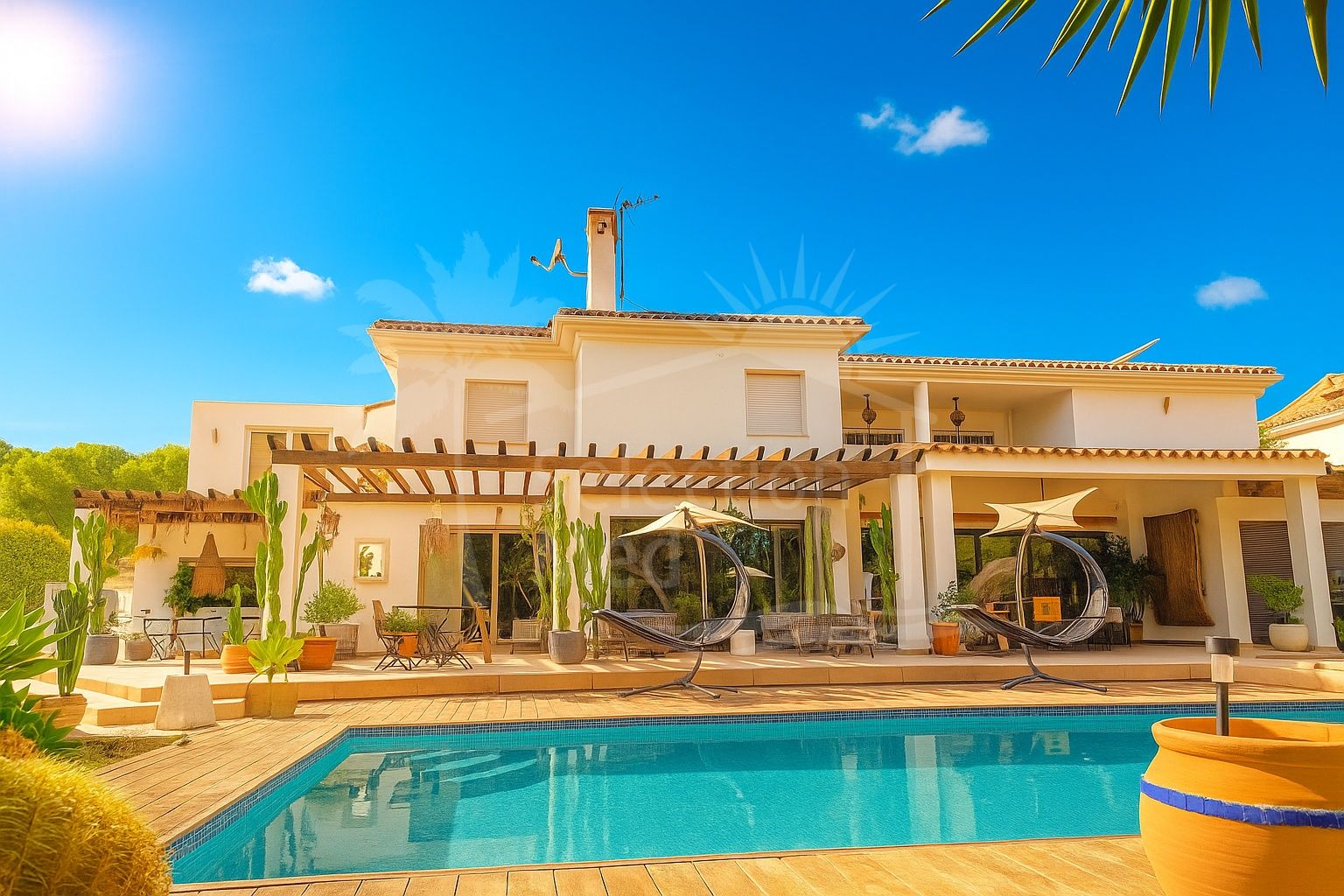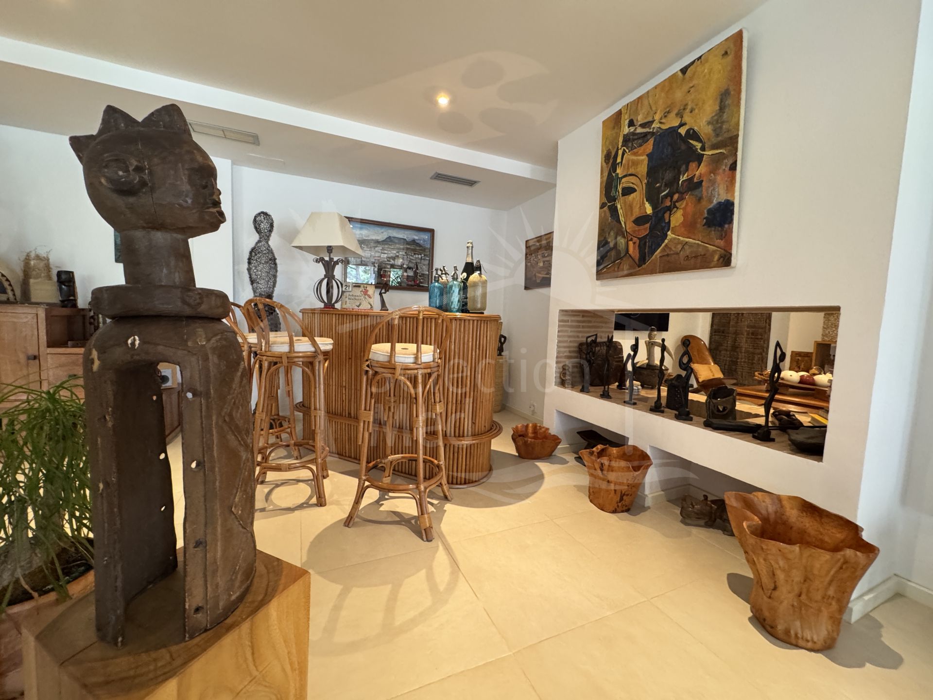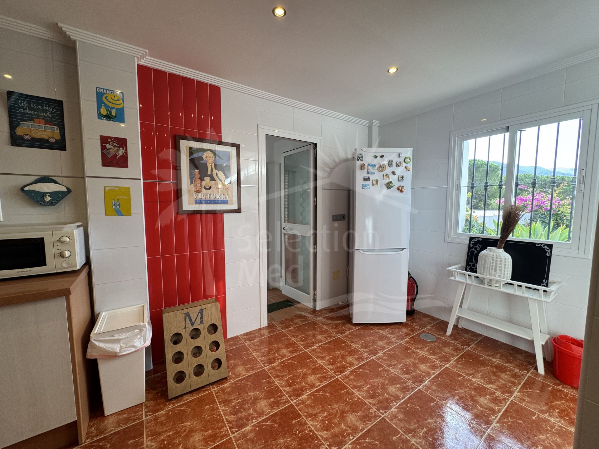 El interior de la villa destaca por sus numerosos atractivos: cocina totalmente equipada, amplio salón con chimenea, comedor independiente, así como sala de juegos y despacho. Varias terrazas, tanto cubiertas como descubiertas, permiten disfrutar de vistas despejadas al campo, al jardín maduro o a la piscina privada. La presencia de un dormitorio y un apartamento para invitados, trastero, despacho y vestidor para invitados aumenta la funcionalidad de la vivienda. Además, la villa dispone de sistema de calefacción por techo, aire acondicionado, sistema Dolby Surround, doble acristalamiento, suelos de gres, acceso a Internet por fibra óptica y máxima seguridad garantizada por sistema de alarma, cámaras de vigilancia y rejas de seguridad.