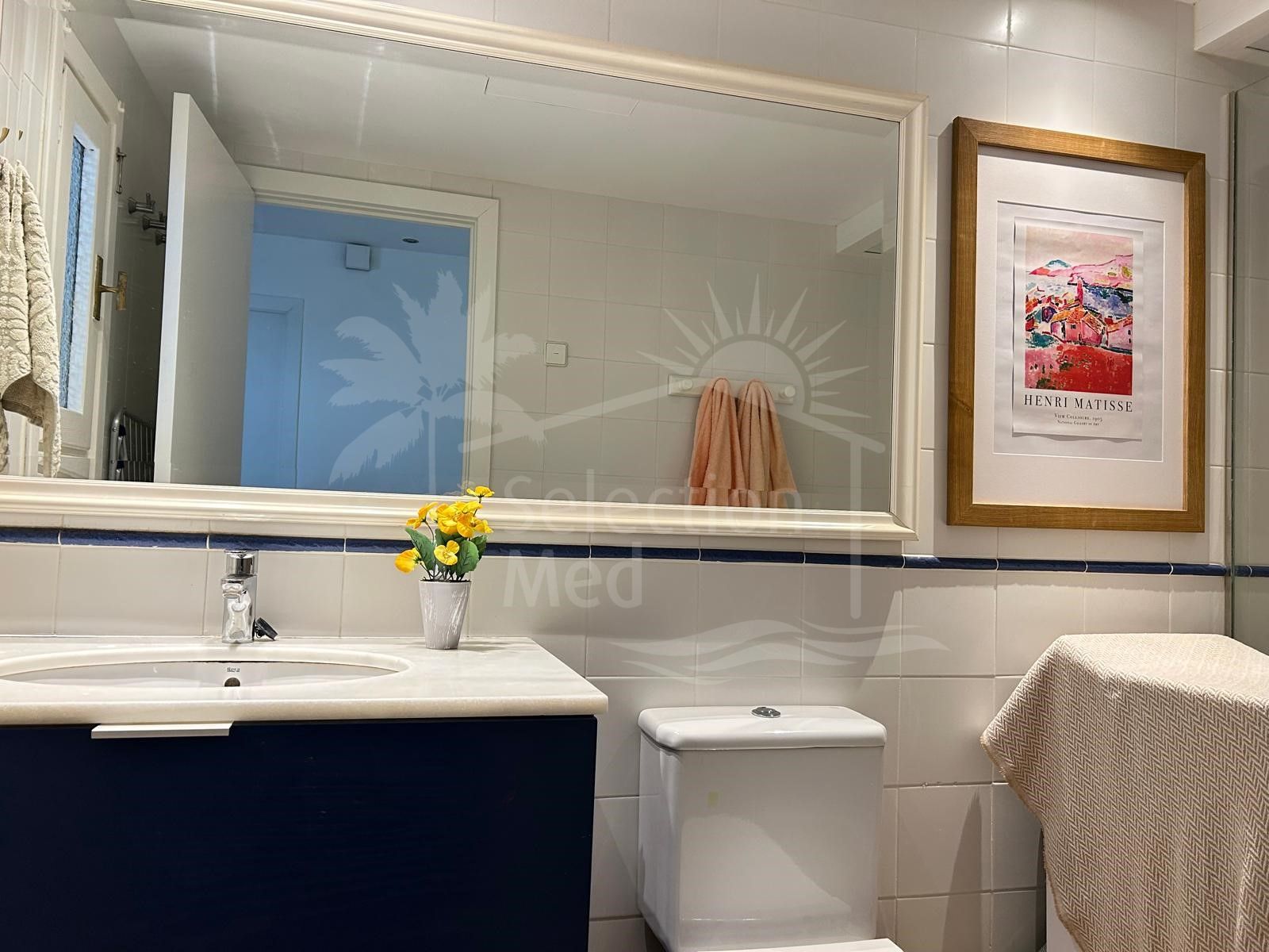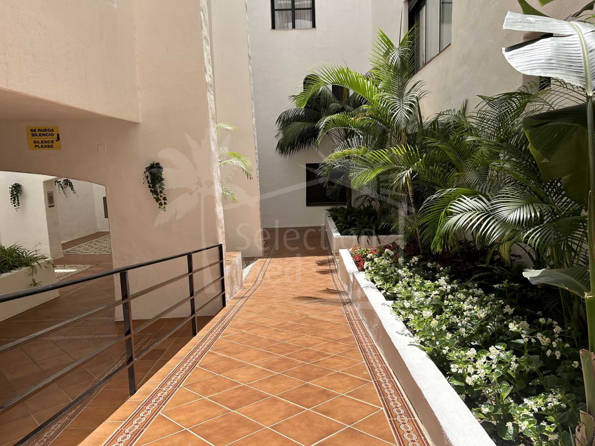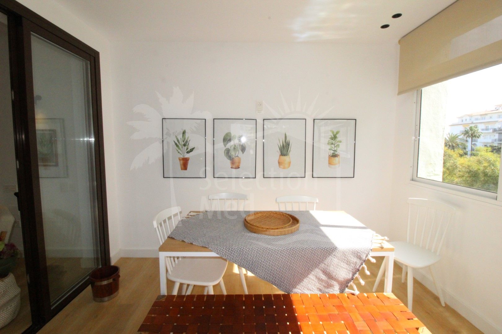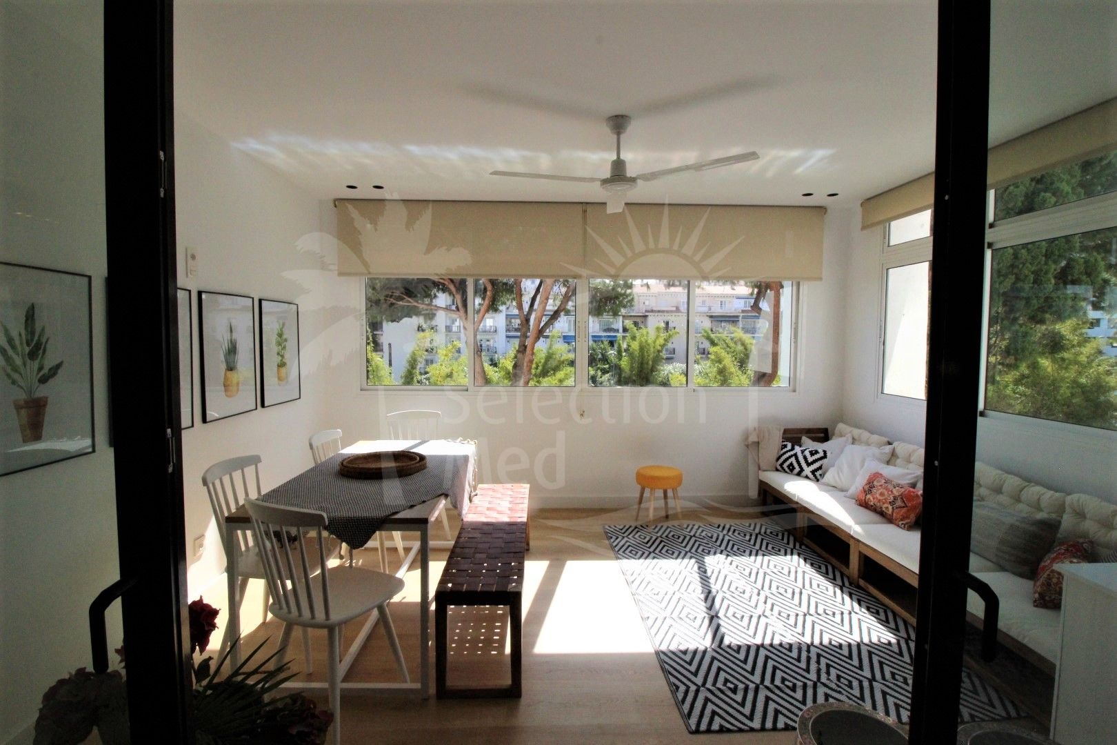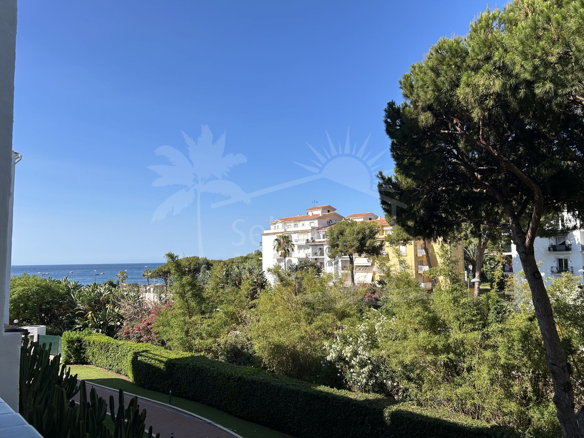 REBAJADO !! Oportunidad!!; Apartamento de 2 dormitorios y un baño con vistas al mar y orientación al oeste, sol de tarde. Reformado. Esta situado en la prestigiosa urbanización en Playas del Duque. Cuenta con bonito salón y La cocina equipada e integrada en el salón. La terraza es acristalada y tiene el comedor y otra zona de estar . Las vistas son al paseo peatonal de Lola Flores y a su lateral, el mar. Es todo exterior y haciendo esquina. Está impecable tiene todas las comodidades entre ellas Aire acondicionado y plaza de Garaje incluido en el precio perfecto para entrar a vivir y excelente como inversion.