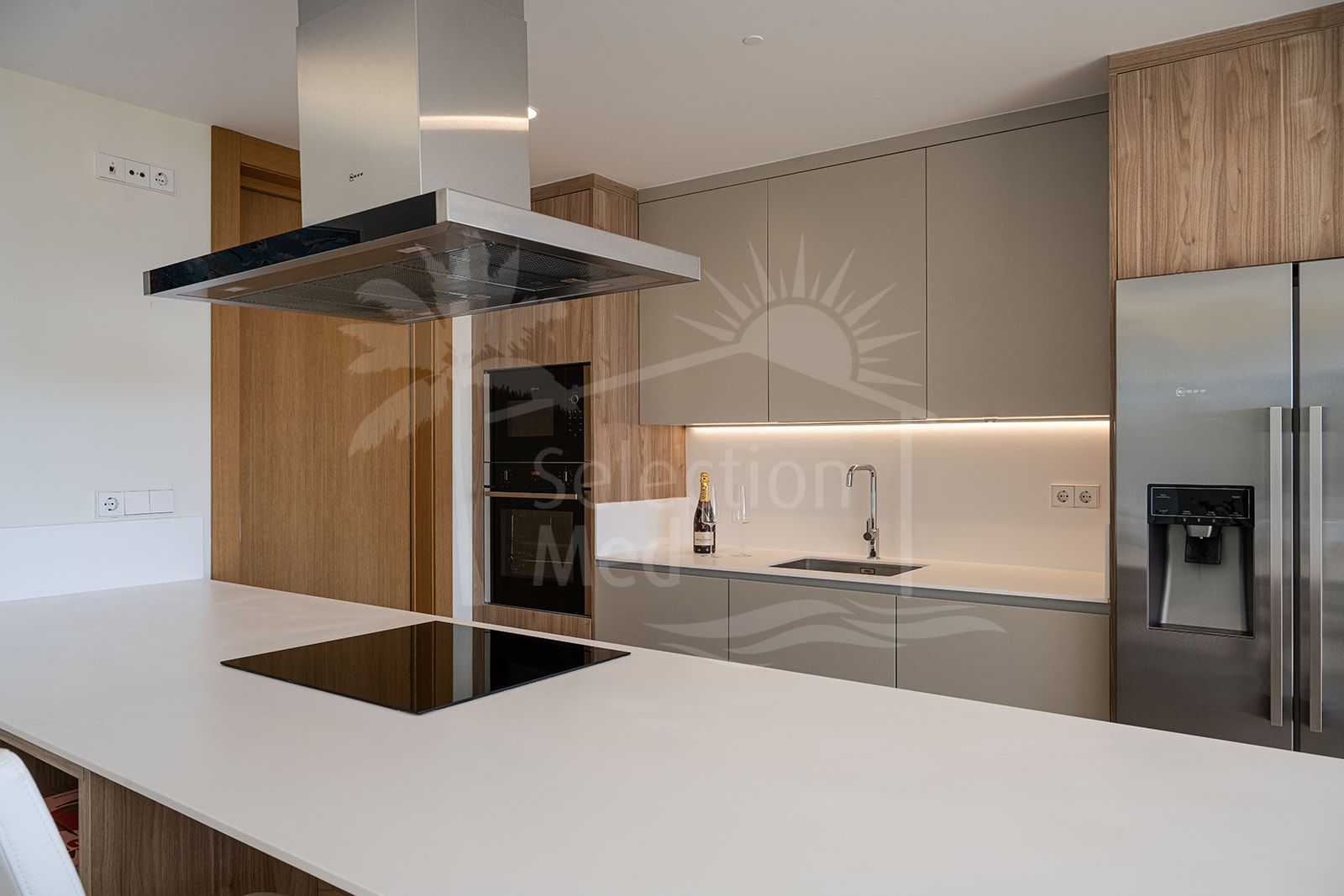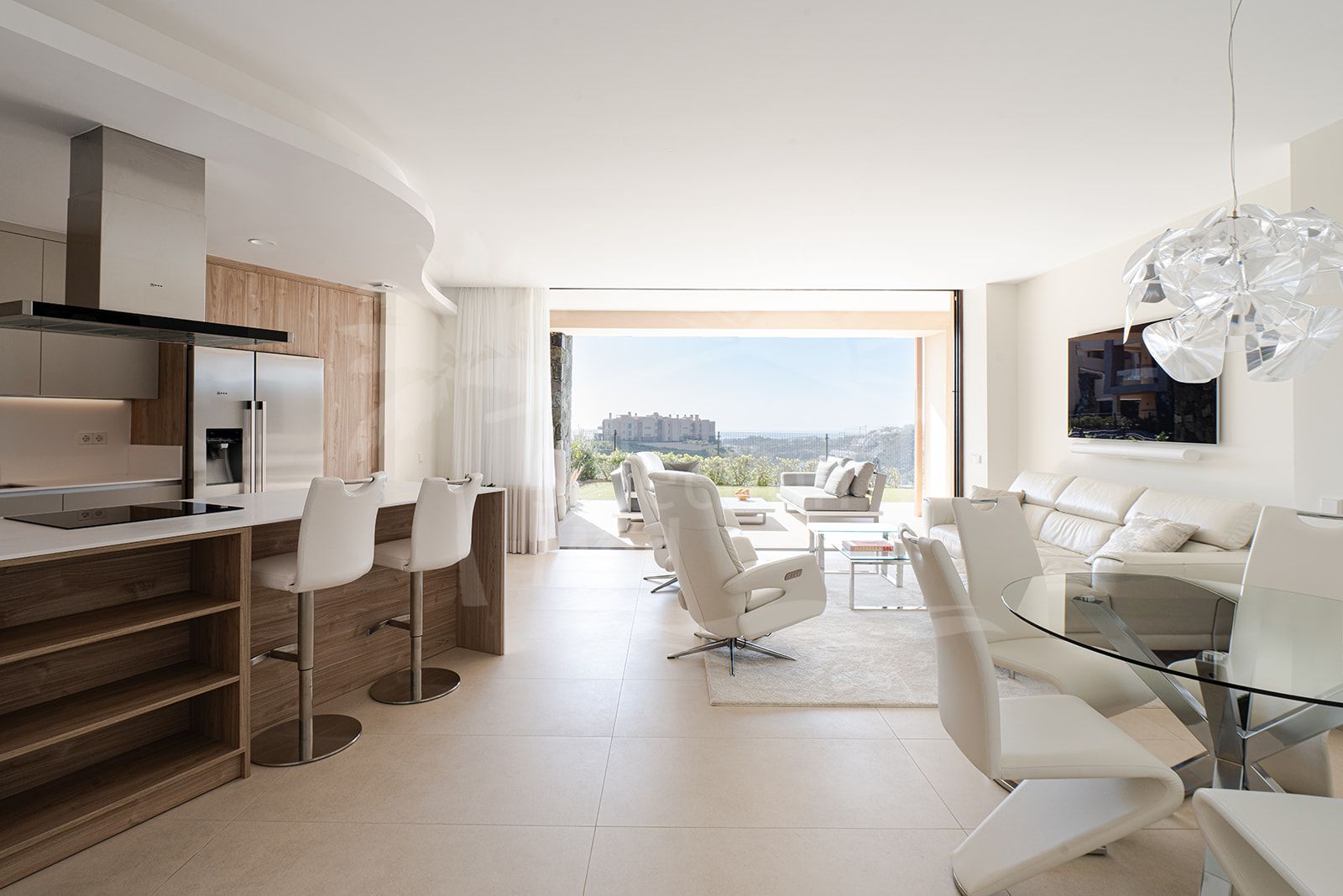 El apartamento destaca por su diseño contemporáneo y acabados de alta calidad en todo el espacio, incluyendo una zona de estar de planta abierta que fluye sin esfuerzo hacia una amplia terraza—perfecta para cenar al aire libre y disfrutar de las impresionantes vistas. Una cocina completamente equipada, con electrodomésticos de primera línea y una barra de desayuno, sirve como un espacio funcional y un punto de encuentro para amigos y familia.