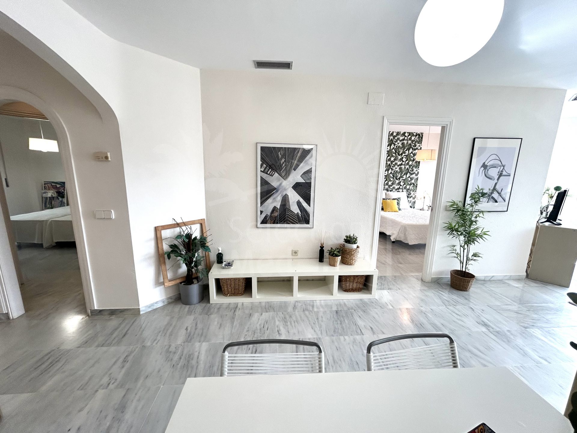 Excelente apartamento de 2 dormitorios y 2 baños junto al Golf Rio Real. Amplitud y luminosidad en el salón con gran terraza y vistas abiertas hacia el Golf. muy fácilmente se hacen 3 habitaciones; Dormitorio con baño en suite y otro dormitorio con terraza cerrada que puede transformarse en vestidor o despacho y un baño completo de invitados. La cocina con zona de barra y lavadero-tendedero. incluye plaza de parking subterránea. Elegante y bien conservado edificio con premio de arquitectura. Recinto cerrado y con jardines y piscina comunitarios, todo bien mantenido y fachada recientemente renovada. Merece la pena verlo!!!