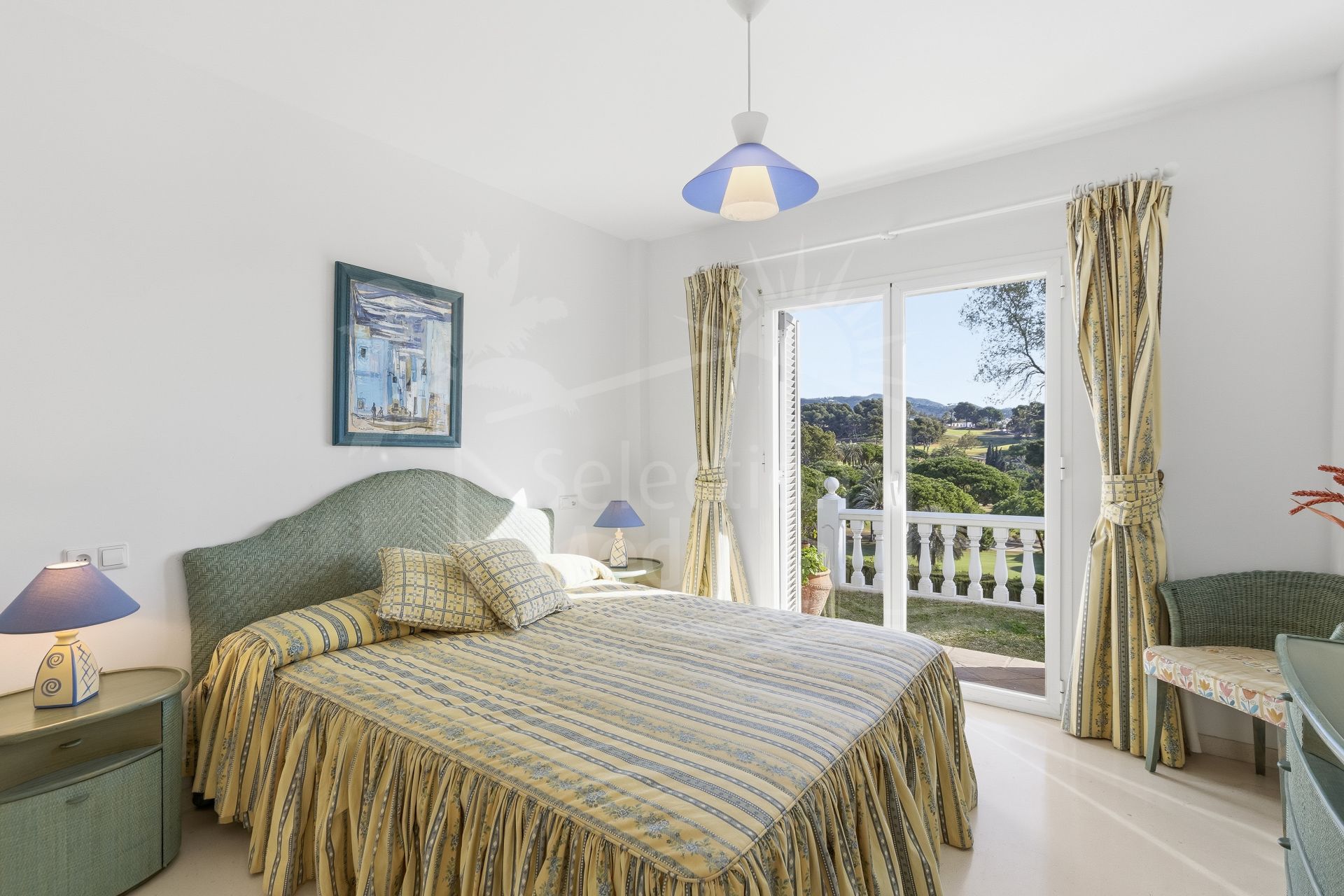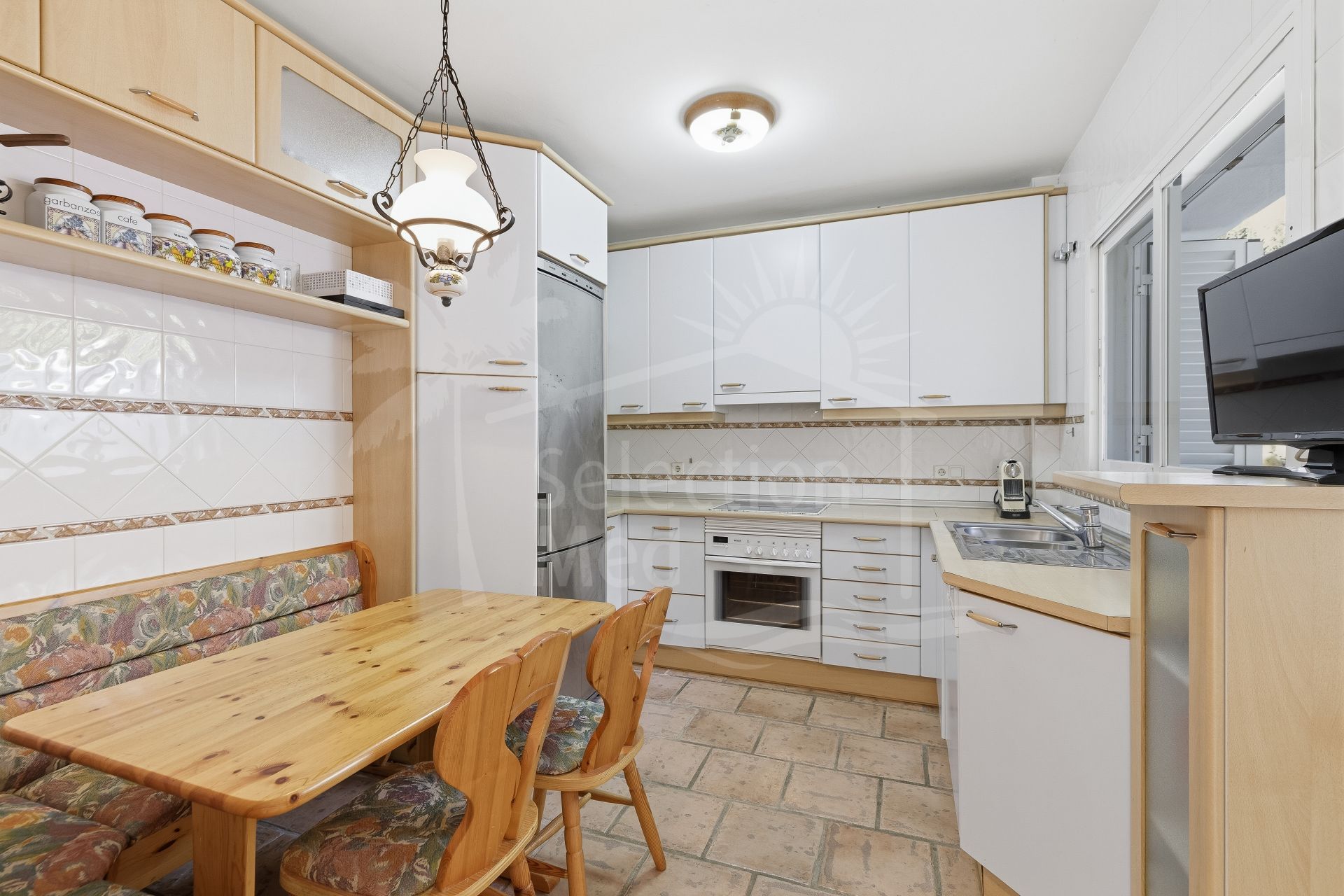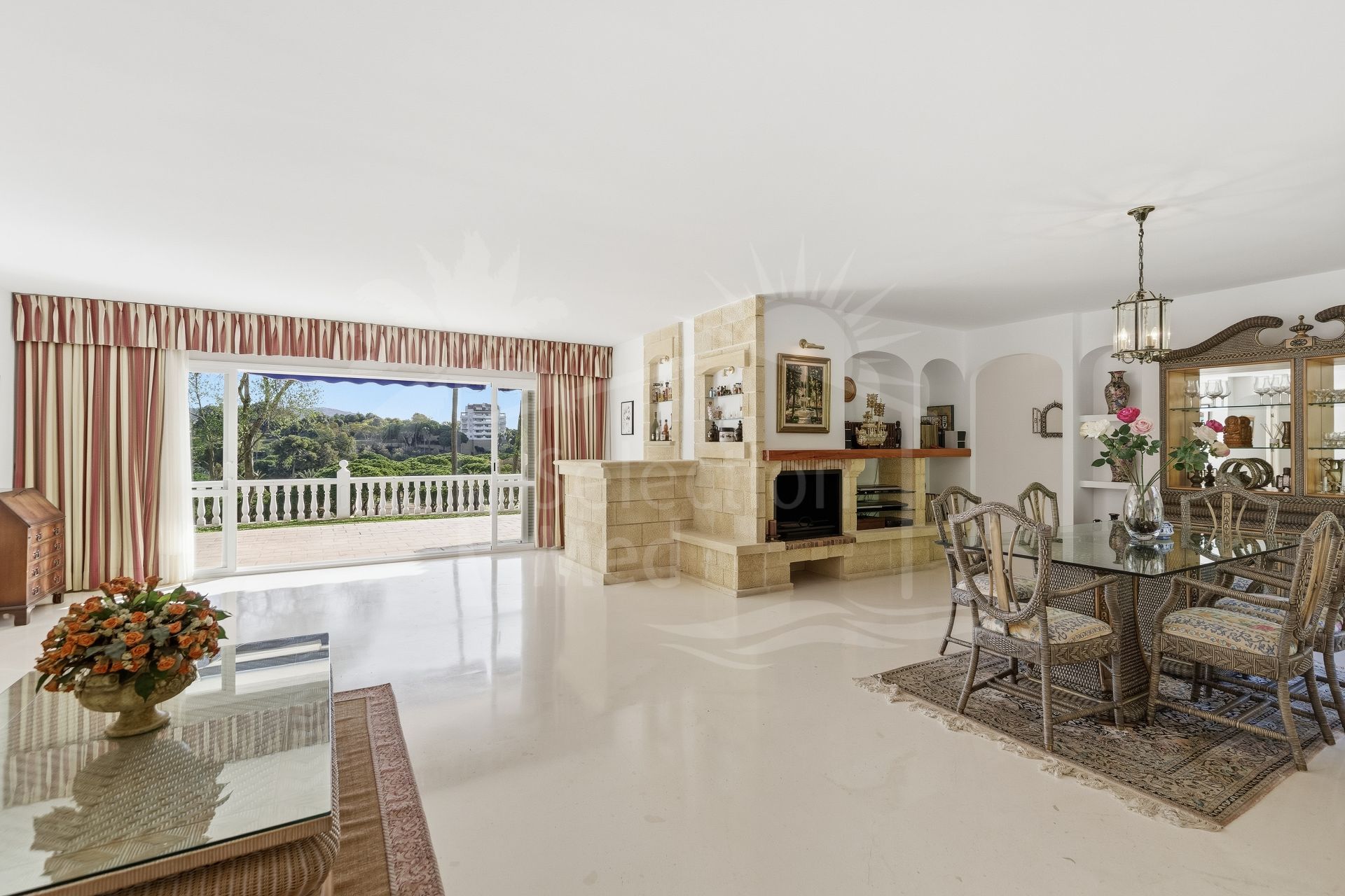El amplio salón-comedor con chimenea y grandes ventanales se abre directamente a una espaciosa terraza cubierta con agradables vistas al campo de golf y a las zonas verdes, creando un espacio perfecto para disfrutar del clima de Marbella durante todo el año. La vivienda también dispone de cocina independiente con zona de comedor.