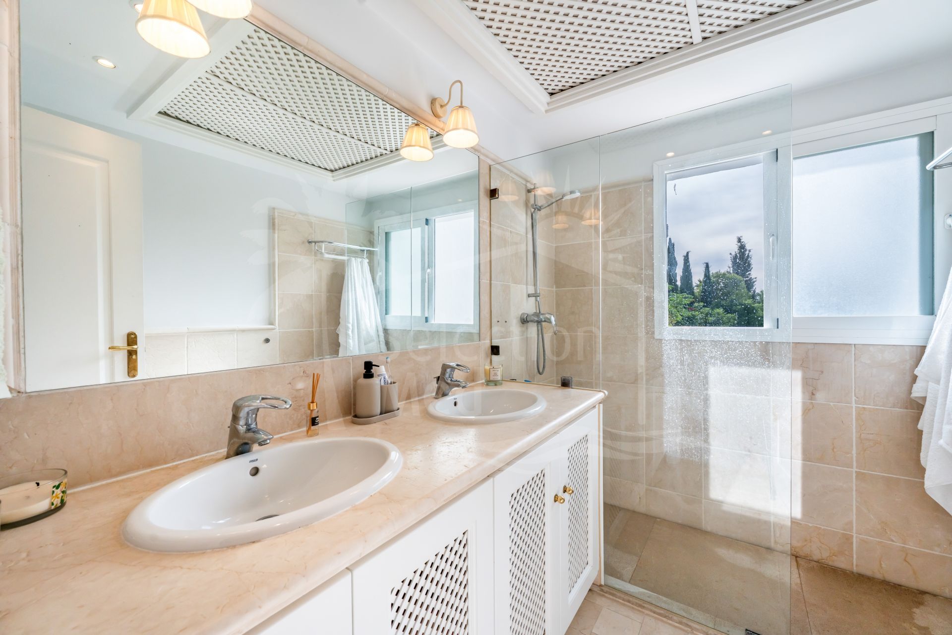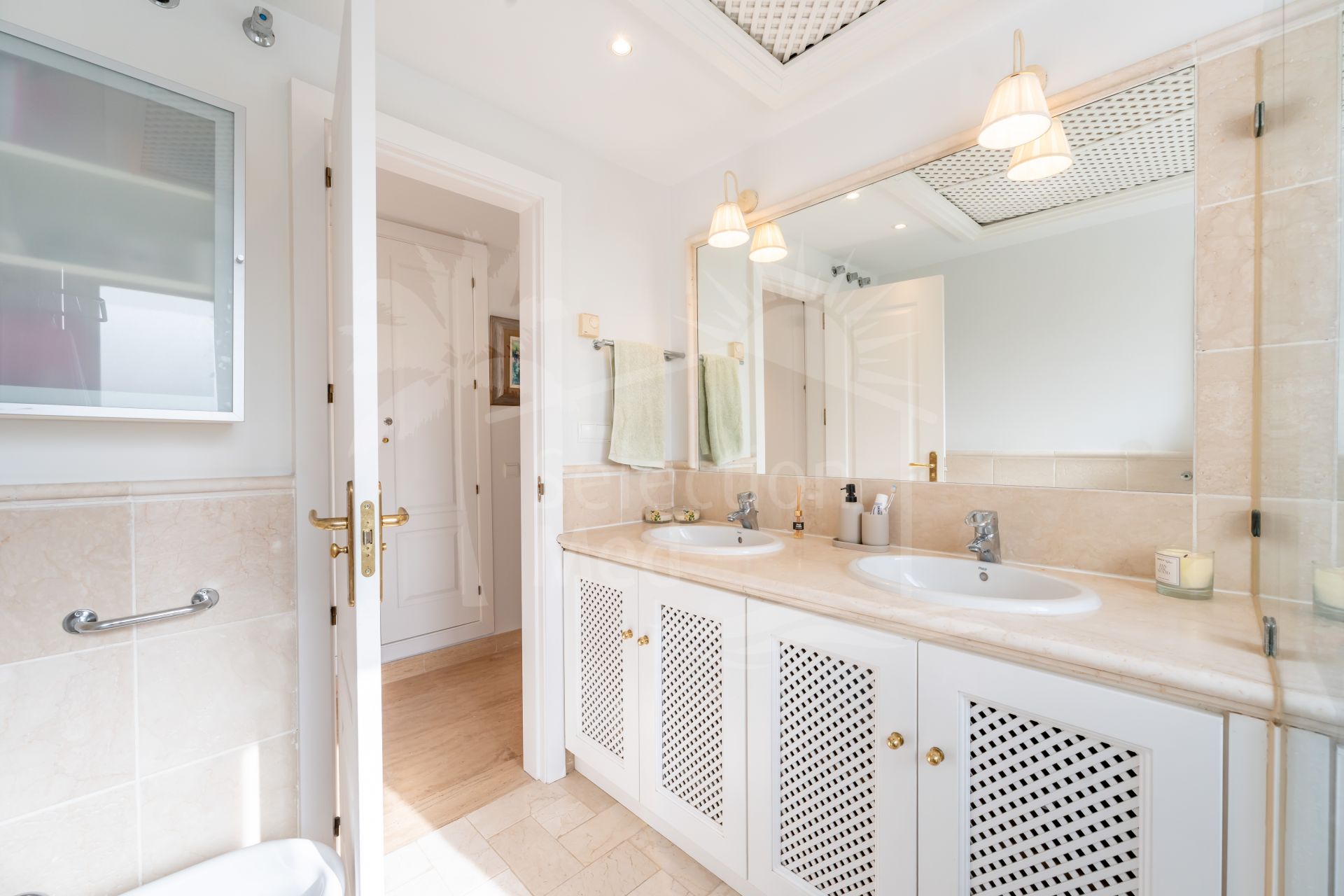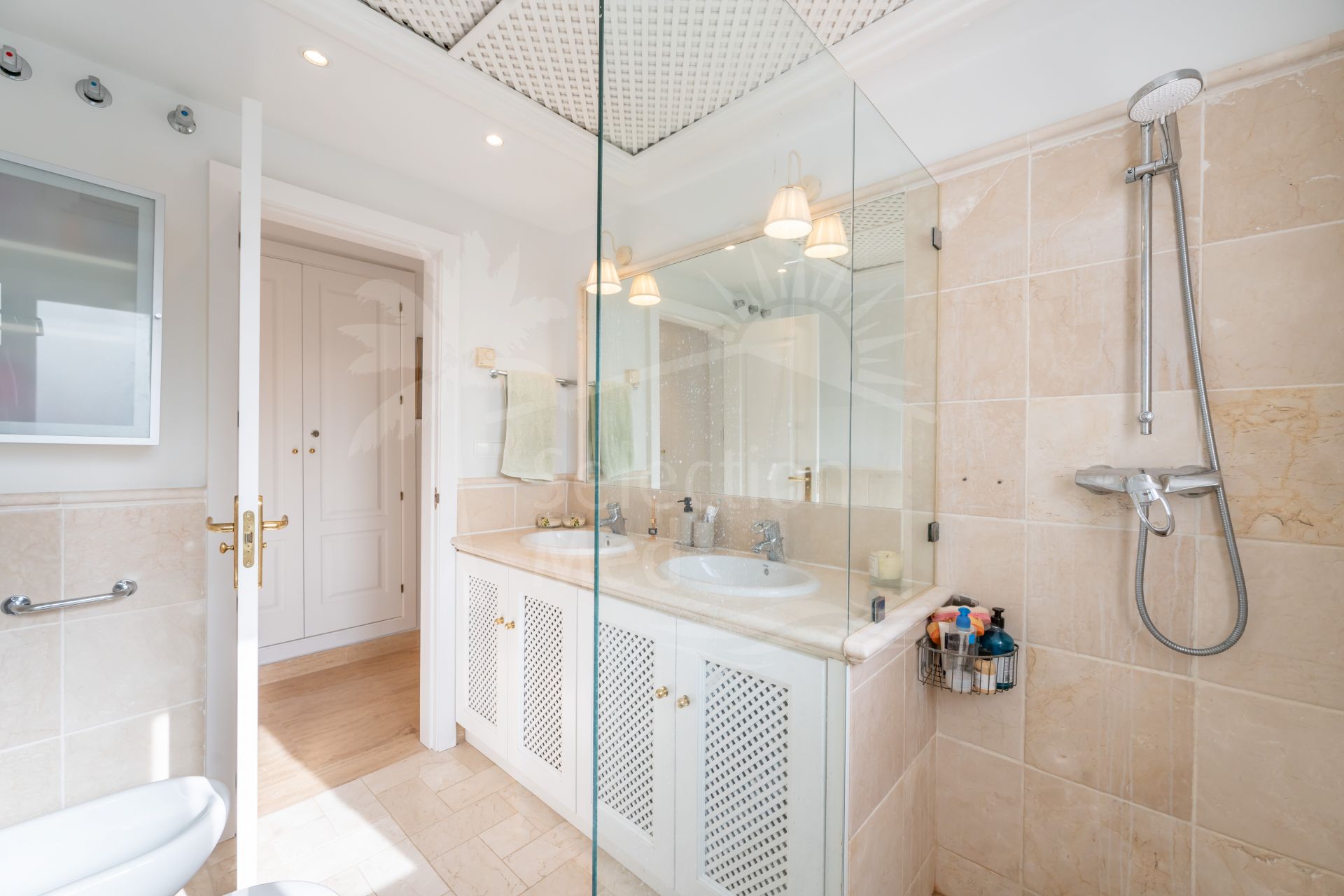 Este apartamento tiene dos amplios dormitorios con armarios empotrados, ambos con grandes ventanas que permiten la entrada de mucha luz natural. Los dos dormitorios comparten un cuarto de baño de gran tamaño, con mármol en todas partes.