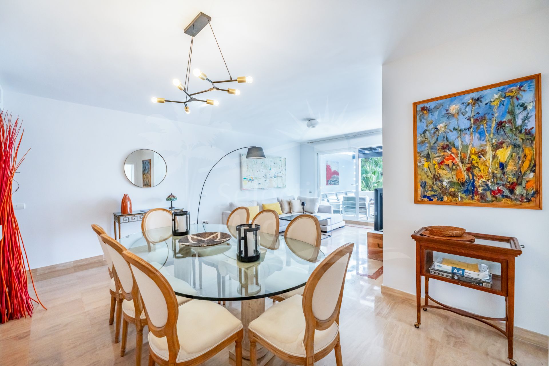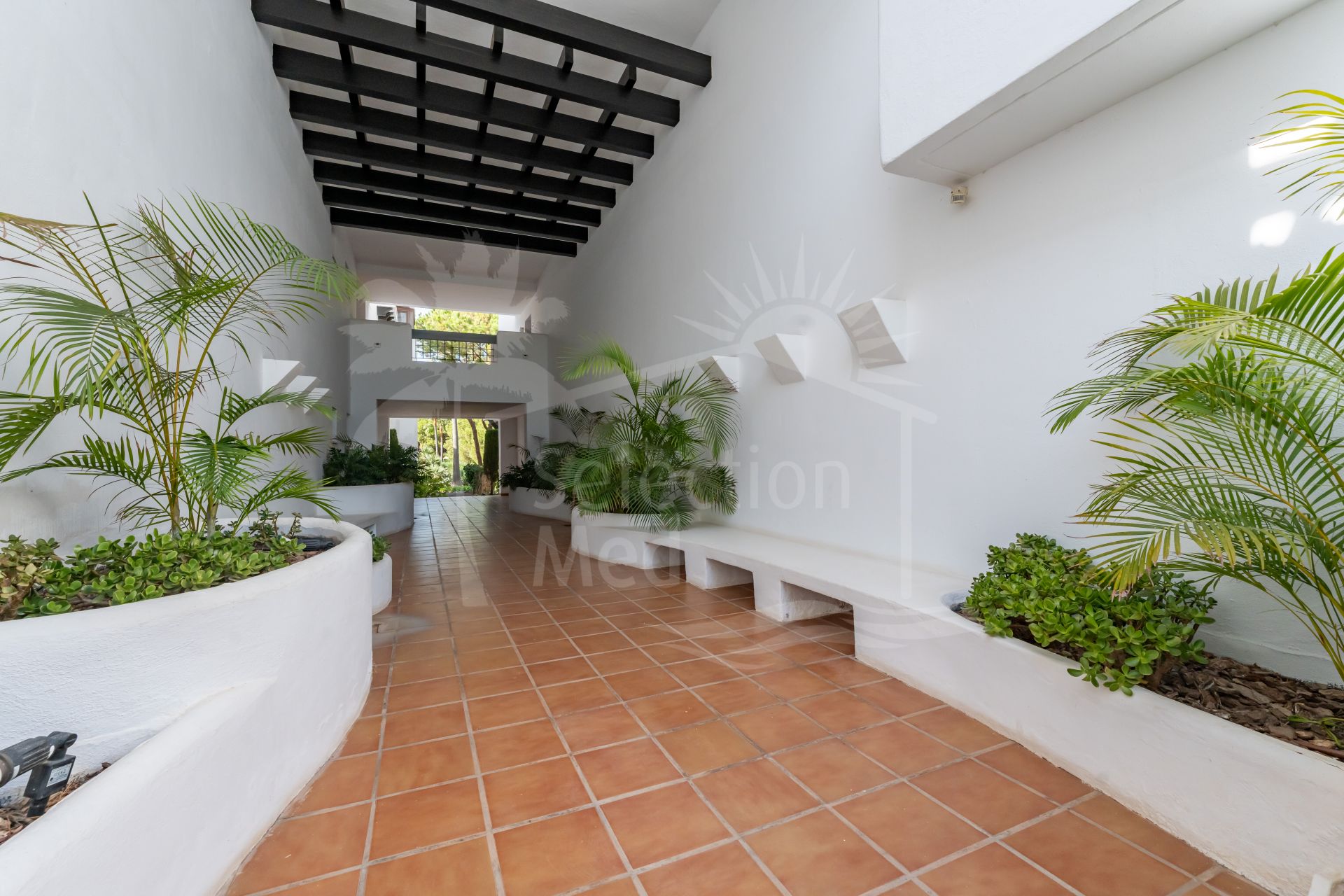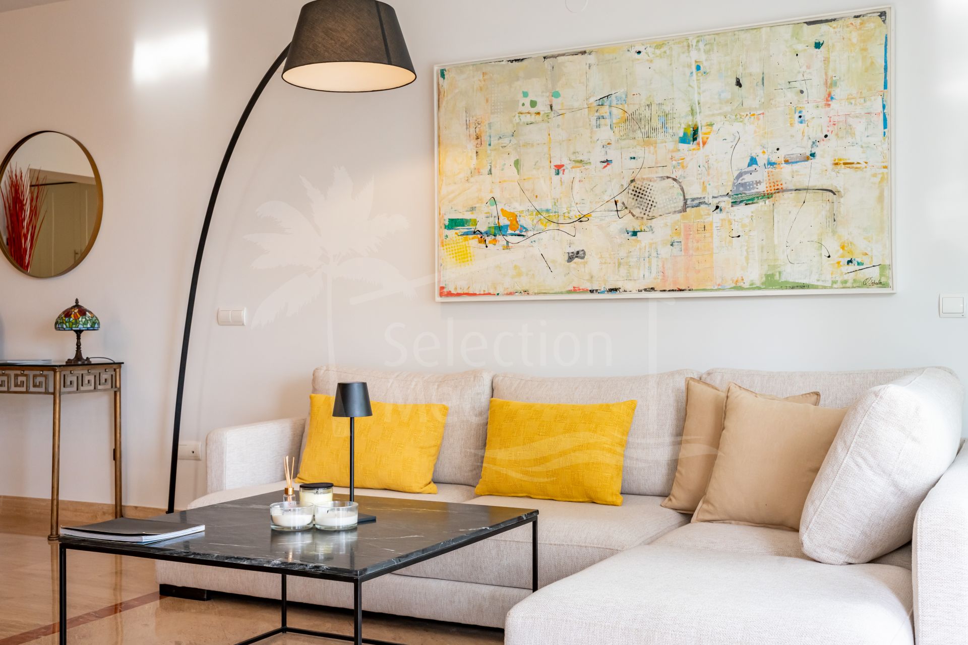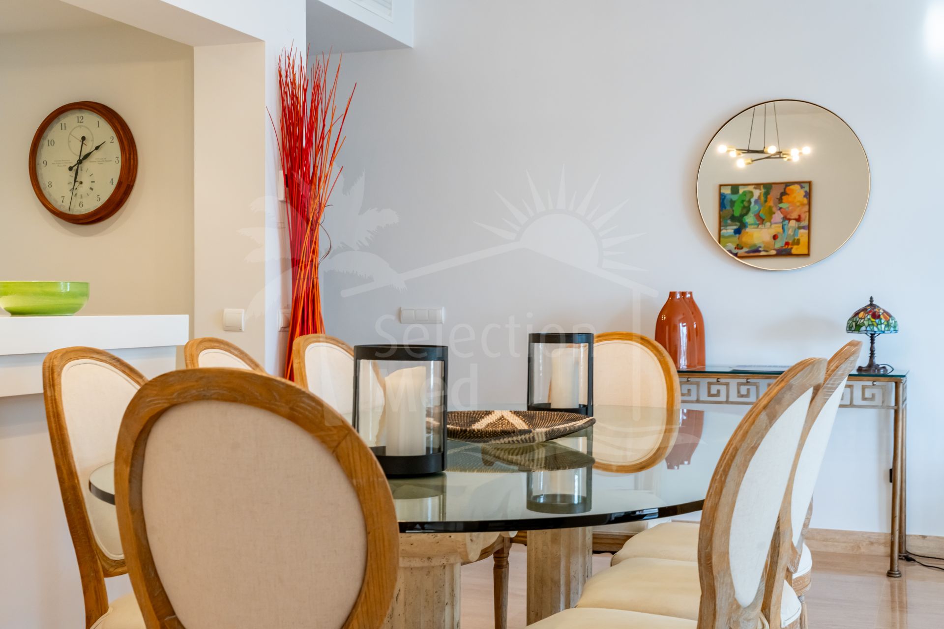 Originalmente era un amplio apartamento de un dormitorio, pero se reformó para convertirlo en uno de 2 dormitorios y un baño. Al entrar en el apartamento, le da la bienvenida un amplio vestíbulo abierto que conduce directamente al salón diáfano, decorado con muebles y accesorios de alta gama. A la derecha de la entrada hay una bonita cocina blanca que da al comedor y al salón. Si se sigue por el salón, se llega a la amplia y preciosa terraza que da a la piscina y al sur.