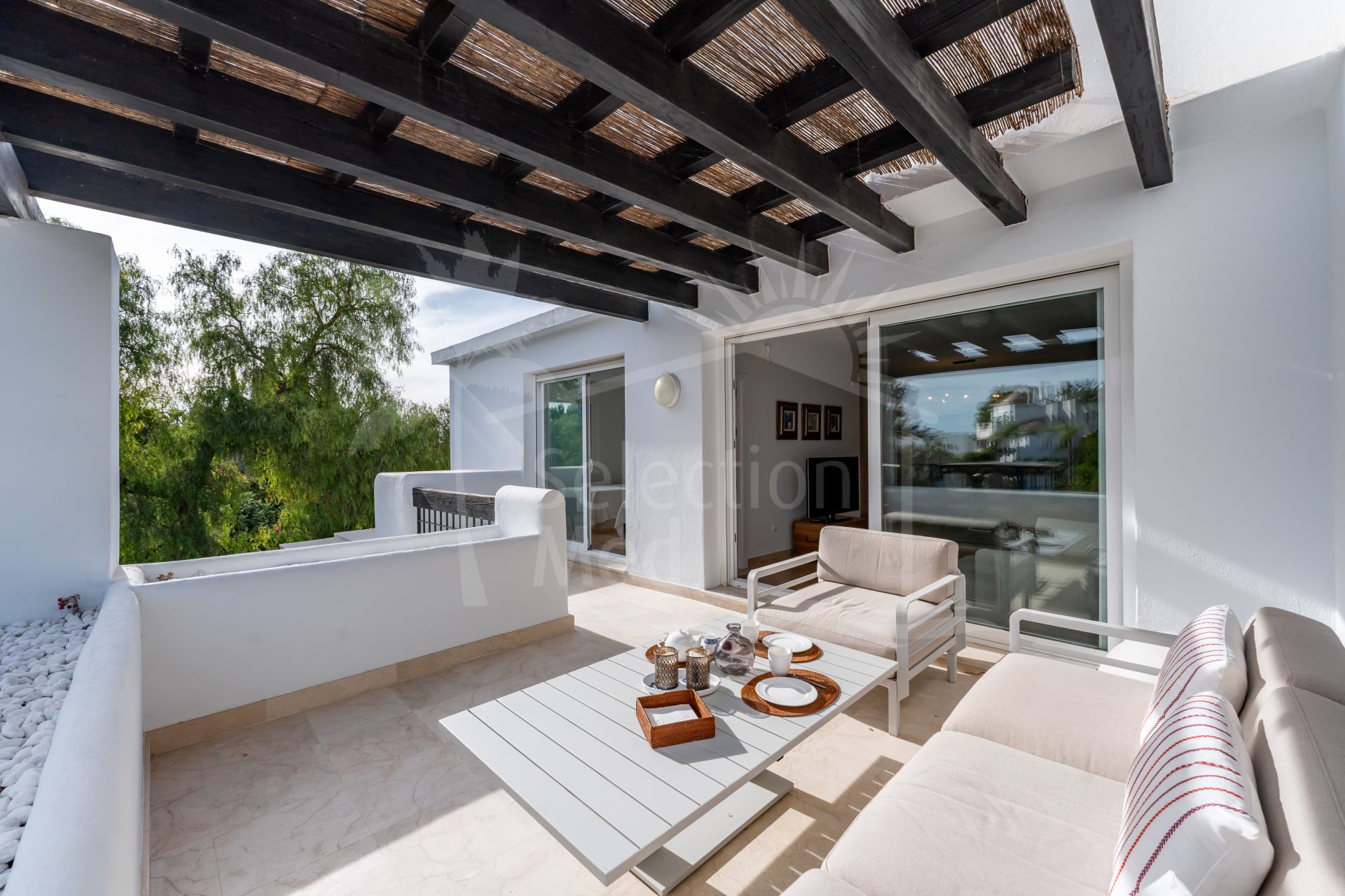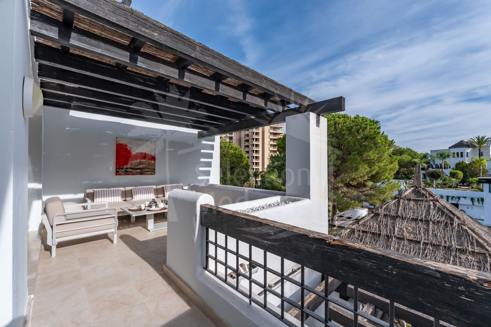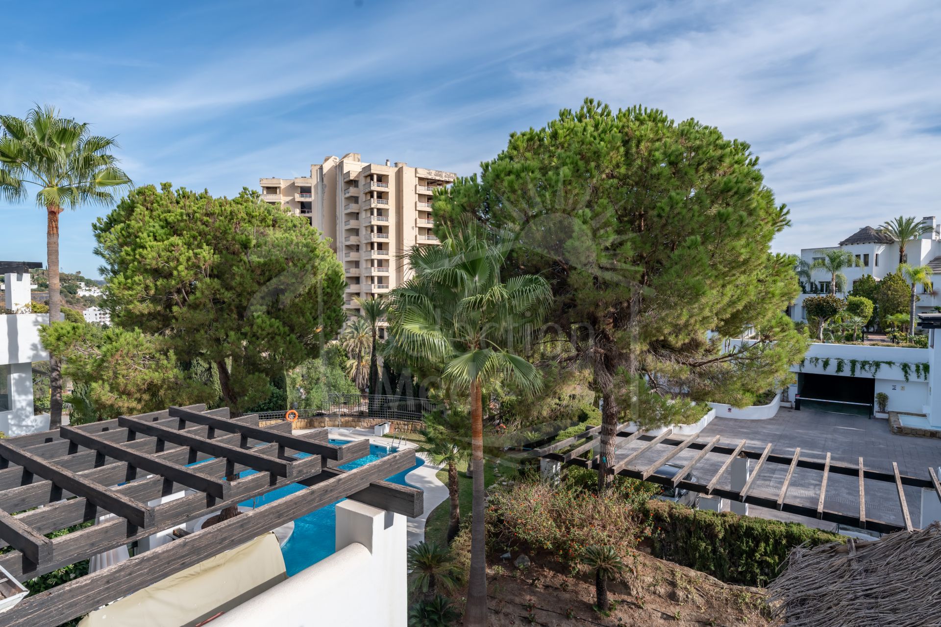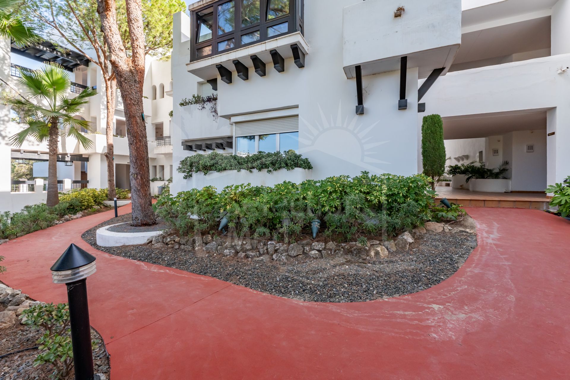 Originalmente era un amplio apartamento de un dormitorio, pero se reformó para convertirlo en uno de 2 dormitorios y un baño. Al entrar en el apartamento, le da la bienvenida un amplio vestíbulo abierto que conduce directamente al salón diáfano, decorado con muebles y accesorios de alta gama. A la derecha de la entrada hay una bonita cocina blanca que da al comedor y al salón. Si se sigue por el salón, se llega a la amplia y preciosa terraza que da a la piscina y al sur.