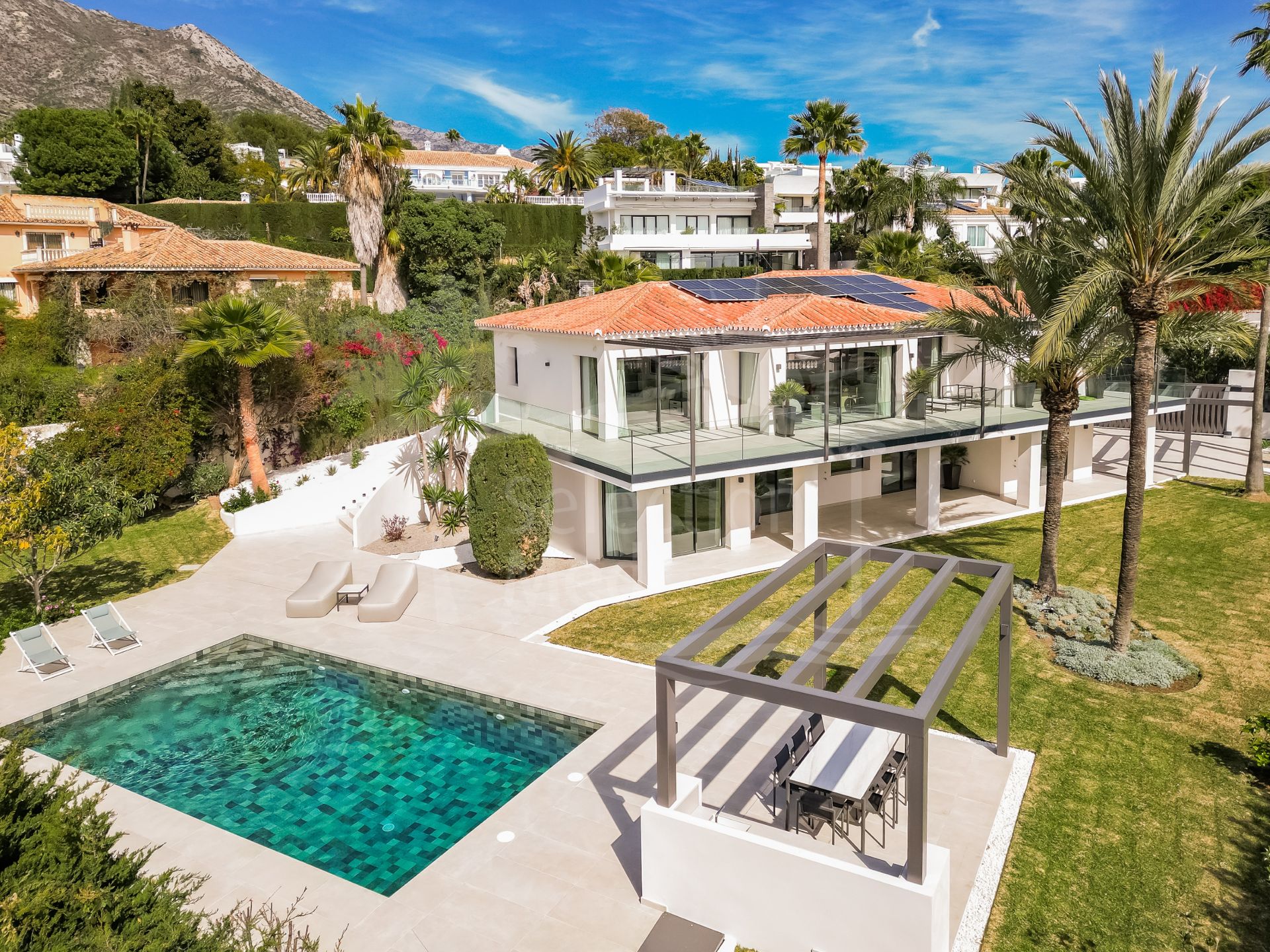 Esta excepcional villa de lujo se encuentra en la prestigiosa zona de Rocío de Nagüeles, enclavada en la codiciada Milla de Oro de Marbella. Con cinco amplios dormitorios y cinco baños, esta propiedad a estrenar personifica la sofisticación y el confort, con una superficie construida de 571,95 m² en una generosa parcela de 1.420 m². Su ubicación elevada ofrece impresionantes vistas panorámicas al mar, las montañas y el paisaje circundante, mientras que su proximidad a servicios, colegios y al centro de Marbella la convierte en una opción atractiva tanto para familias como para compradores exigentes.