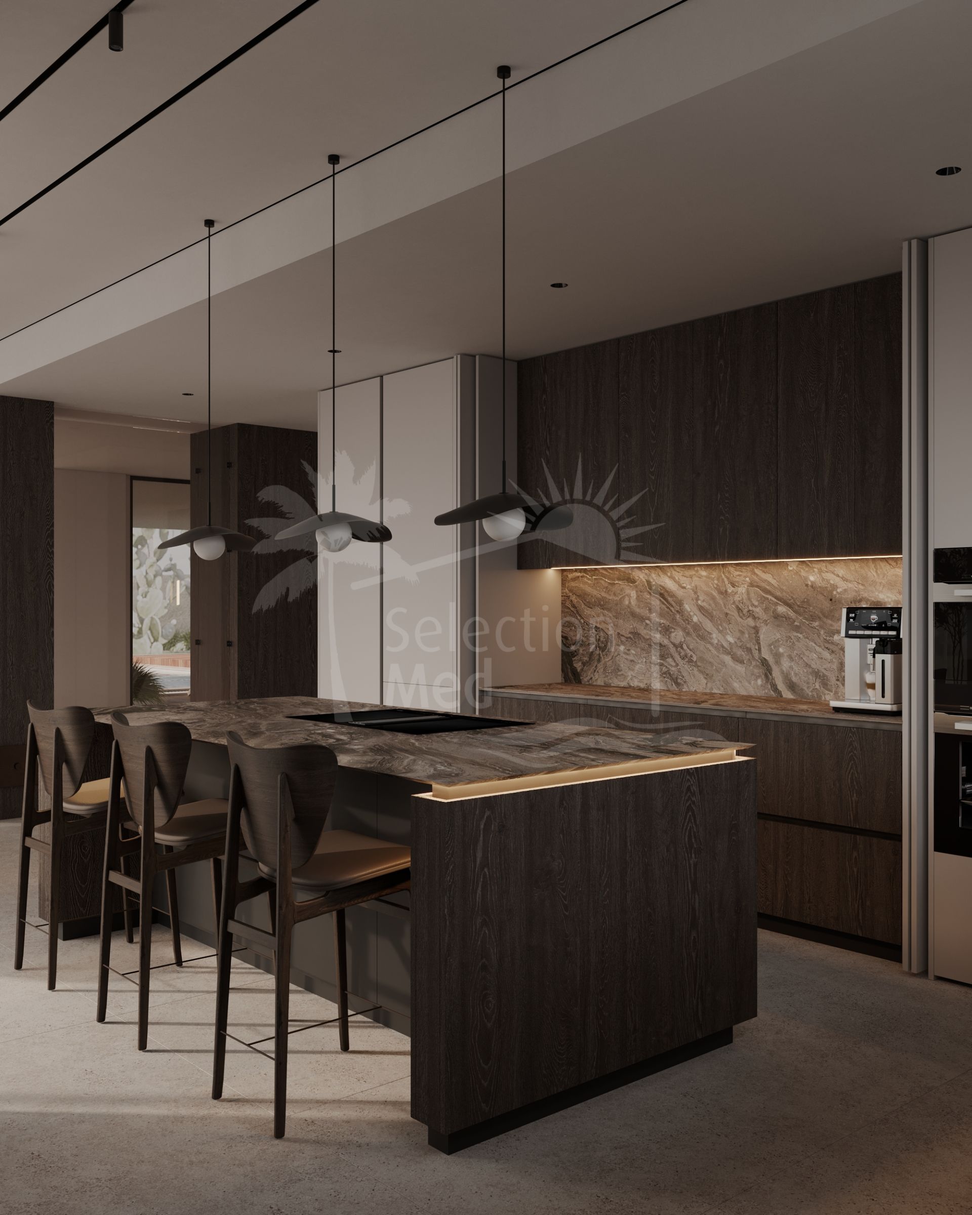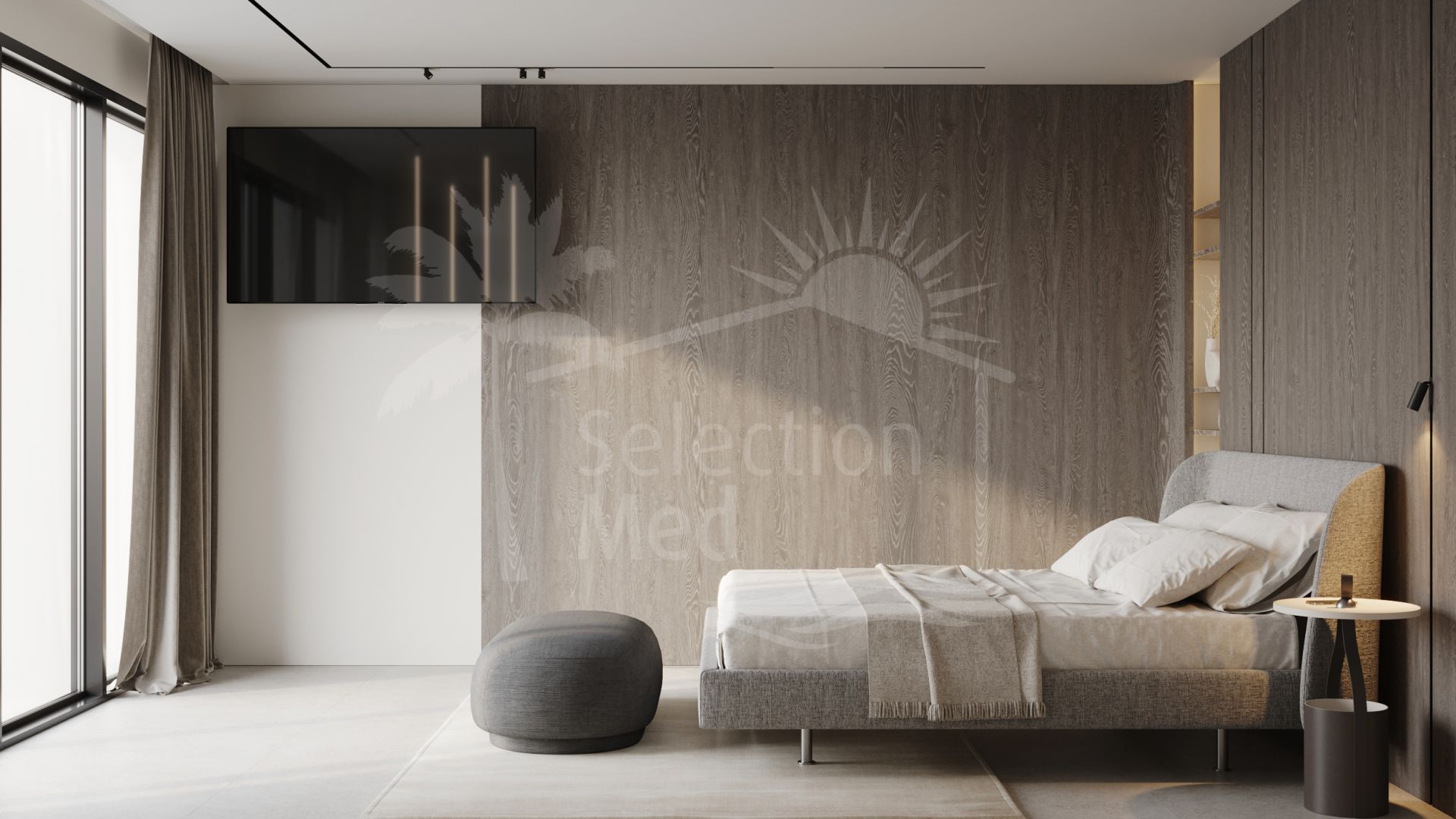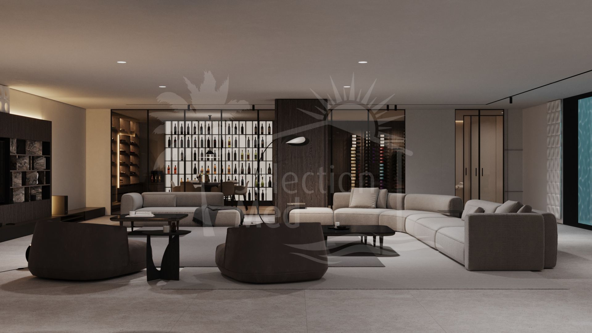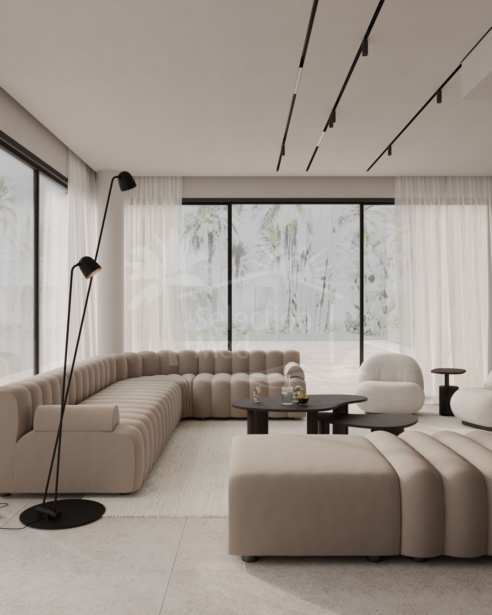 La villa cuenta con ocho dormitorios con baño en suite, todos con armarios empotrados. El dormitorio principal incluye vestidor. El diseño interior neutro, los materiales naturales y los ventanales de suelo a techo crean zonas de estar luminosas y abiertas. La cocina, el comedor y la sala de estar de planta abierta ofrecen una distribución funcional, con grandes puertas correderas que conectan con terrazas, un jardín privado y una piscina.