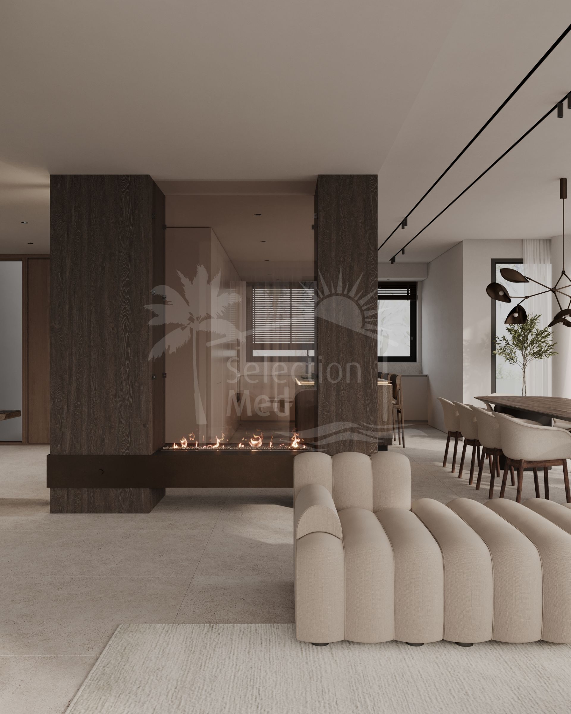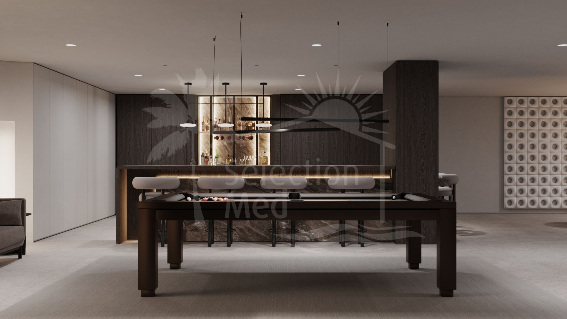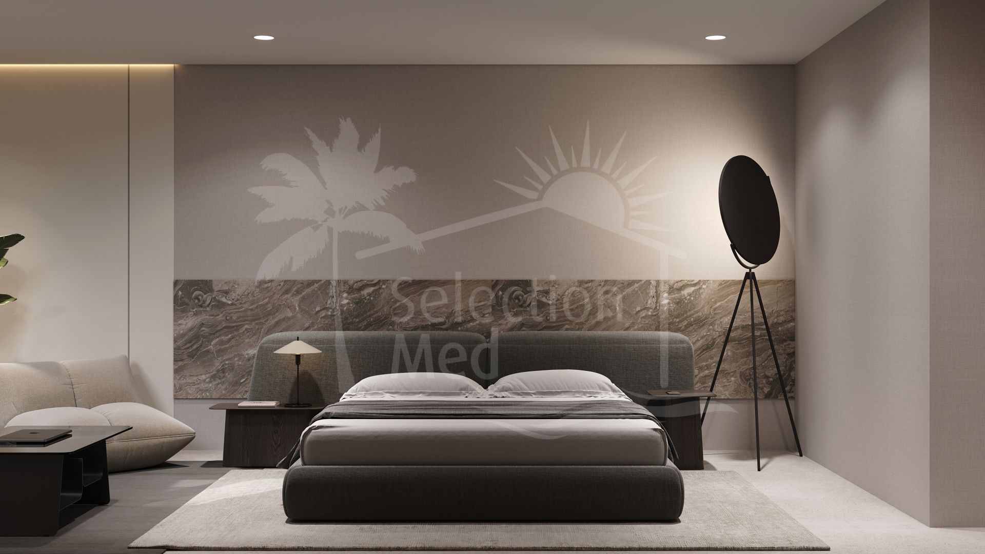La villa cuenta con ocho dormitorios con baño en suite, todos con armarios empotrados. El dormitorio principal incluye vestidor. El diseño interior neutro, los materiales naturales y los ventanales de suelo a techo crean zonas de estar luminosas y abiertas. La cocina, el comedor y la sala de estar de planta abierta ofrecen una distribución funcional, con grandes puertas correderas que conectan con terrazas, un jardín privado y una piscina.