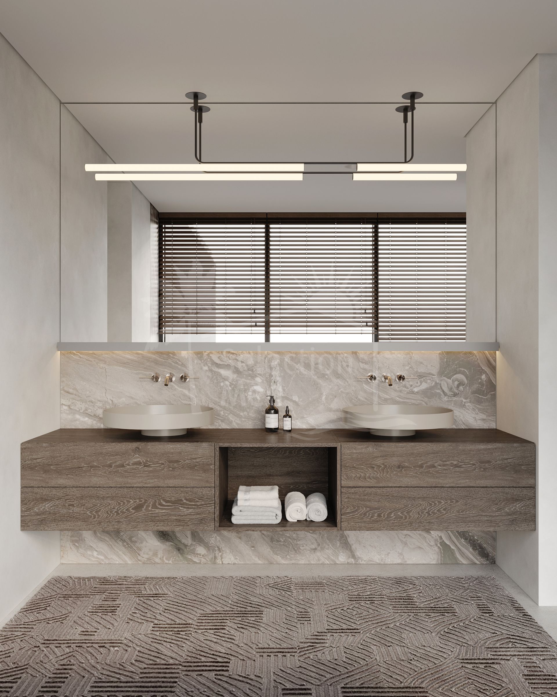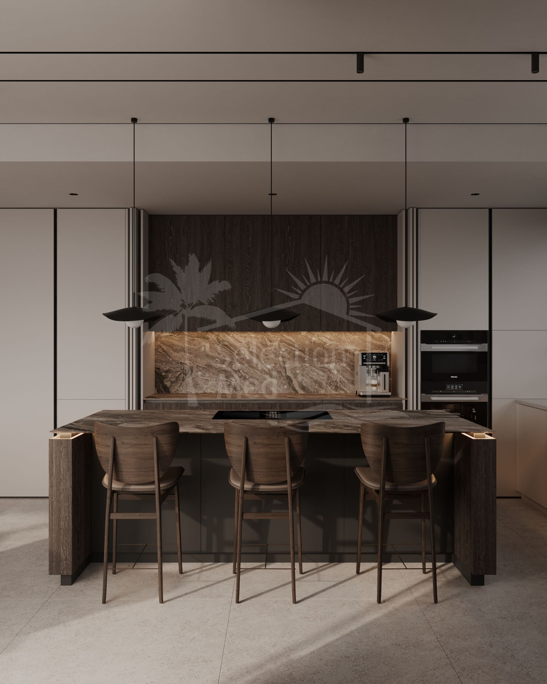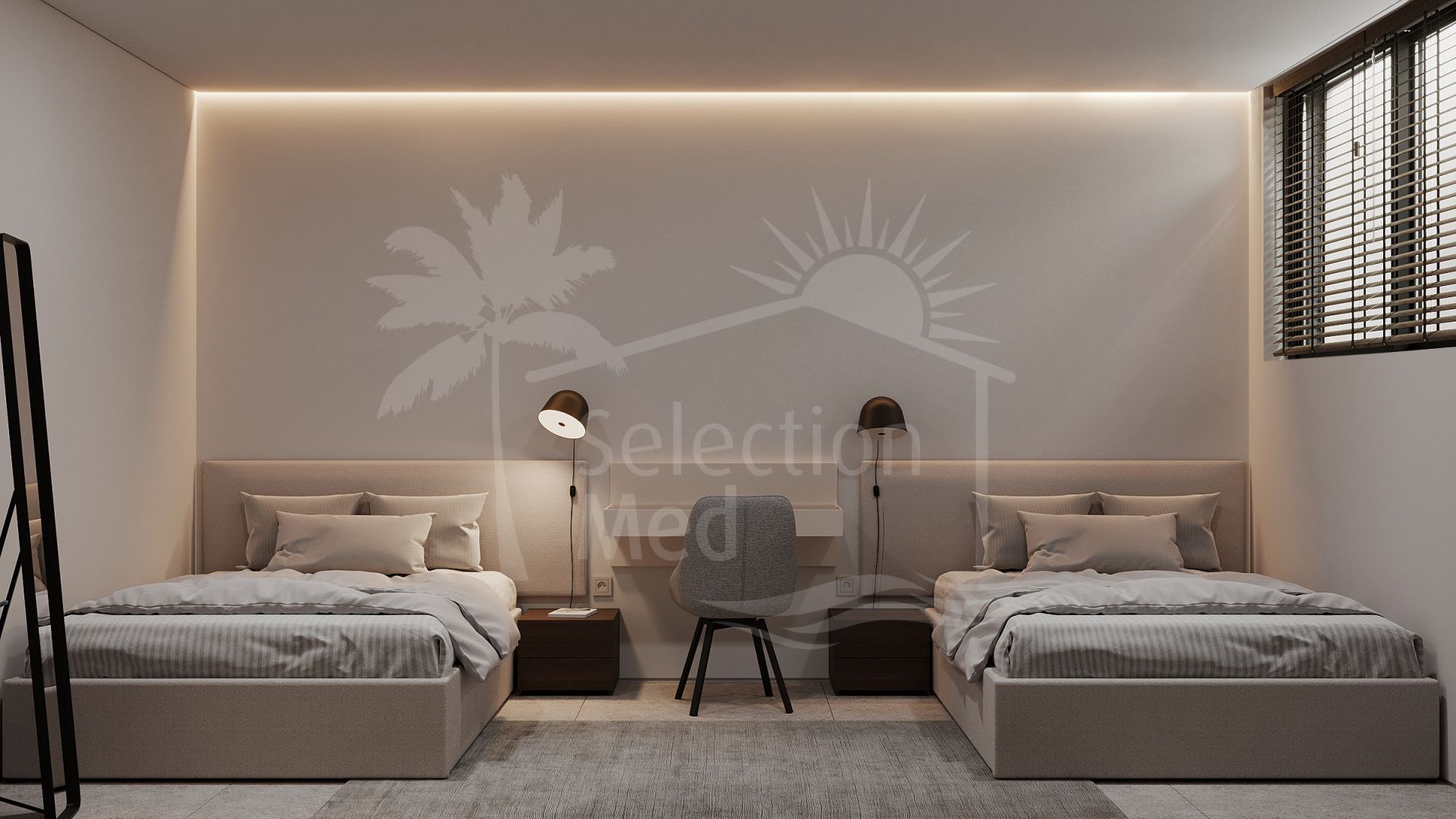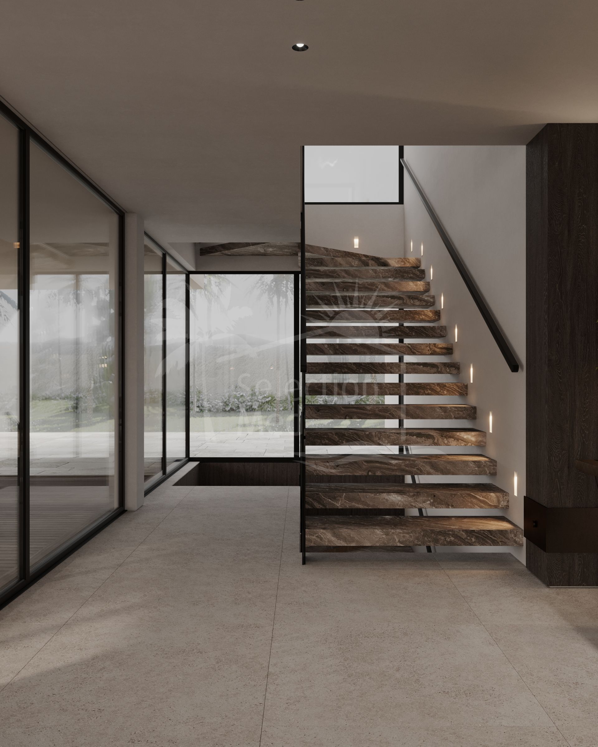 La villa cuenta con ocho dormitorios con baño en suite, todos con armarios empotrados. El dormitorio principal incluye vestidor. El diseño interior neutro, los materiales naturales y los ventanales de suelo a techo crean zonas de estar luminosas y abiertas. La cocina, el comedor y la sala de estar de planta abierta ofrecen una distribución funcional, con grandes puertas correderas que conectan con terrazas, un jardín privado y una piscina.