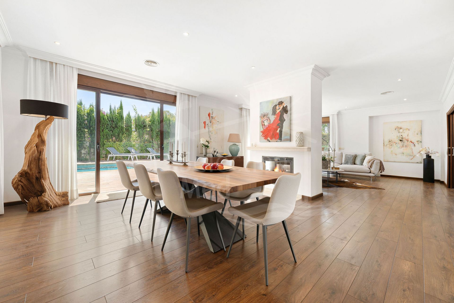 Entrar a una hermosa cocina abierta, comedor y sala de estar, donde la luz natural inunda el espacio a través de grandes puertas de vidrio que se abren directamente a la terraza y la piscina. Ya sea que estés entretenido o disfrutando de una comida familiar tranquila, el flujo interior sin costuras crea un ambiente relajado y sociable. Una acogedora chimenea añade calor y carácter, haciendo que el espacio invita todo el año.
