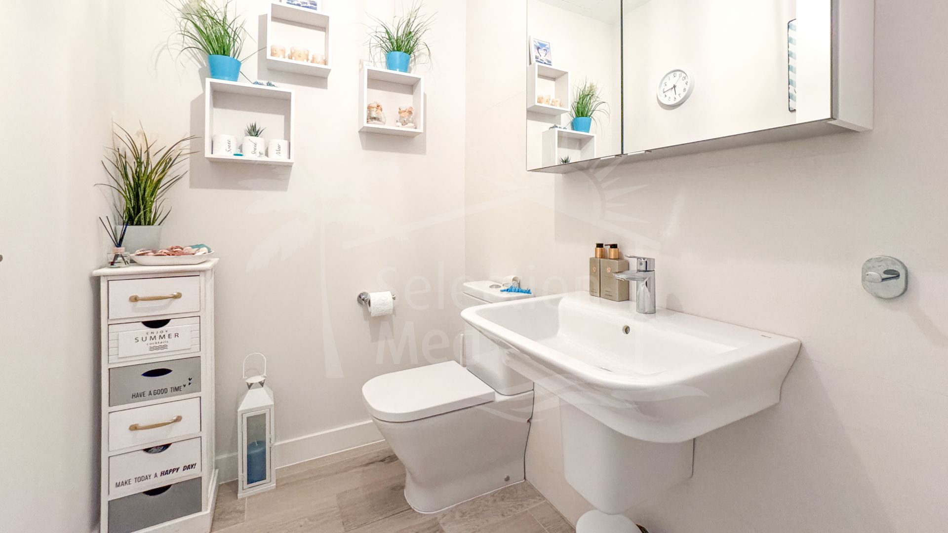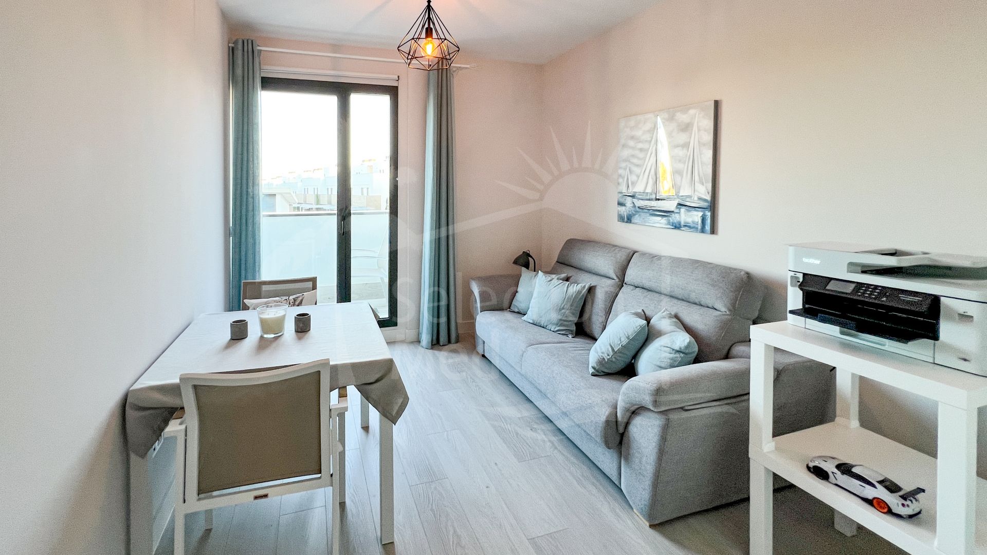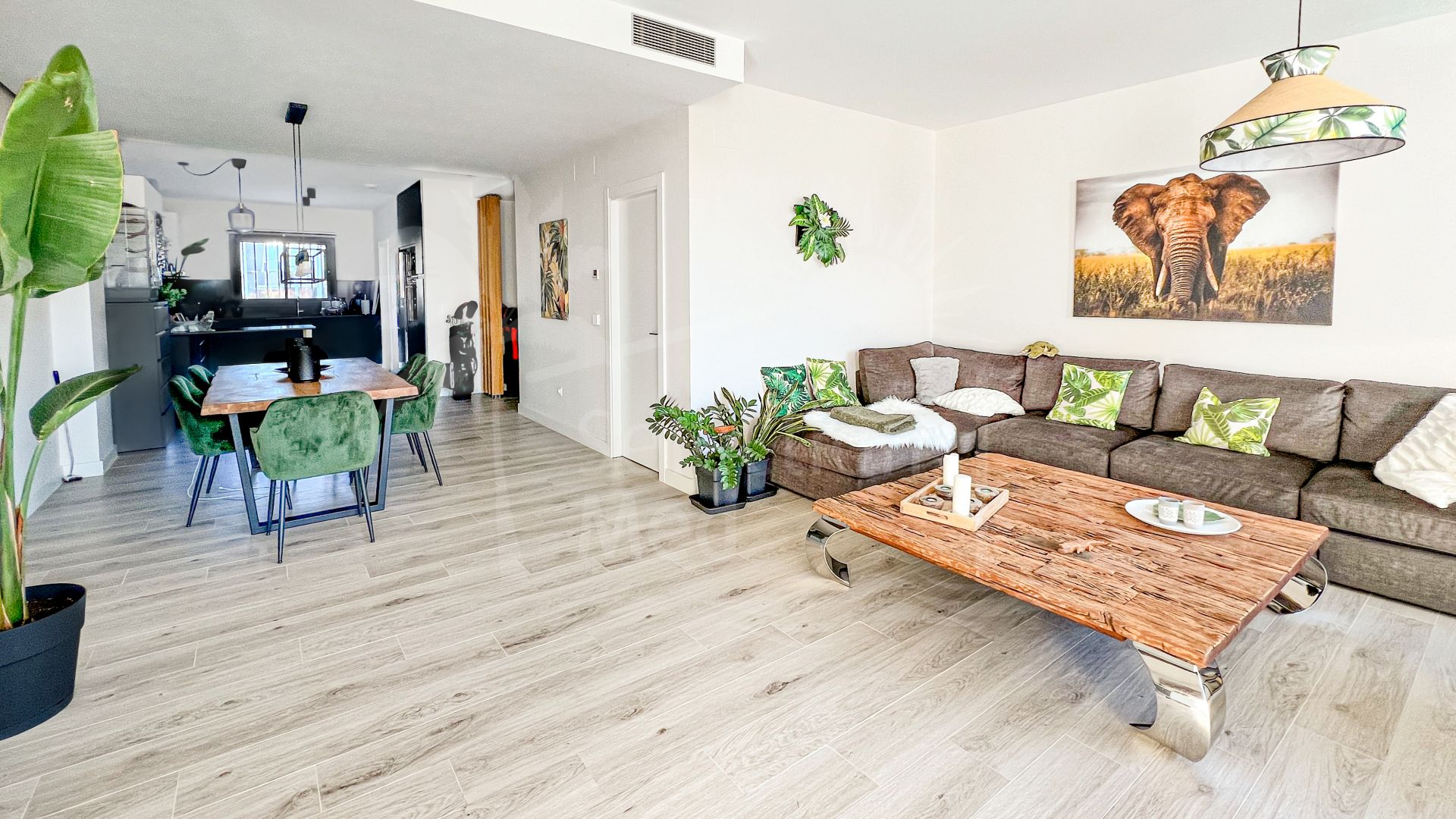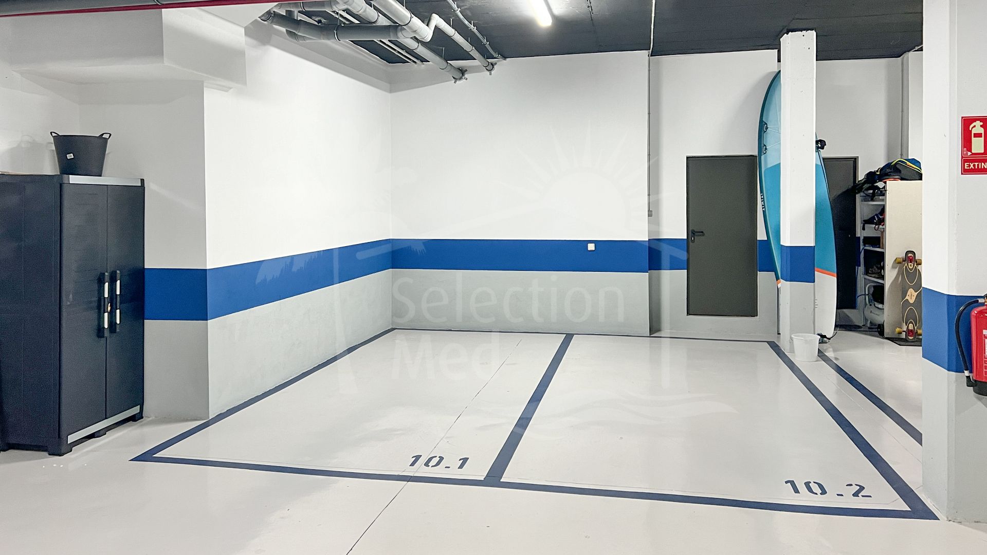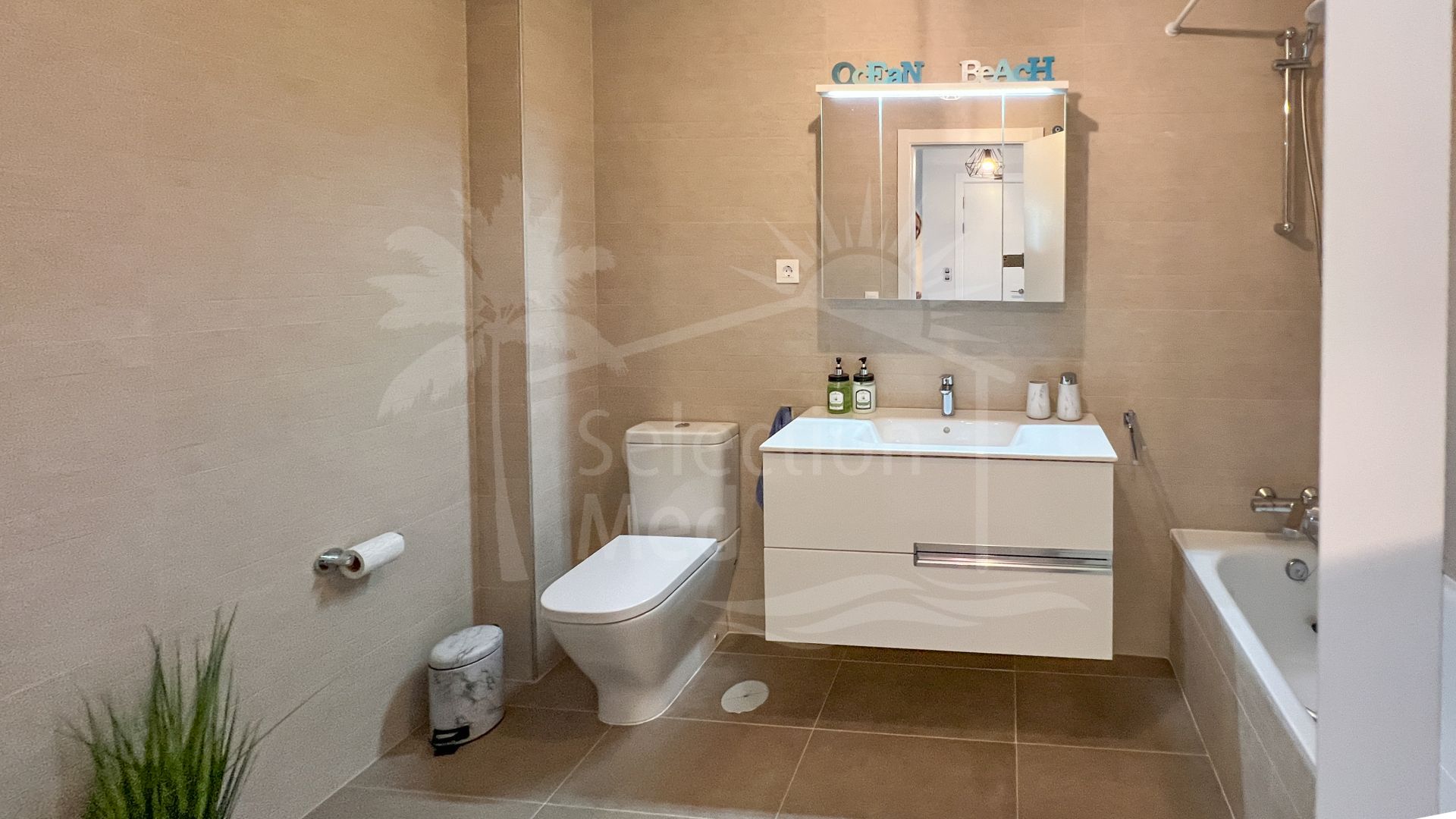 En la planta superior se encuentra el dormitorio principal con baño en suite, además de dos dormitorios adicionales con acceso a un balcón y vistas a la piscina comunitaria. La amplia azotea ofrece una impresionante vista panorámica hasta el mar. Muy práctico: la propiedad cuenta con acceso directo al garaje subterráneo y a un trastero privado. La urbanización cerrada incluye además piscina, gimnasio y sauna.