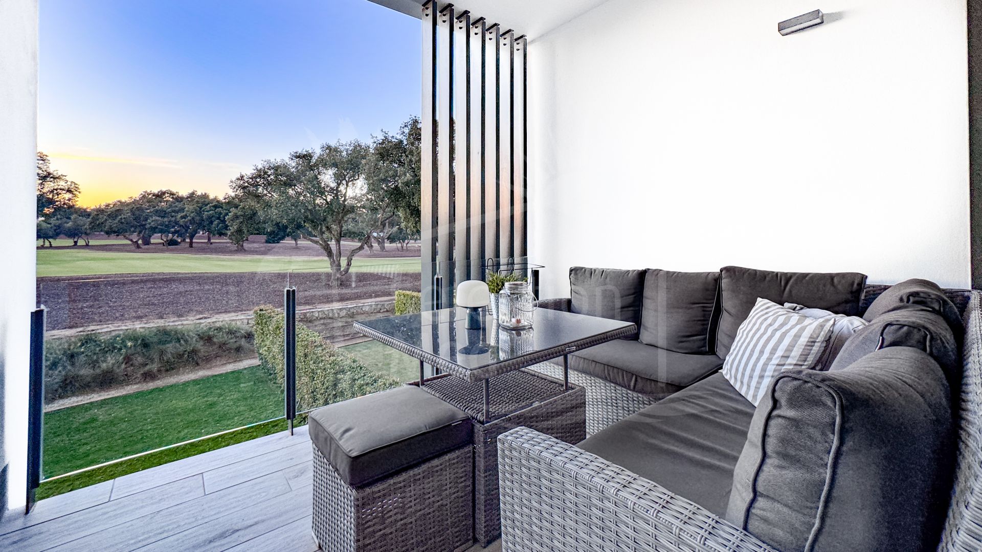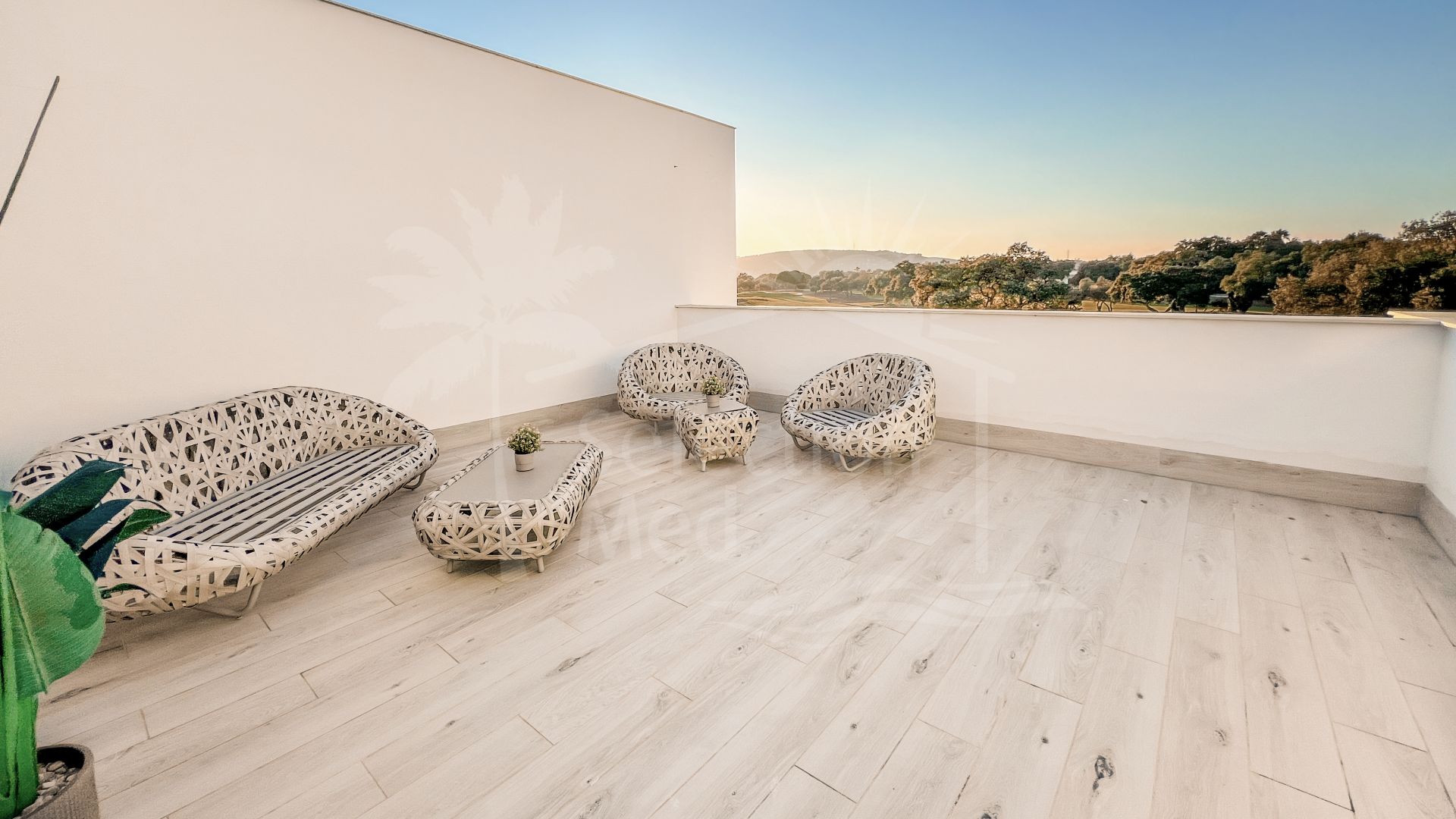 Esta moderna casa adosada, construida en 2022, ofrece una ubicación residencial excepcional junto al prestigioso San Roque Golf Club. Desde la terraza orientada al oeste se disfruta de una vista incomparable sobre los suaves fairways, rodeados de majestuosos alcornoques. La zona de estar de planta abierta, con cocina integrada, combina un diseño contemporáneo con un entorno natural.