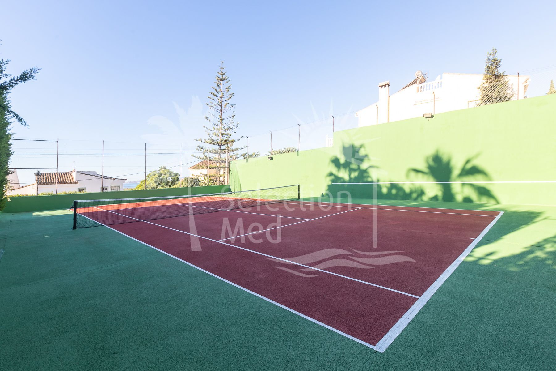 En el exterior, la propiedad ofrece auténticos espacios de disfrute. Destaca una espectacular piscina principal de 9 × 4 metros, ideal para refrescarse y crear recuerdos inolvidables, acompañada de una segunda piscina de 36 m² que aporta un extra de diversión y exclusividad. Para los amantes del deporte, la villa cuenta además con una zona deportiva con pista de tenis de aproximadamente 500 m², pensada para un estilo de vida activo.