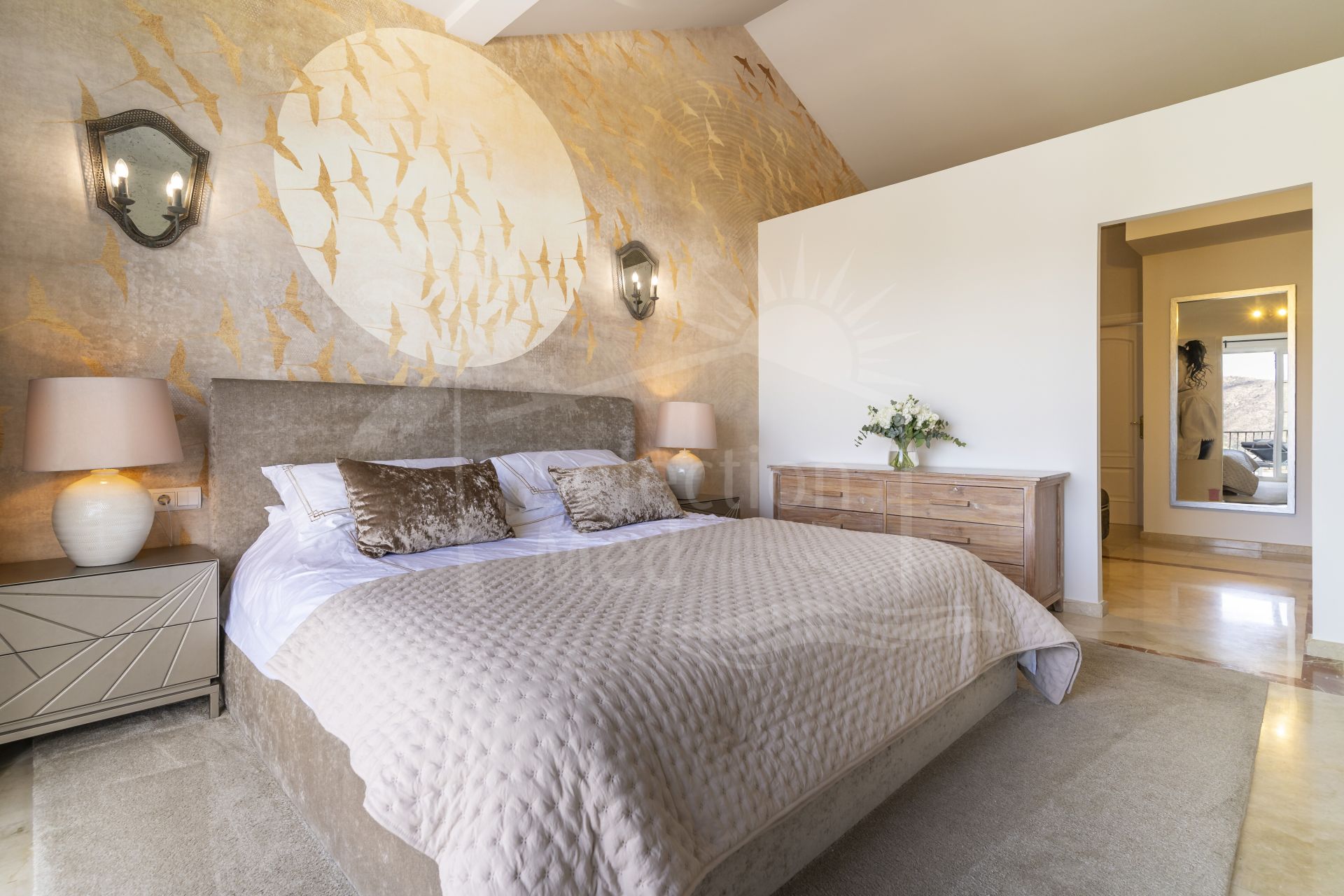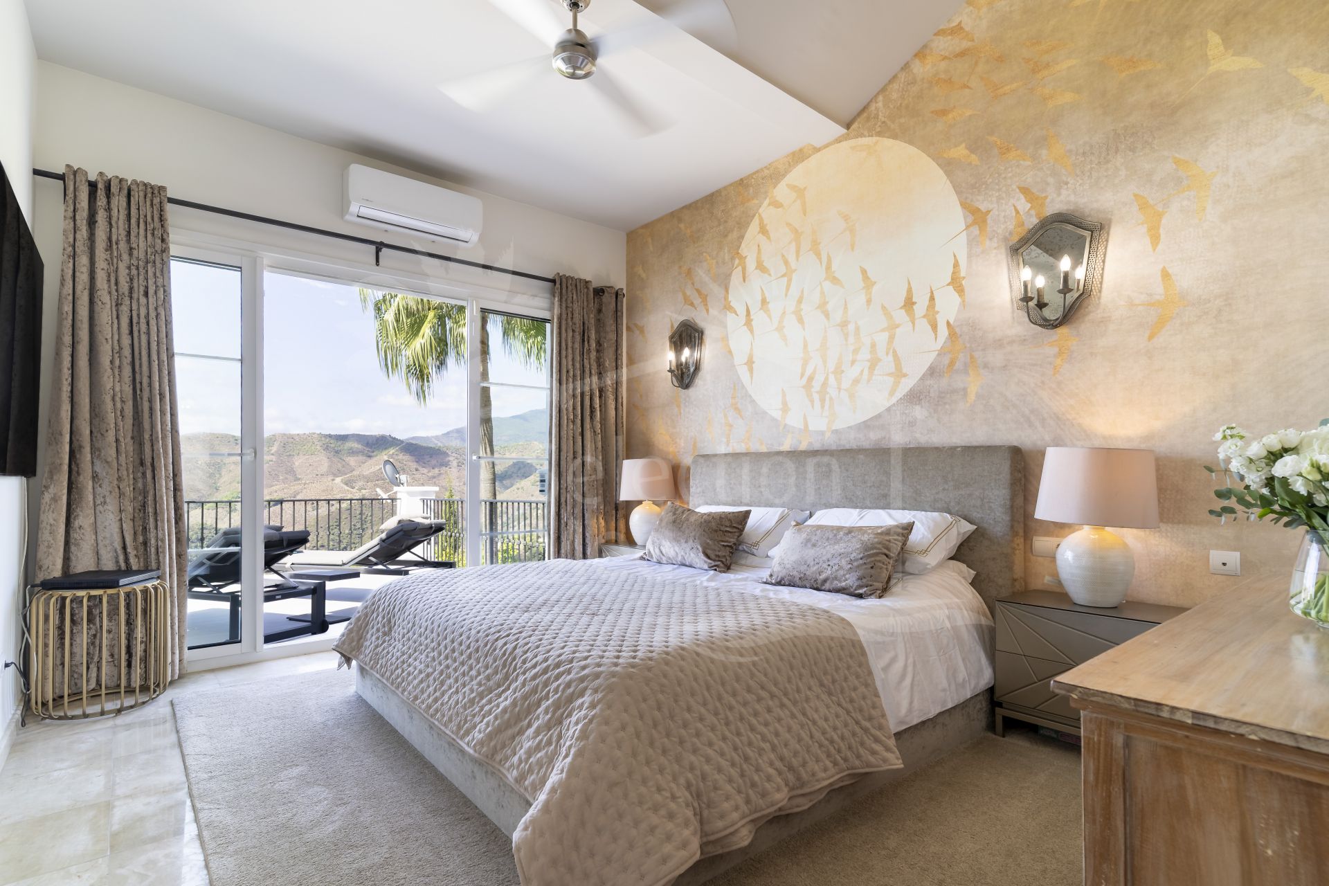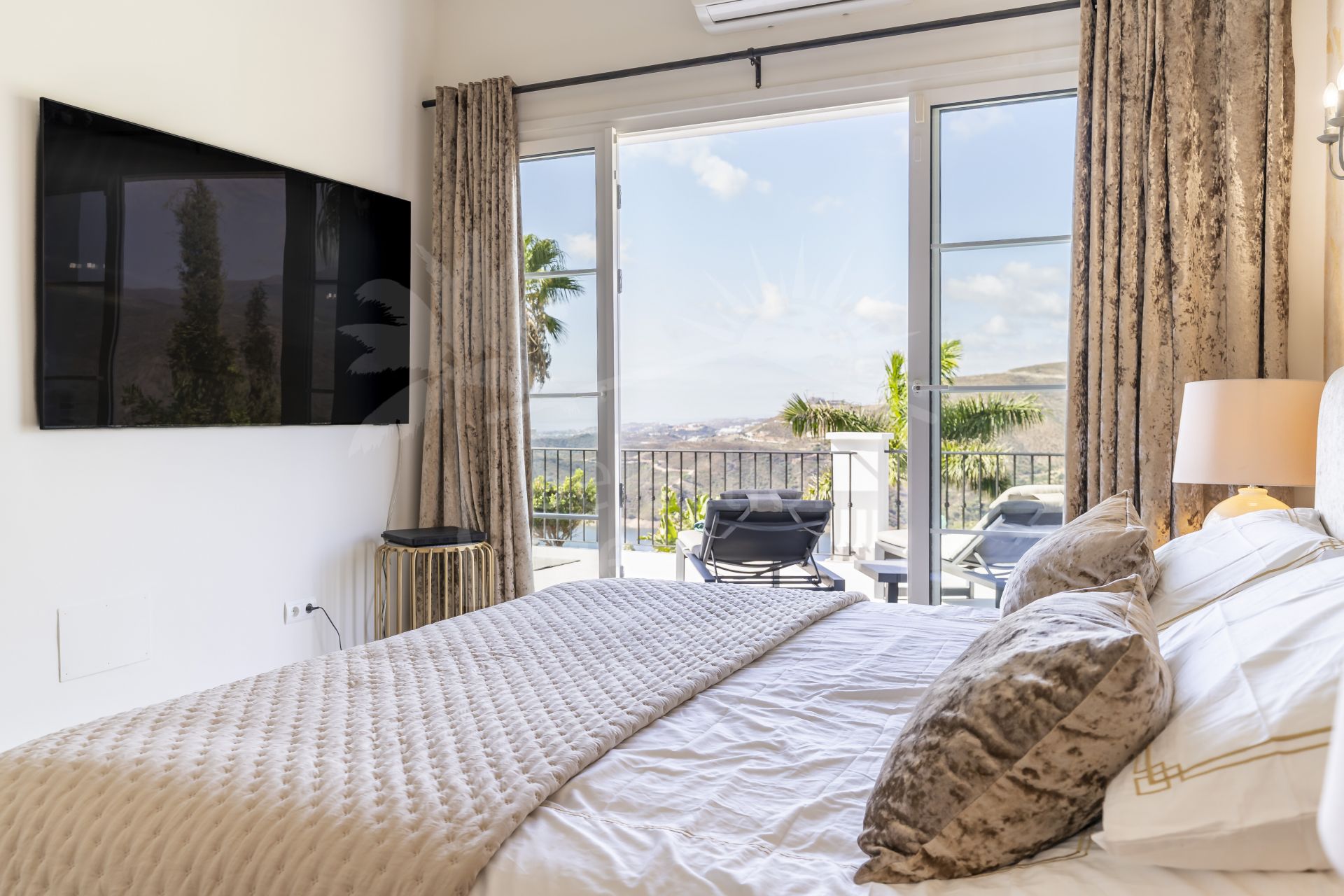 En la planta superior, el dormitorio principal se siente como un refugio privado. Grandes ventanales llenan la estancia de luz natural y enmarcan las vistas al mar y la montaña. Hay acceso directo a una amplia terraza, un elegante vestidor y un luminoso baño en suite, todo diseñado para el confort y la tranquilidad.