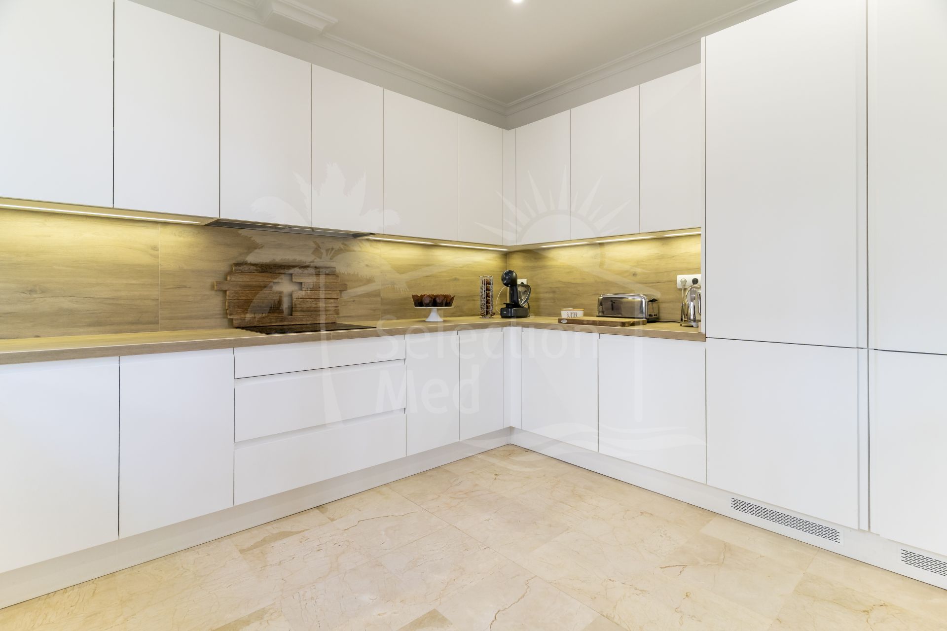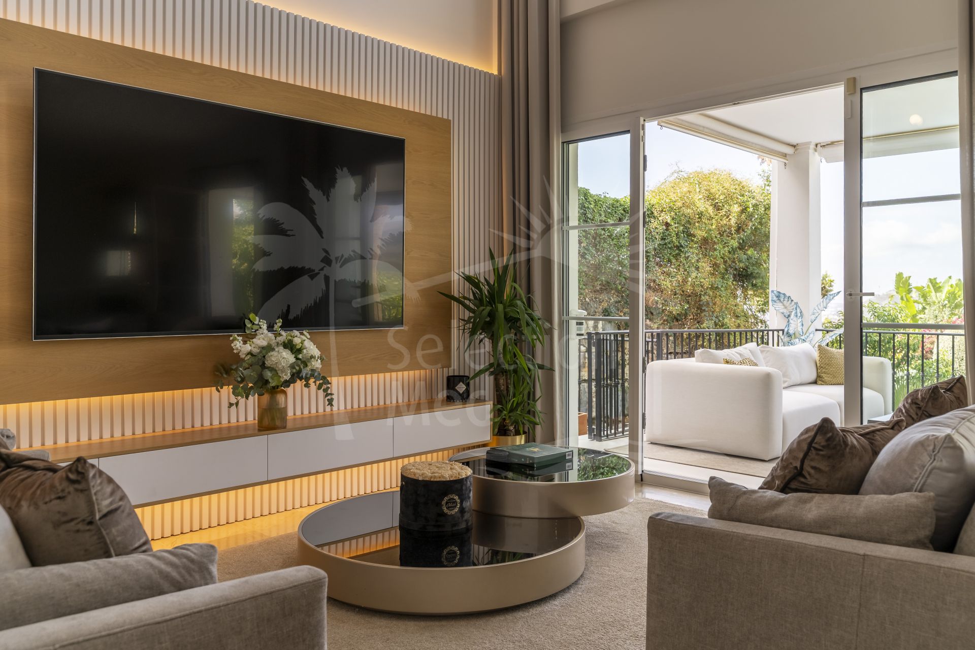 La zona principal de estar cuenta con un acogedor salón, comedor y una cocina recién renovada. Las amplias puertas de cristal se abren a la terraza, creando una conexión perfecta entre el interior y el exterior. La terraza, de generosas dimensiones, disfruta de impresionantes vistas al jardín, la zona de la piscina, el lago y el mar, un entorno ideal para comer al aire libre, recibir invitados o simplemente relajarse bajo el sol.