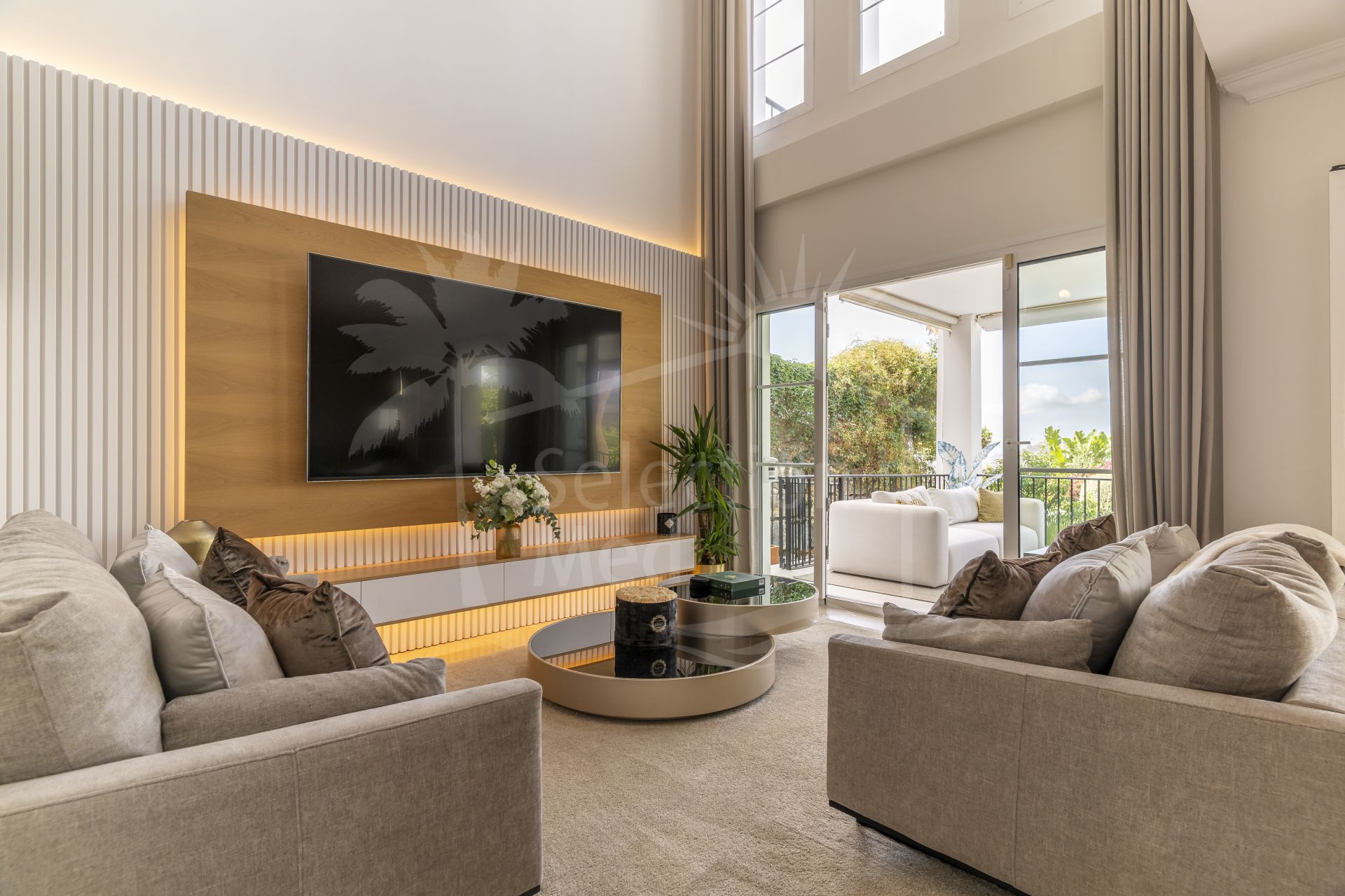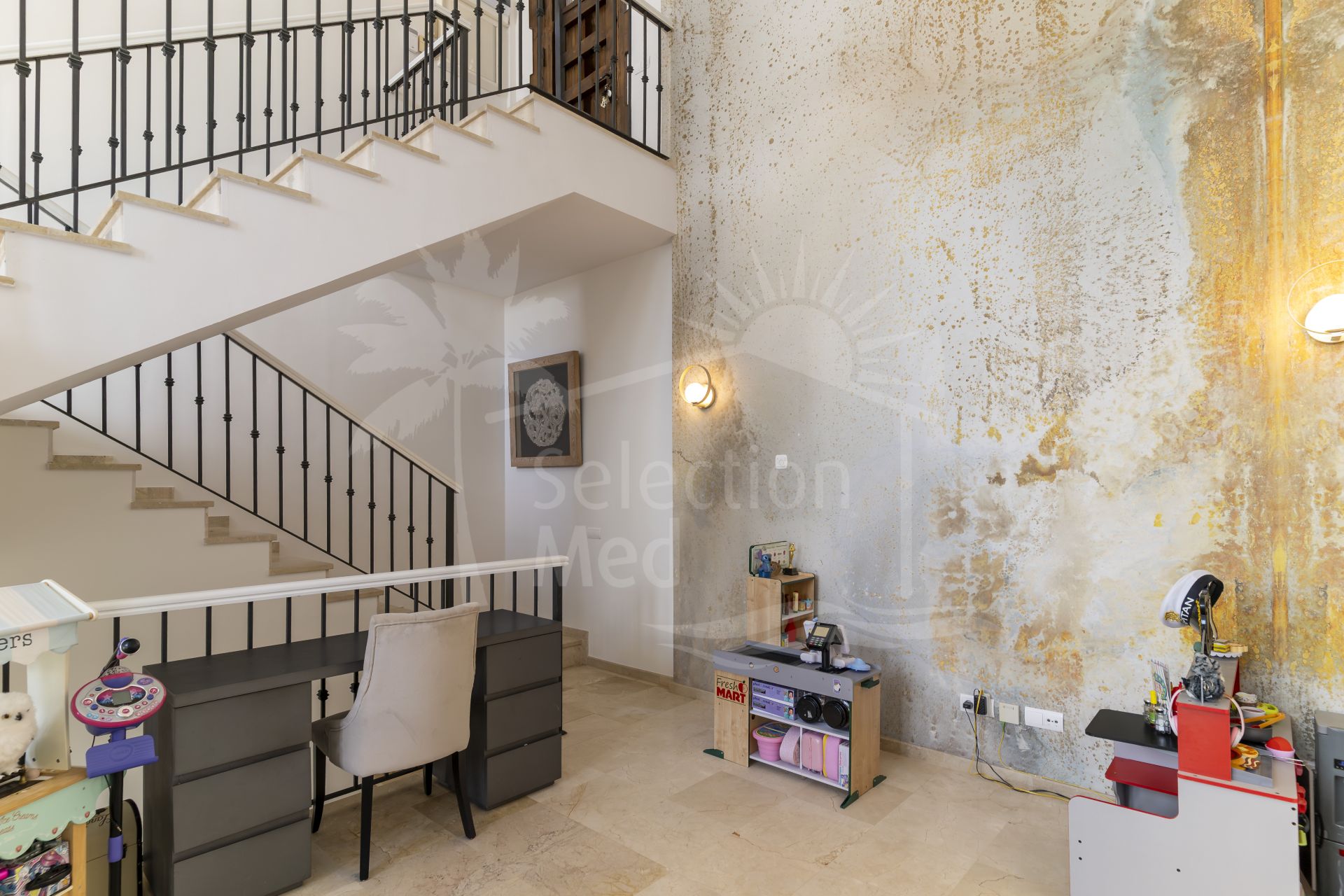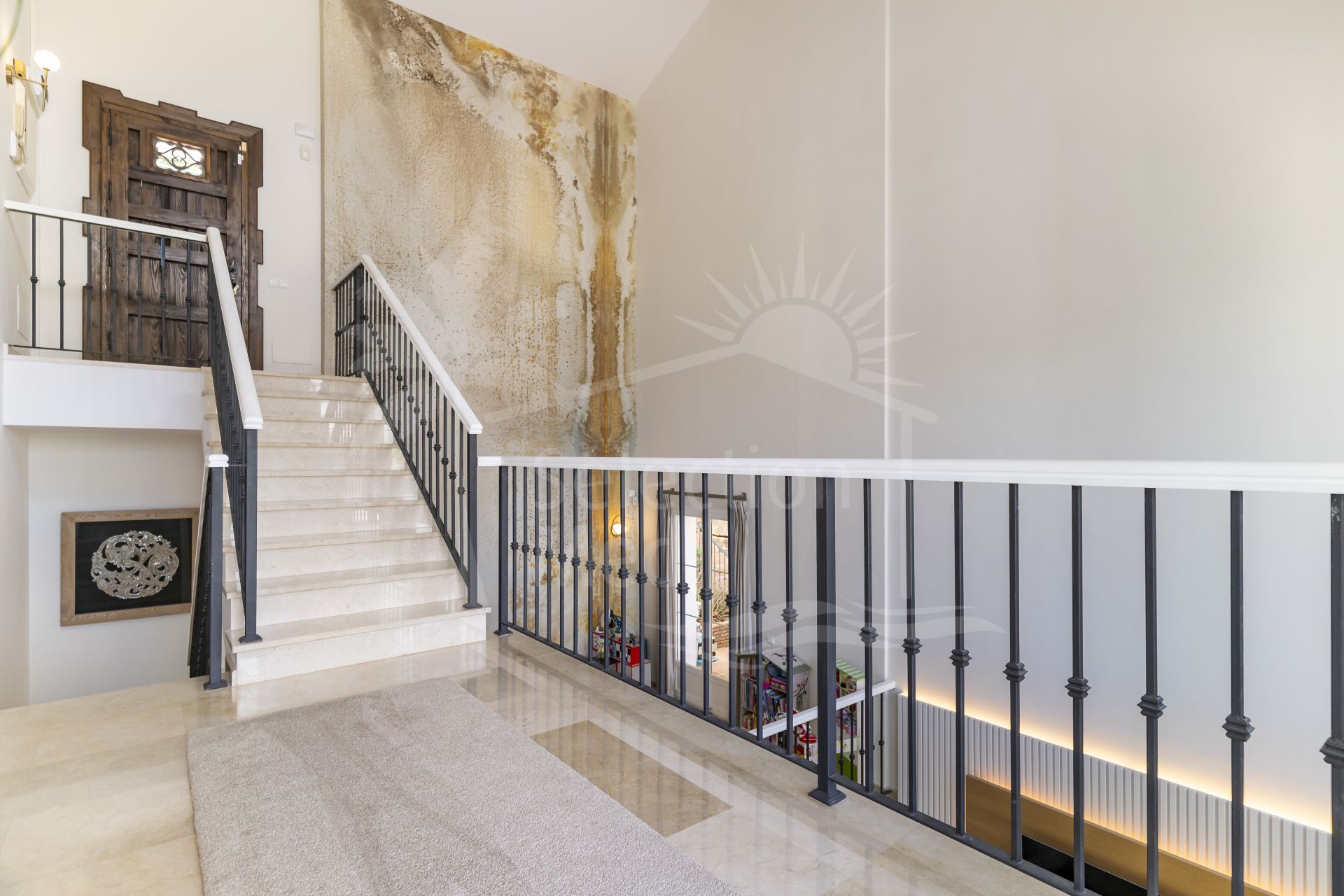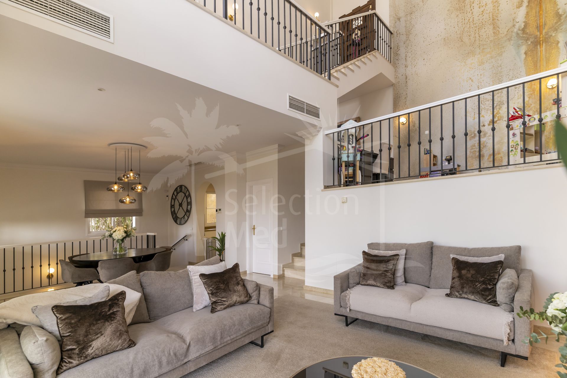 Unos escalones más abajo, el entresuelo ofrece una zona de estar tranquila con vistas al salón inferior. Desde aquí, se puede admirar la impresionante altura del techo y el flujo arquitectónico que hacen que esta vivienda sea tan distintiva.