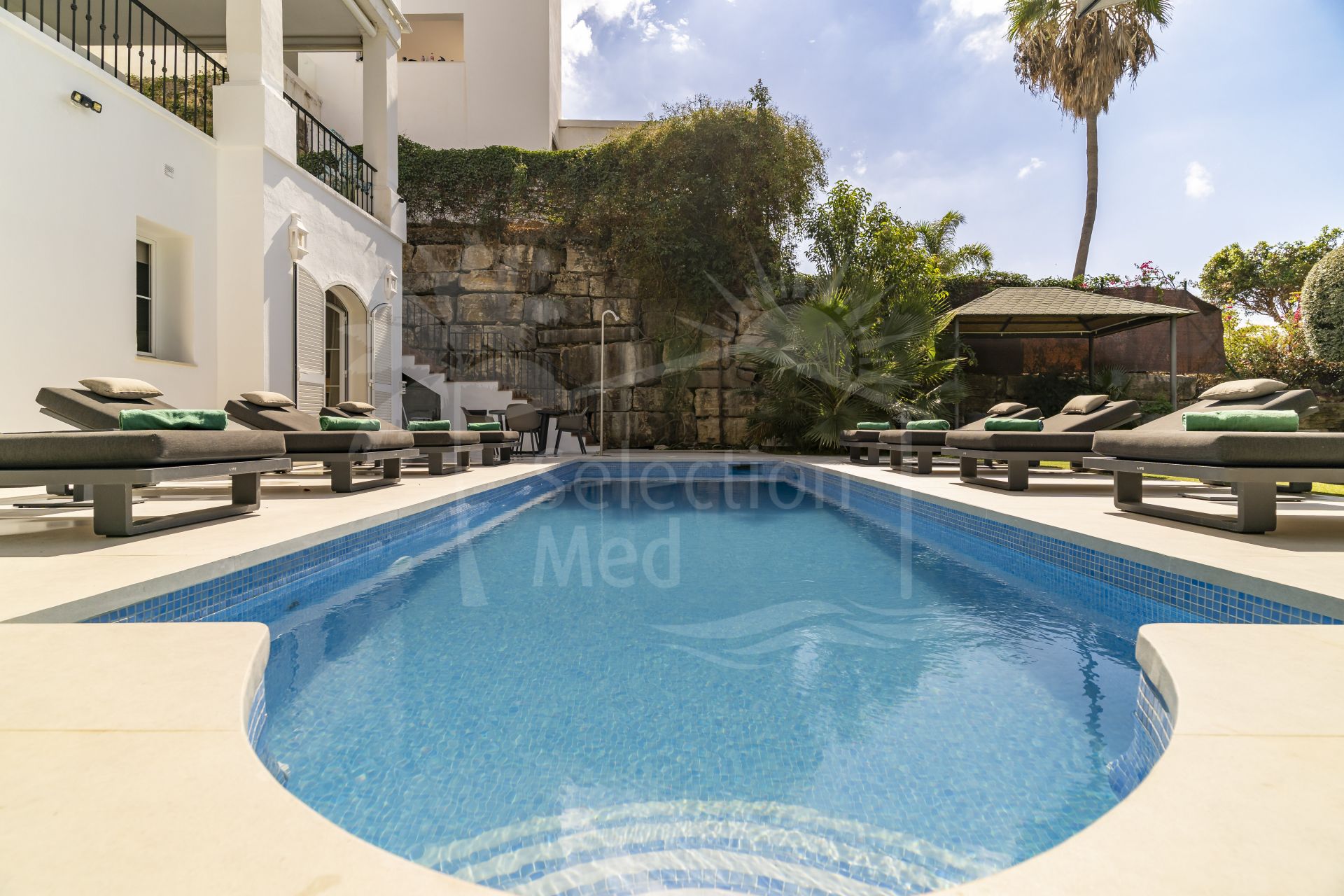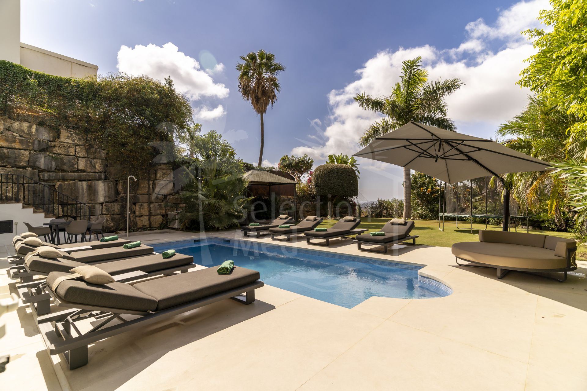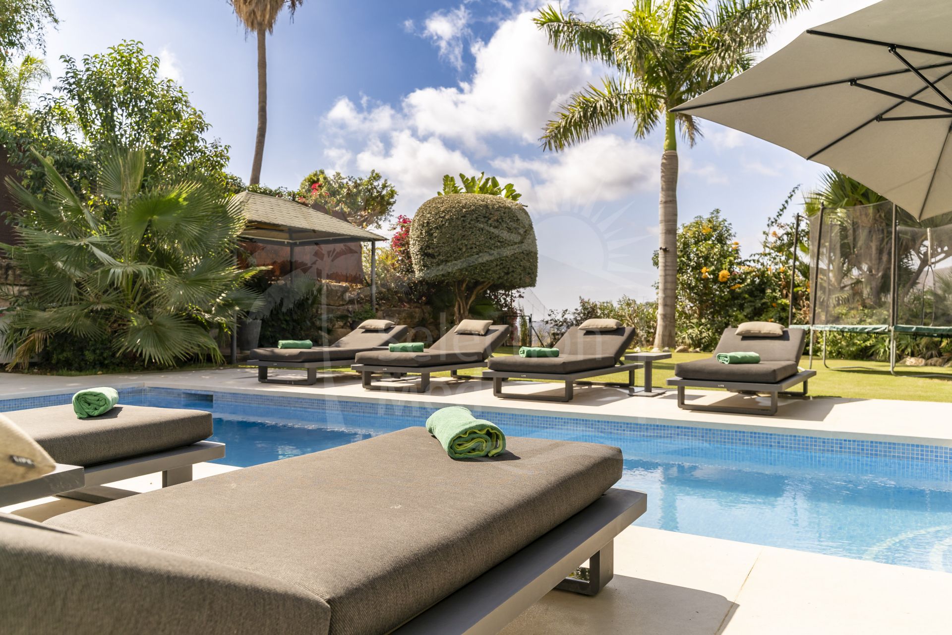 Zona exterior: El jardín privado ofrece múltiples rincones para relajarse y disfrutar de las vistas. La gran piscina se sitúa en el corazón del espacio exterior, rodeada de amplias zonas para tumbonas y áreas de sombra, perfectas para tardes tranquilas o para recibir invitados.
