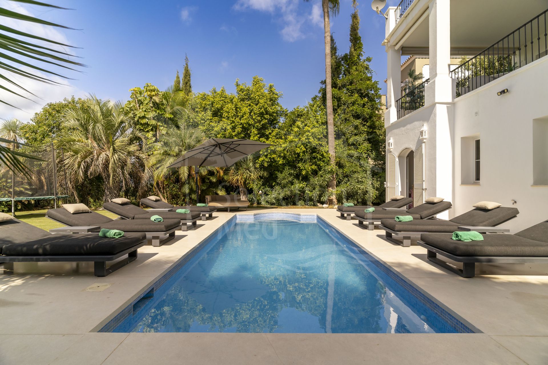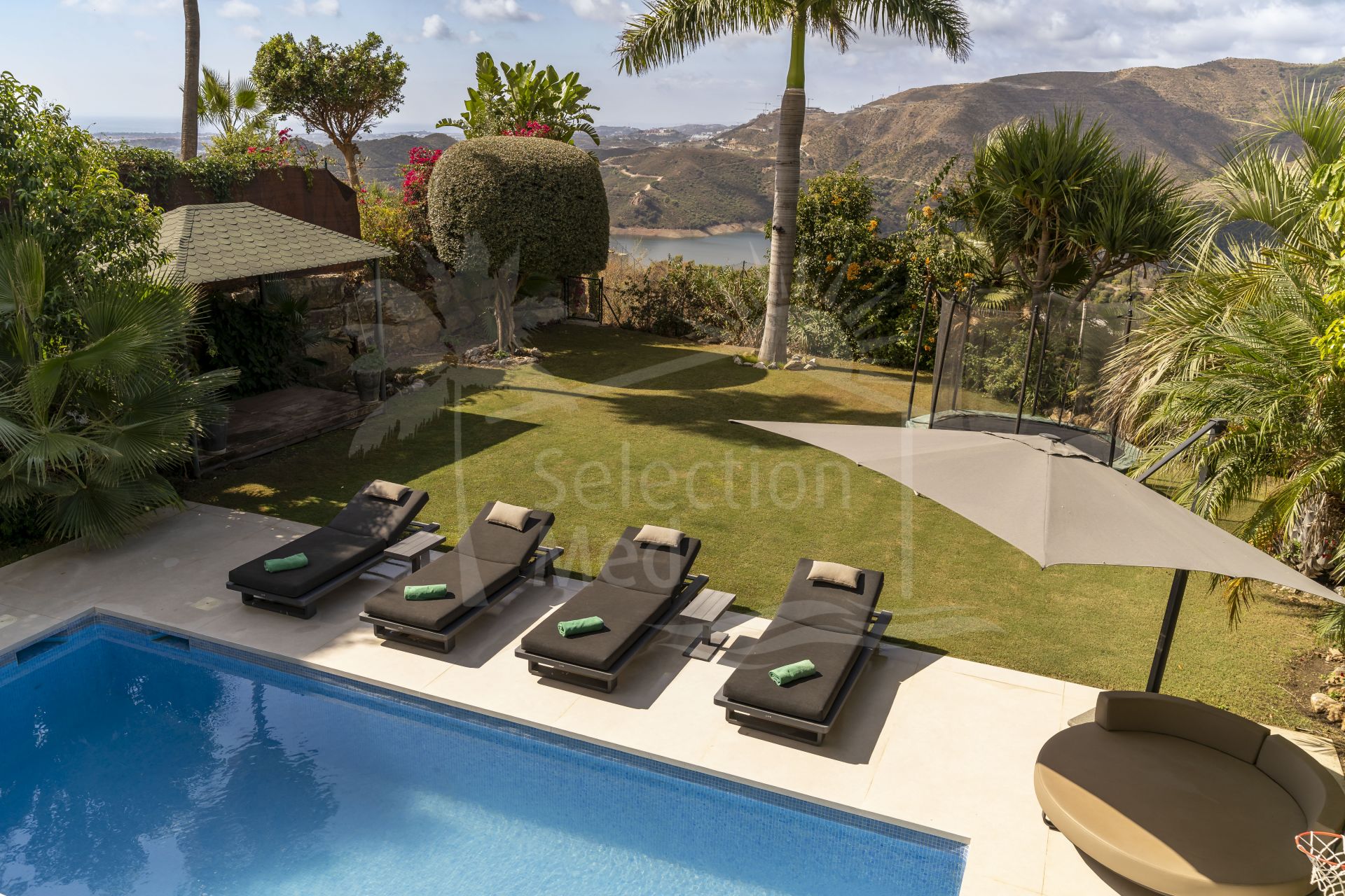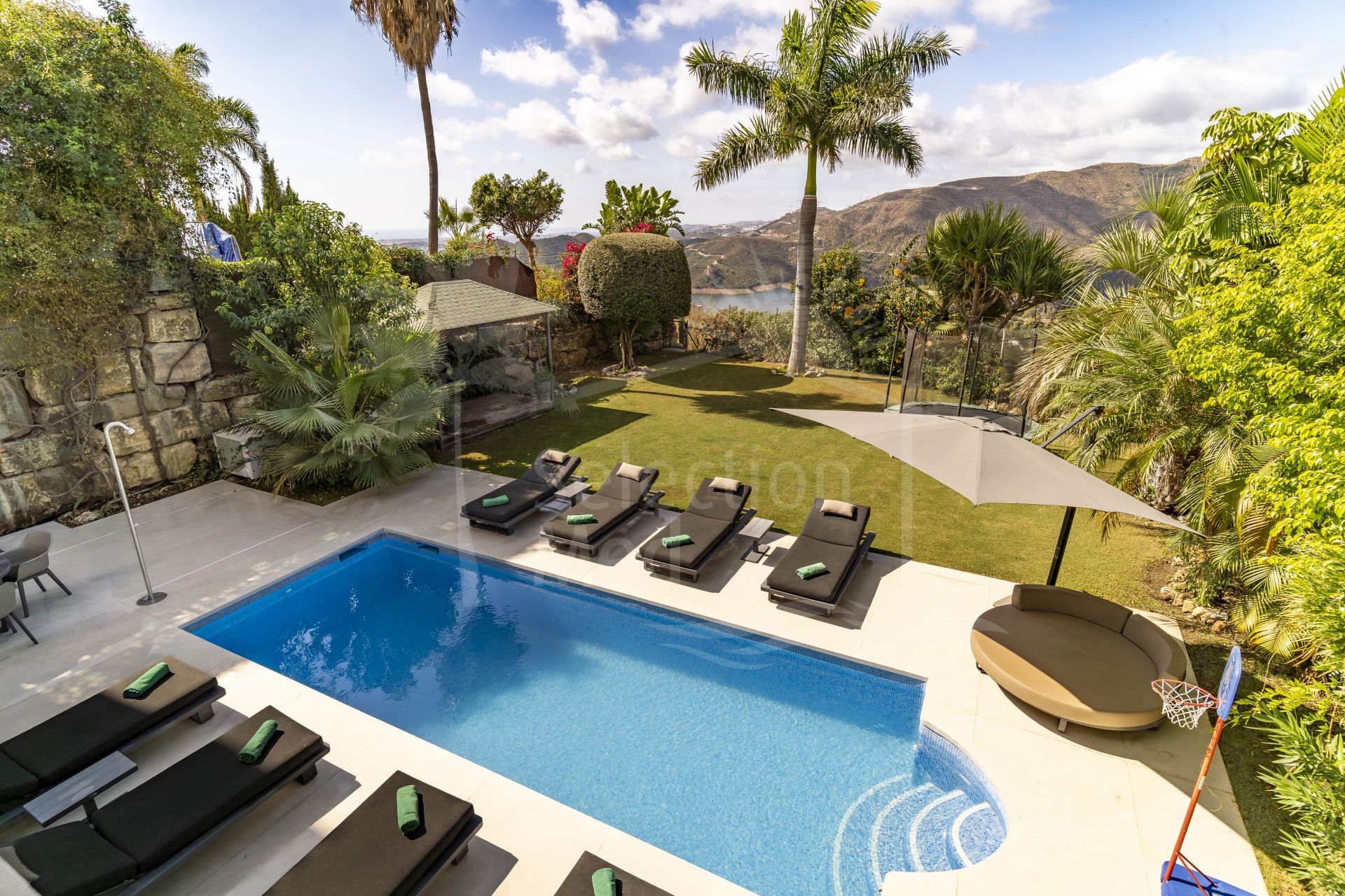 Zona exterior: El jardín privado ofrece múltiples rincones para relajarse y disfrutar de las vistas. La gran piscina se sitúa en el corazón del espacio exterior, rodeada de amplias zonas para tumbonas y áreas de sombra, perfectas para tardes tranquilas o para recibir invitados.