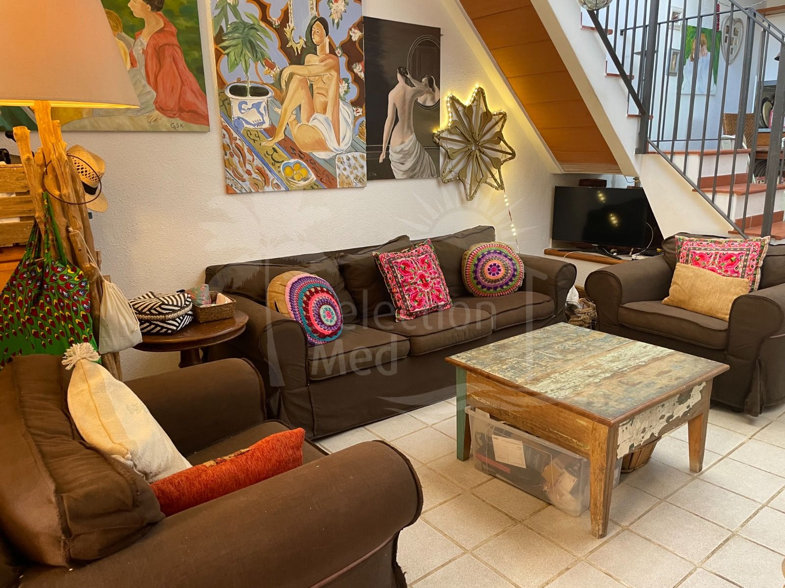 Una pequeña terraza en la zona de entrada conduce al apartamento luminoso con su acogedor salón. La altura del techo es un buen 5 metros en la zona frontal con grandes ventanas. La escalera conduce a una gran terraza al aire libre.