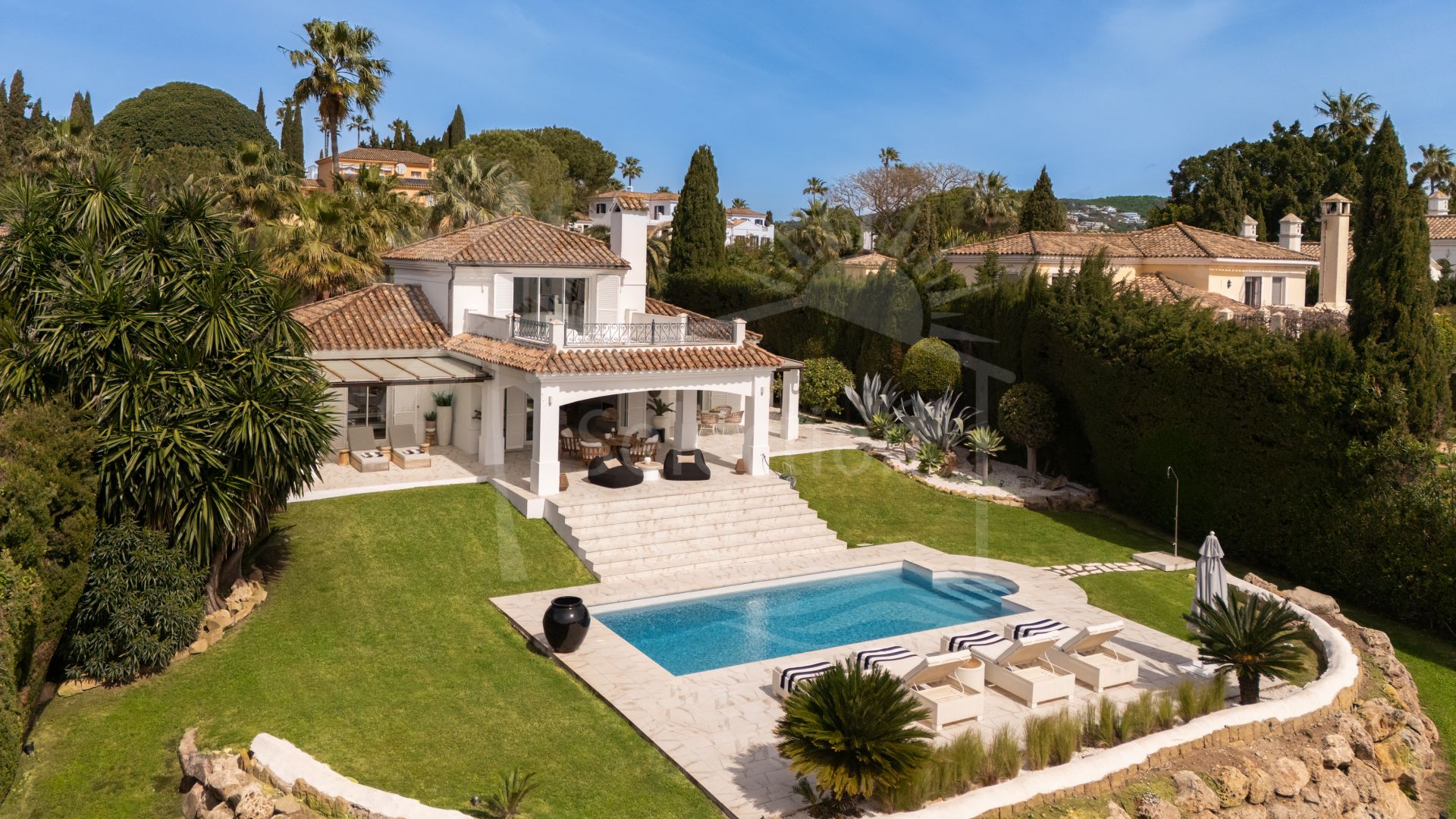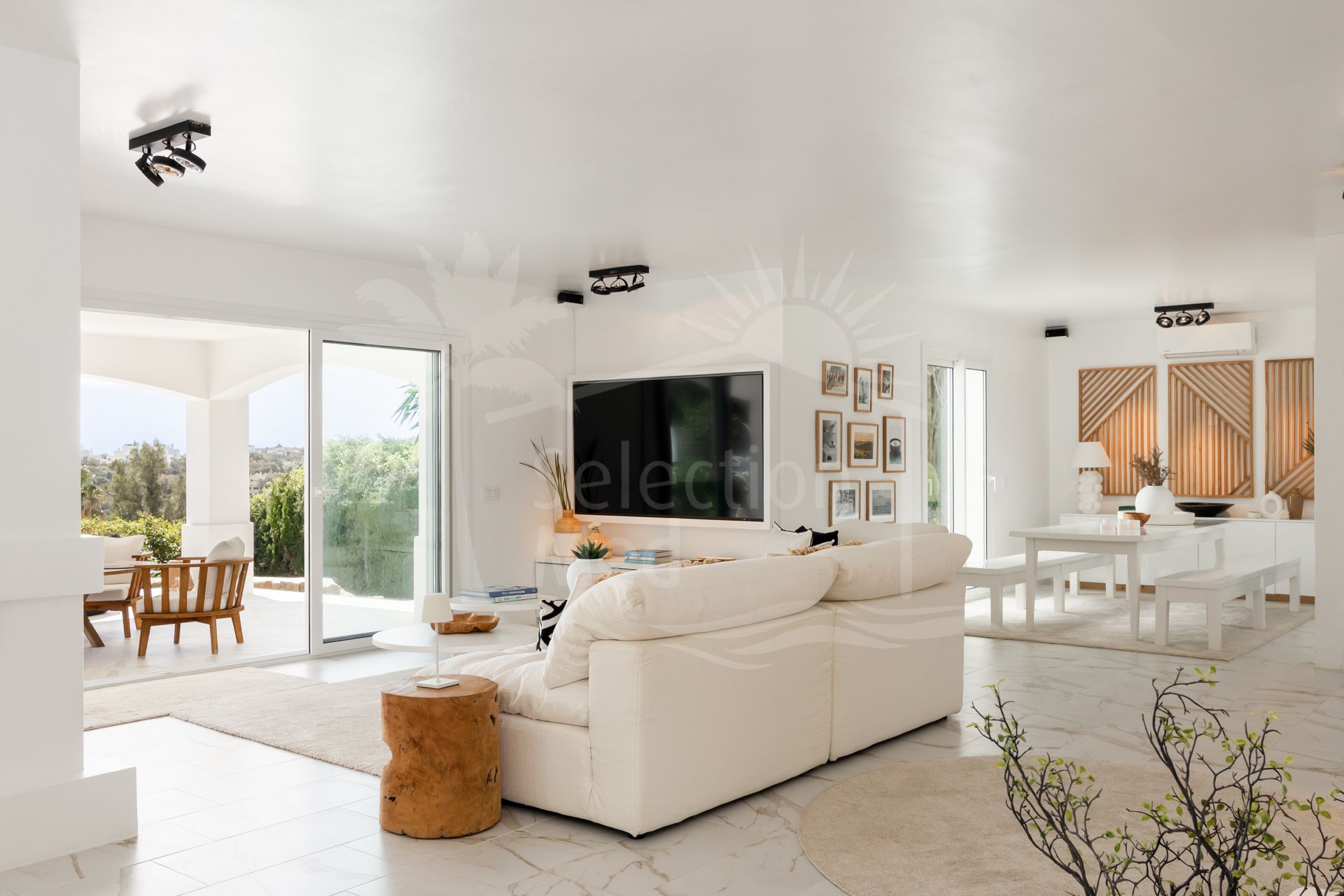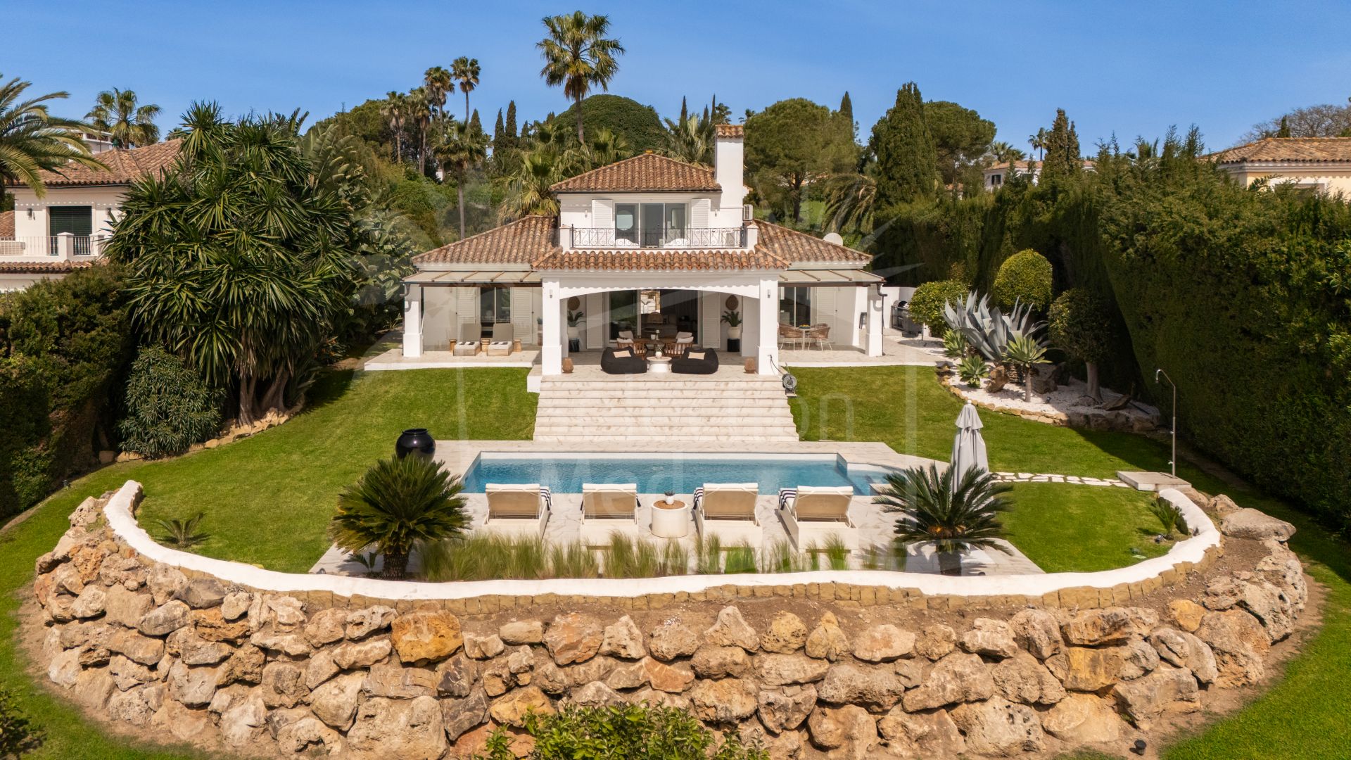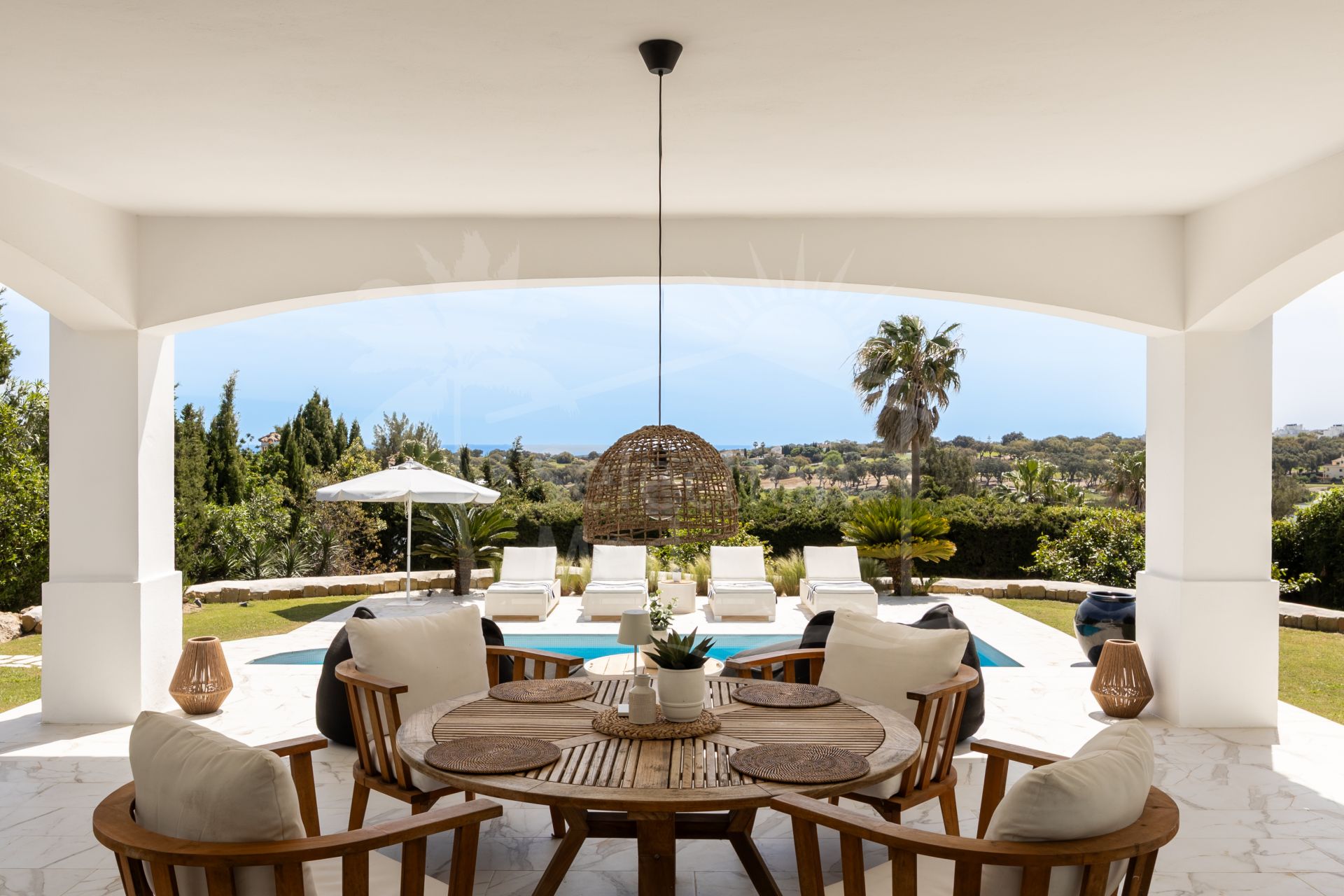 Una hermosa vivienda familiar andaluza completamente renovada, con una elegancia tranquila y discreta, Casa Serena disfruta de vistas abiertas al mar orientadas al sur desde el momento en que se cruza la entrada. La planta principal está diseñada para una vida fluida entre interior y exterior, con una cocina de concepto abierto, comedor y sala de estar que se integran directamente con una amplia terraza cubierta. Desde aquí, las vistas se extienden sobre la piscina, el campo de golf y el Mediterráneo, creando un entorno ideal tanto para mañanas tranquilas como para reuniones relajadas.
