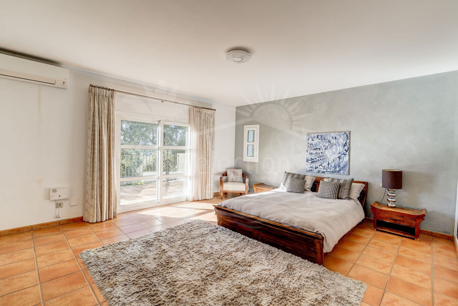 La villa cuenta con seis dormitorios: cuatro habitaciones principales amplias, un dormitorio en el sótano y una habitación adicional ligeramente más pequeña, ideal para invitados o personal.