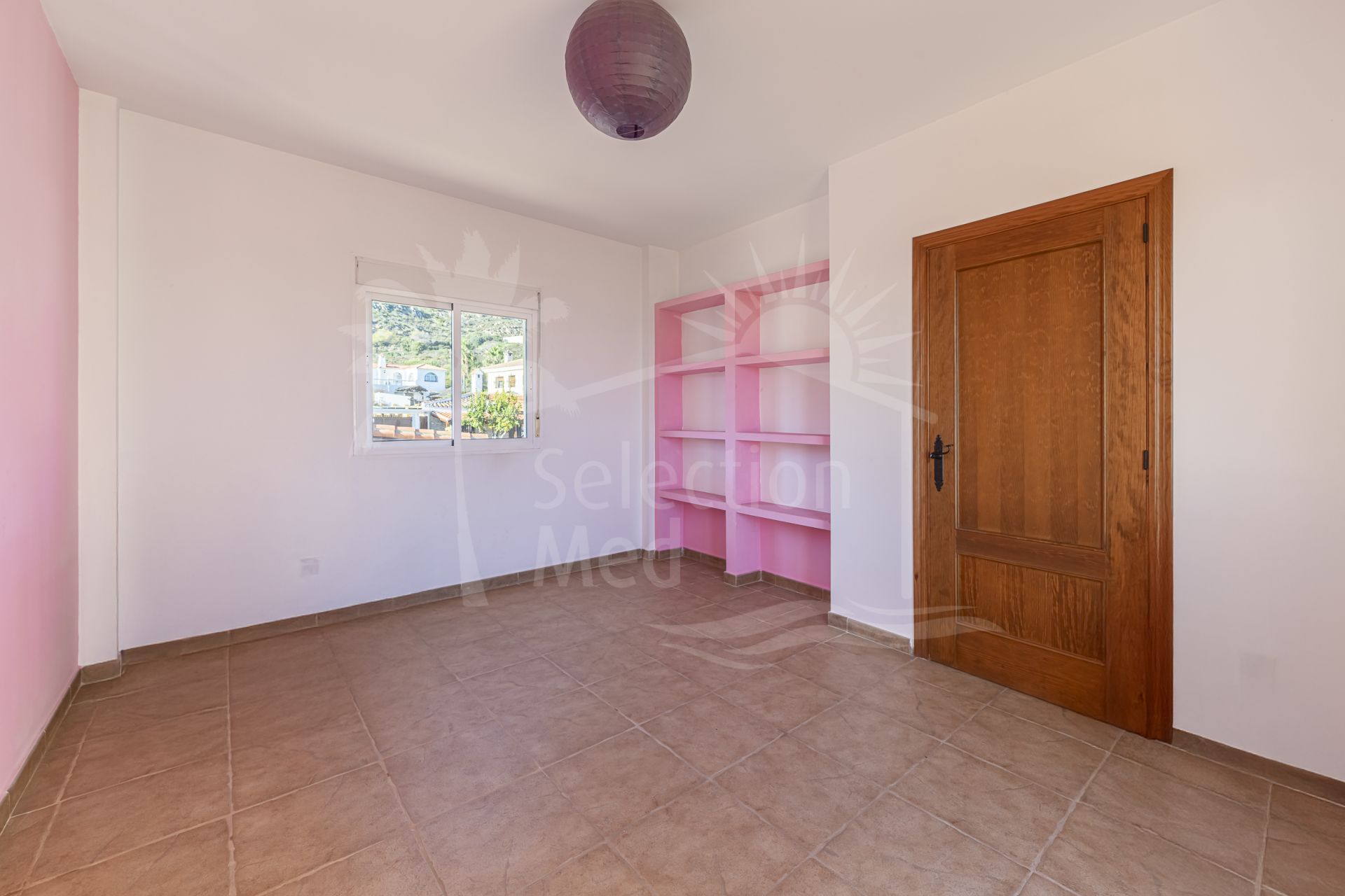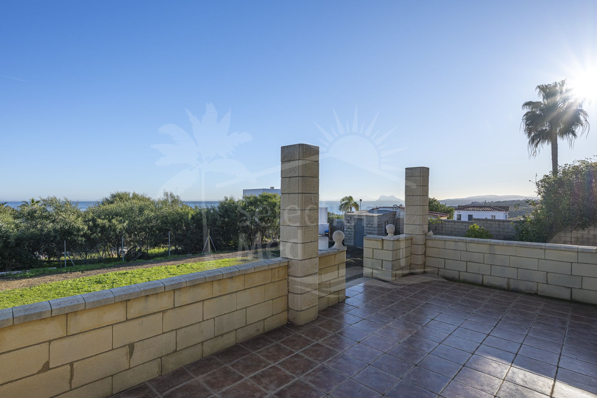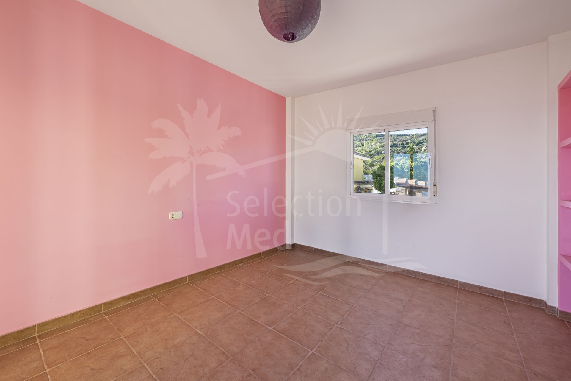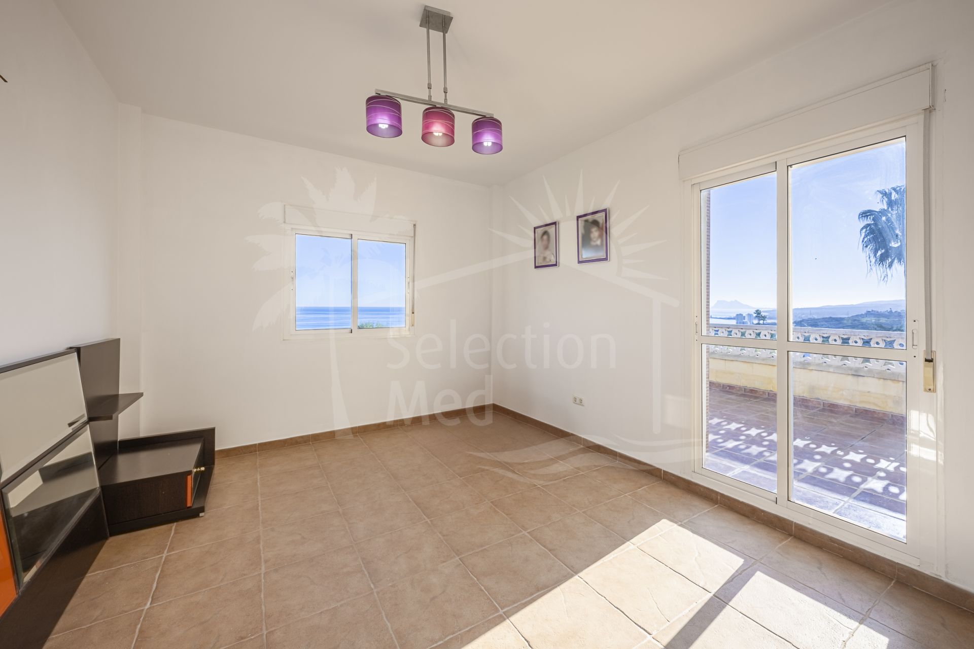 La planta superior alberga dos dormitorios de generosas dimensiones y una estancia adicional con gran versatilidad, que puede transformarse fácilmente en un segundo baño, despacho o dormitorio adicional. Desde ambos dormitorios se accede a un balcón que ofrece impresionantes vistas panorámicas al mar, la montaña, Gibraltar e incluso la costa africana, un privilegio visual difícil de encontrar.