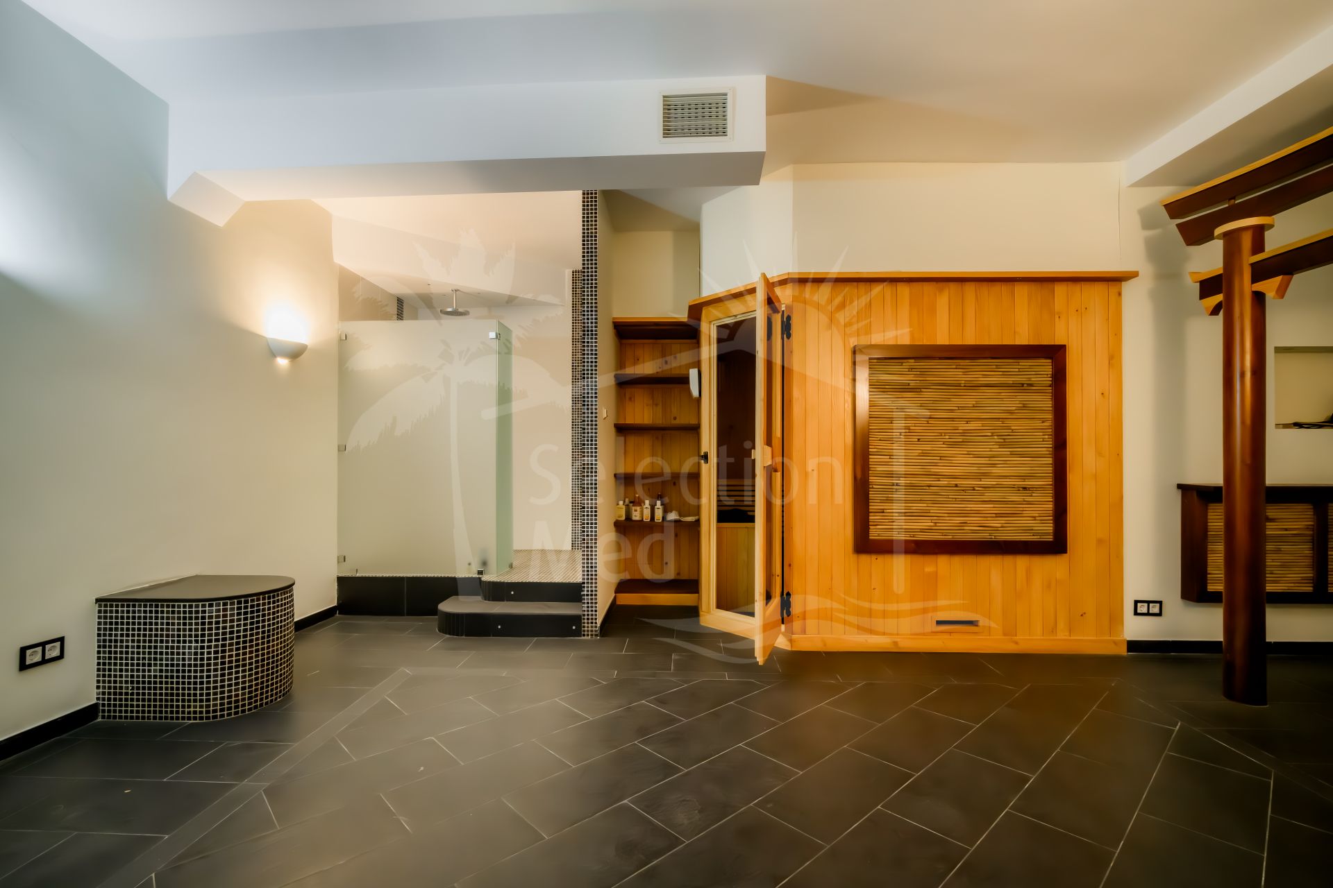 Nivel inferior: apartamento independiente para invitados o personal, zona de ocio, spa con sauna, bodega y garaje para dos coches. Este nivel permite múltiples posibilidades de personalización, como gimnasio, sala de cine o piscina cubierta.