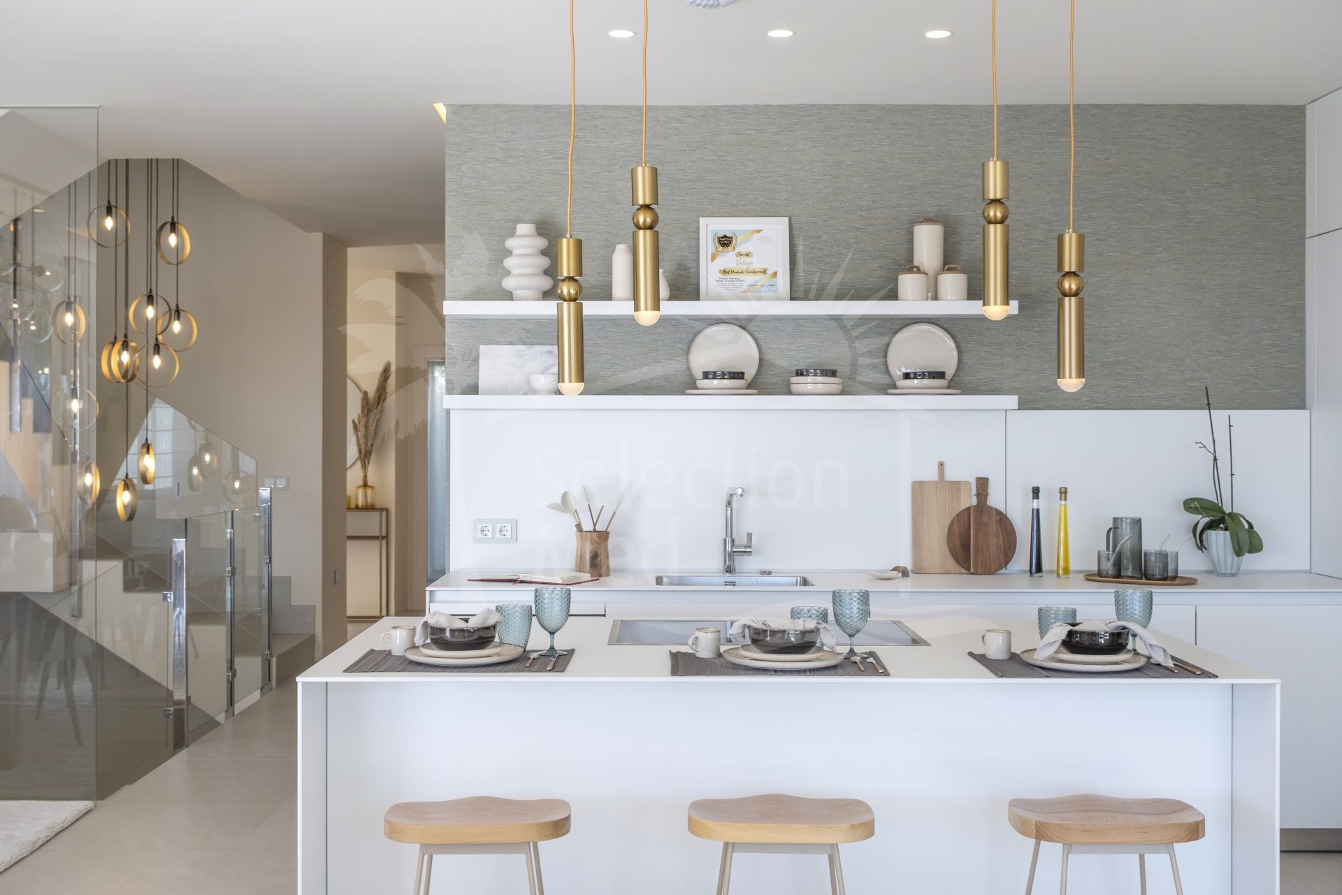 La zona de estar de planta abierta de la villa está diseñada para la relajación y el entretenimiento, con acabados elegantes, techos altos y grandes ventanas que permiten que la luz natural inunda el interior. El salón fluye perfectamente en el comedor y la cocina, creando un espacio armonioso ideal para reuniones familiares y eventos sociales.
