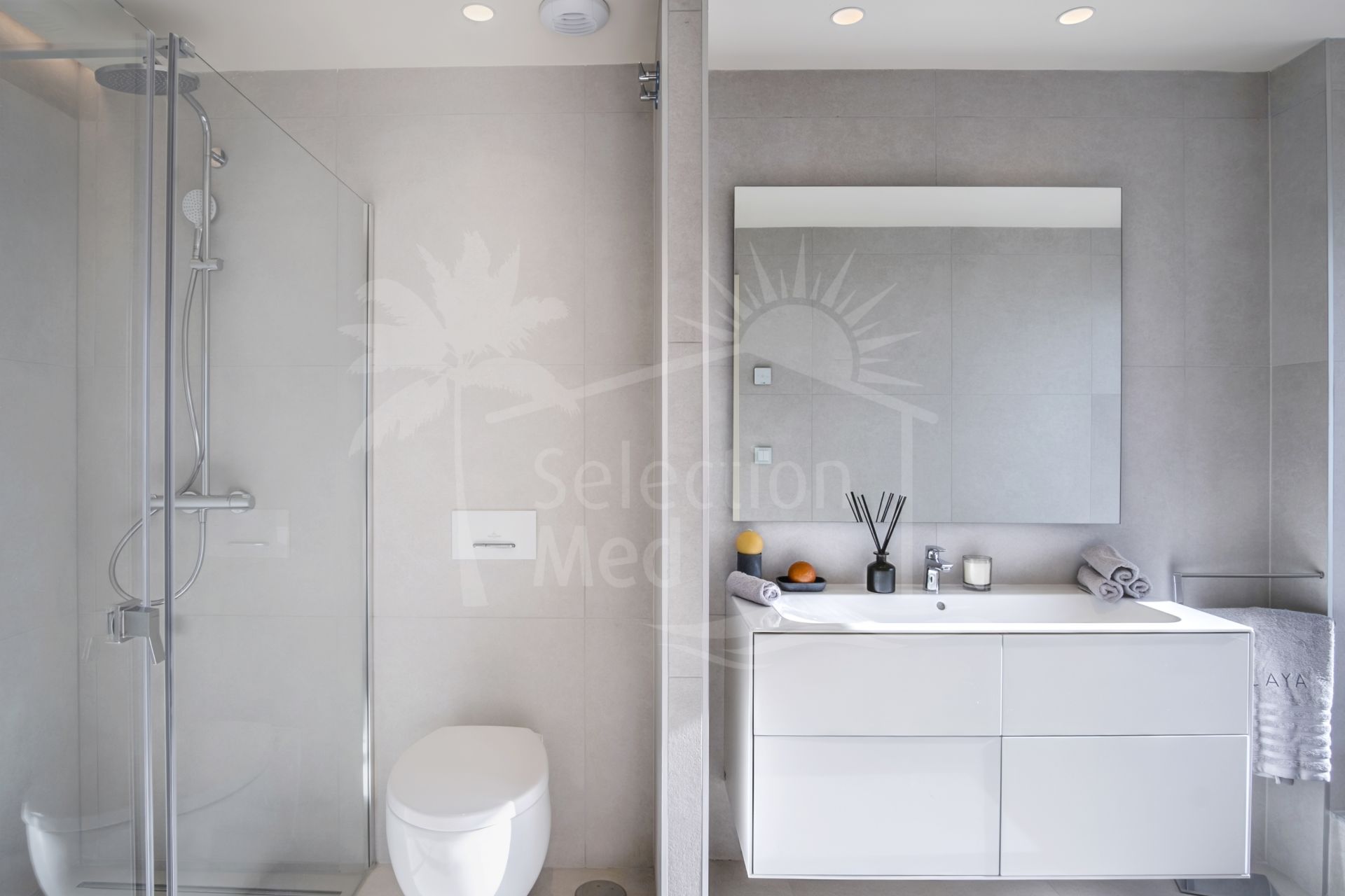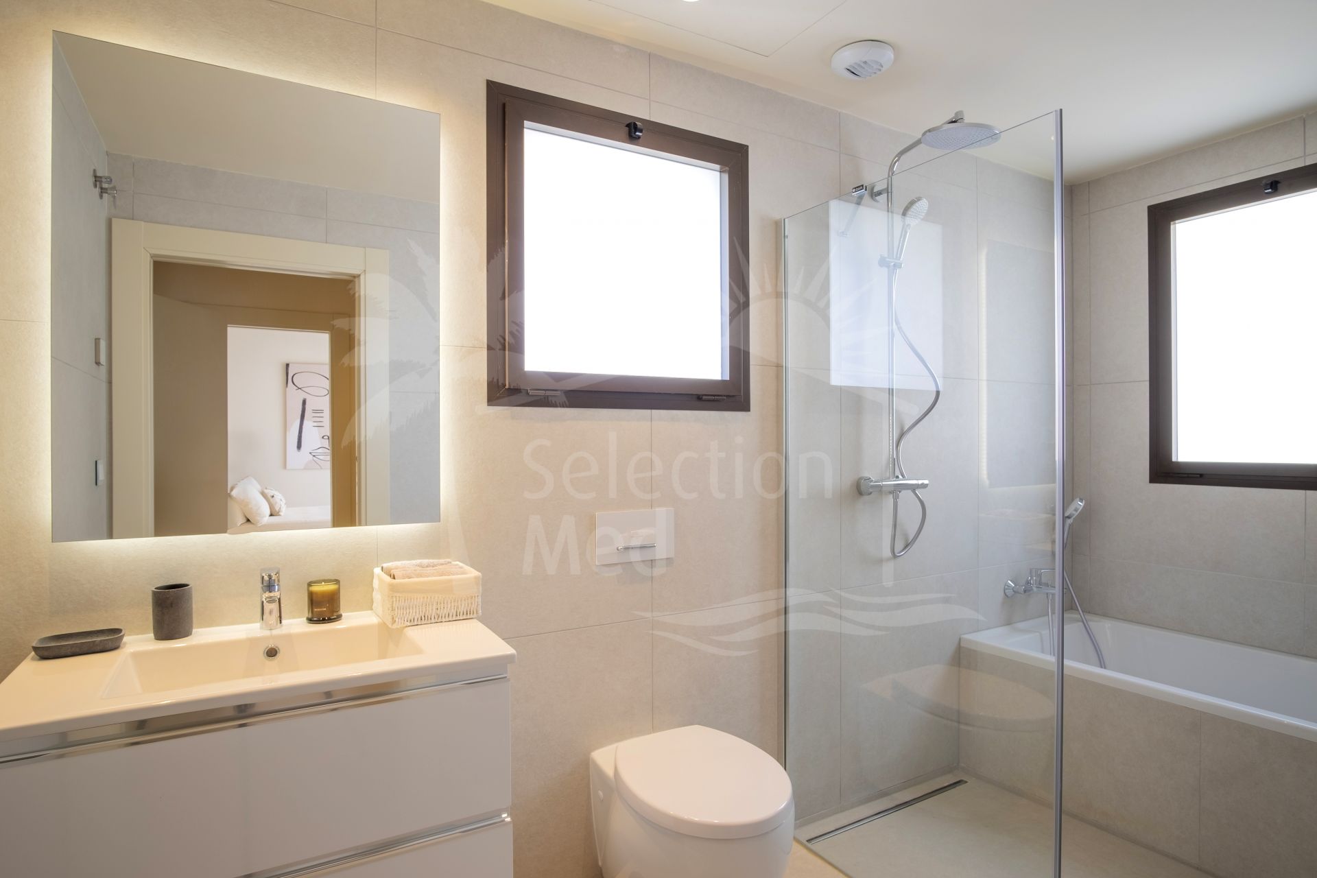 El dormitorio principal ofrece un retiro privado con un amplio baño en suite y zona de vestidor. Dos dormitorios adicionales comparten un baño, mientras que un cuarto dormitorio también incluye su propio en-suite. Todas las habitaciones están diseñadas con lujo en mente y ofrecen acceso directo a las terrazas, permitiendo a los residentes disfrutar de los espacios exteriores durante todo el año.