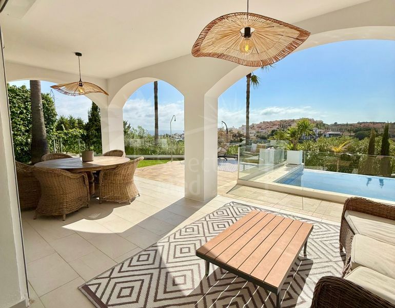 Elegante villa mediterránea que ha sido completamente reformada, ofreciendo vistas abiertas al mar y una piscina privada. La propiedad cuenta con tres dormitorios, una habitación adicional actualmente utilizada como guardería, y dos baños más un aseo de invitados. Incluye paneles...